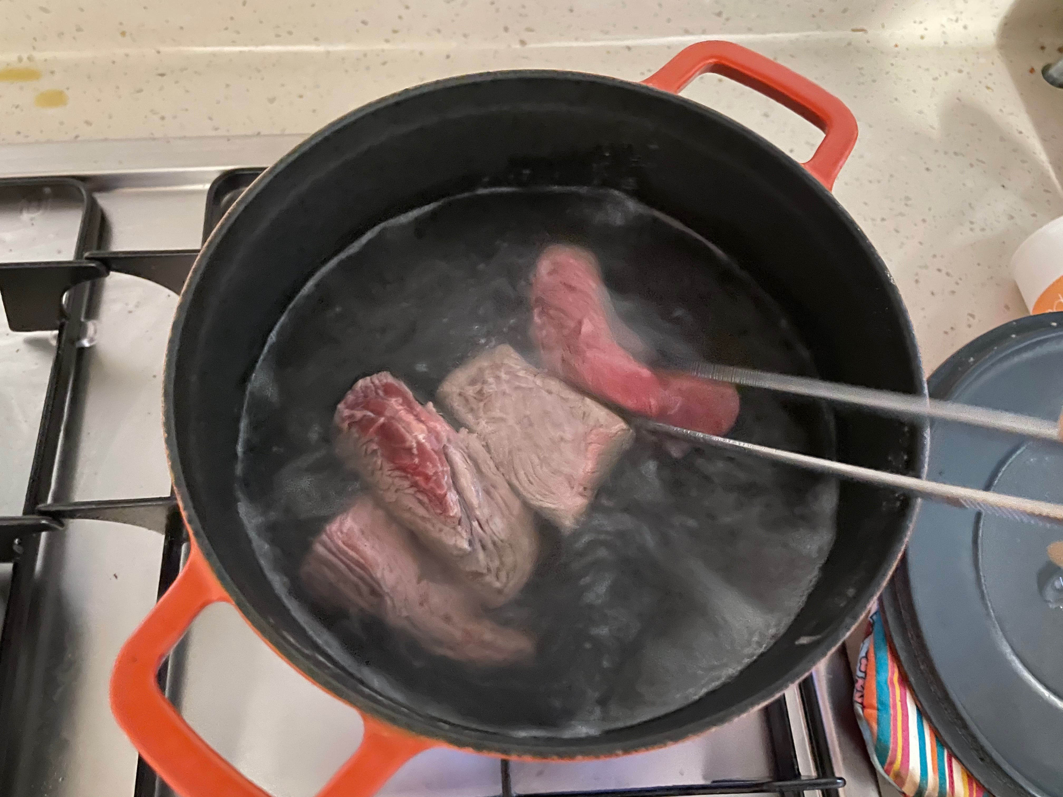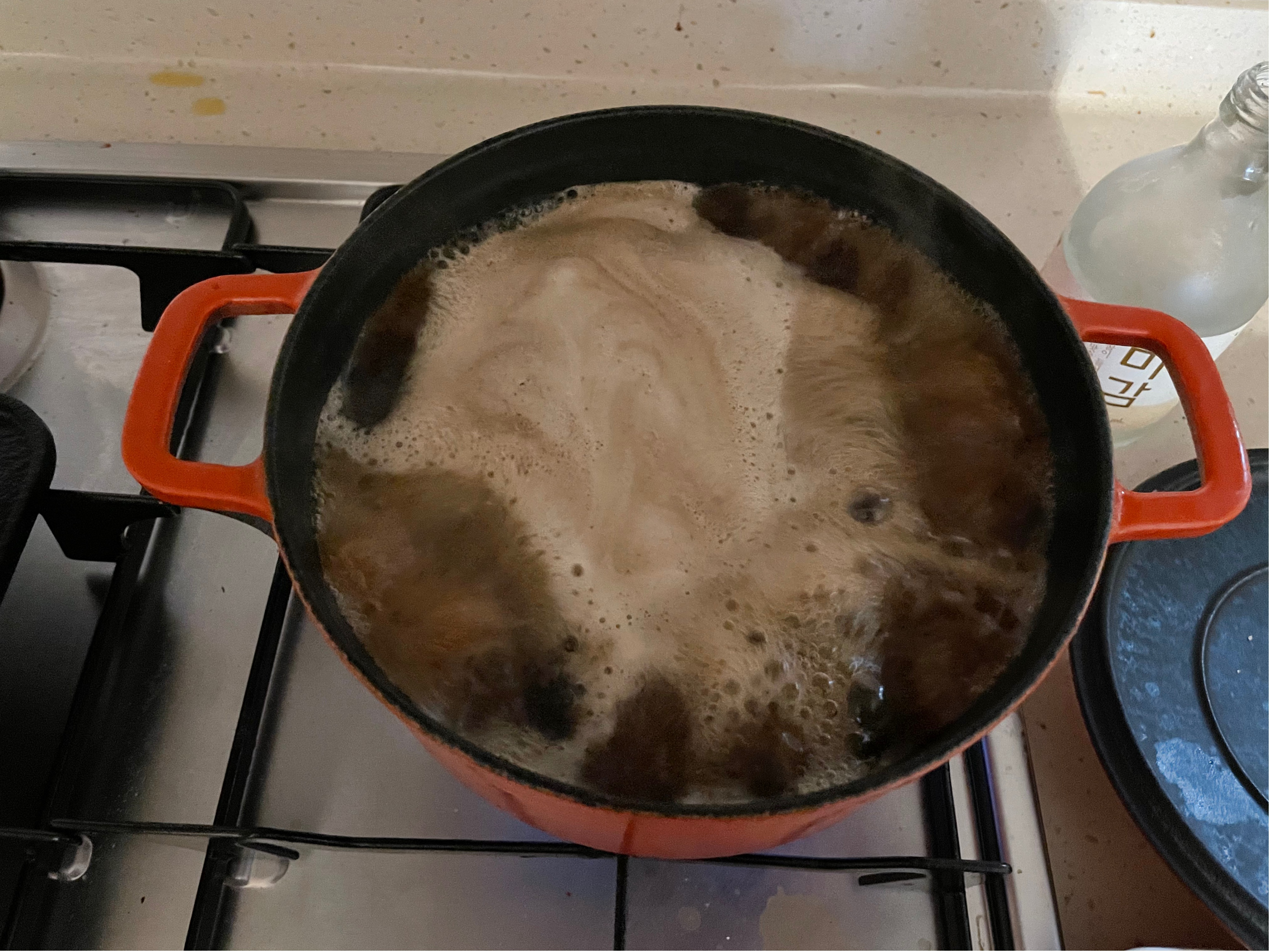 3. 삶은 육수는 거품을 걷어두고 따로 덜어둔다.