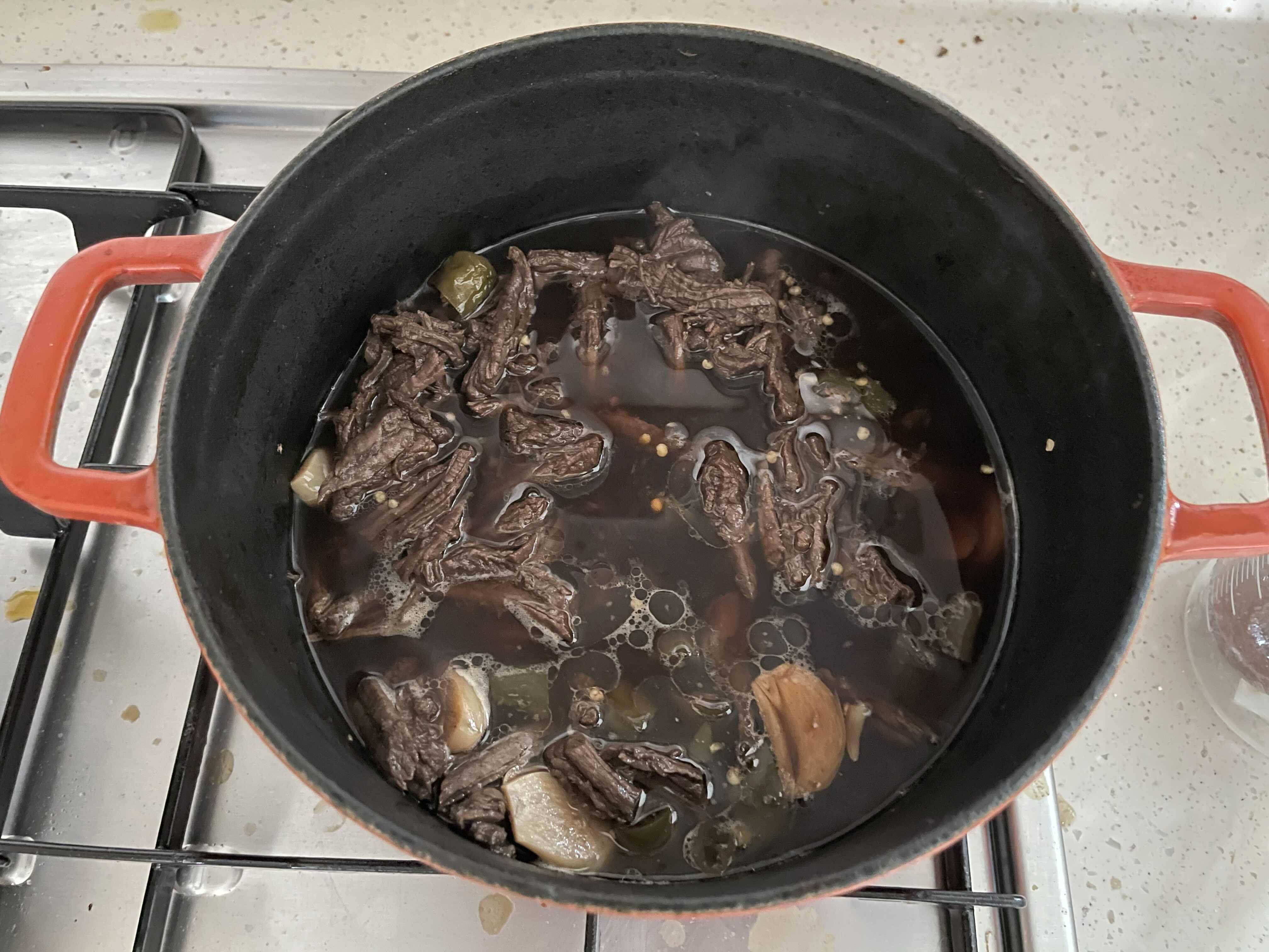 6. 다 익으면 썰어둔 마늘과 청양고추를 넣고, 고기를 잘게 찢어준다.