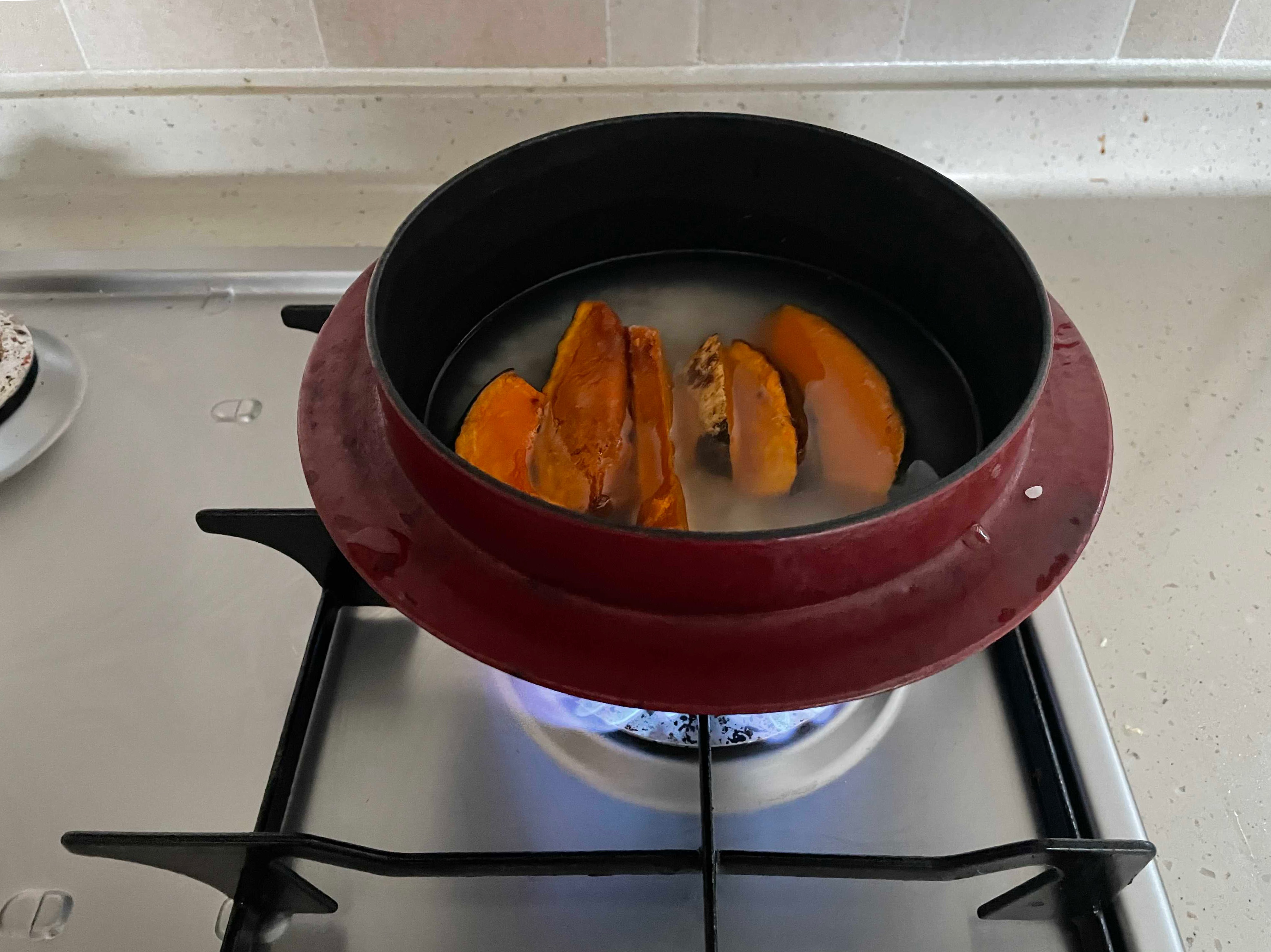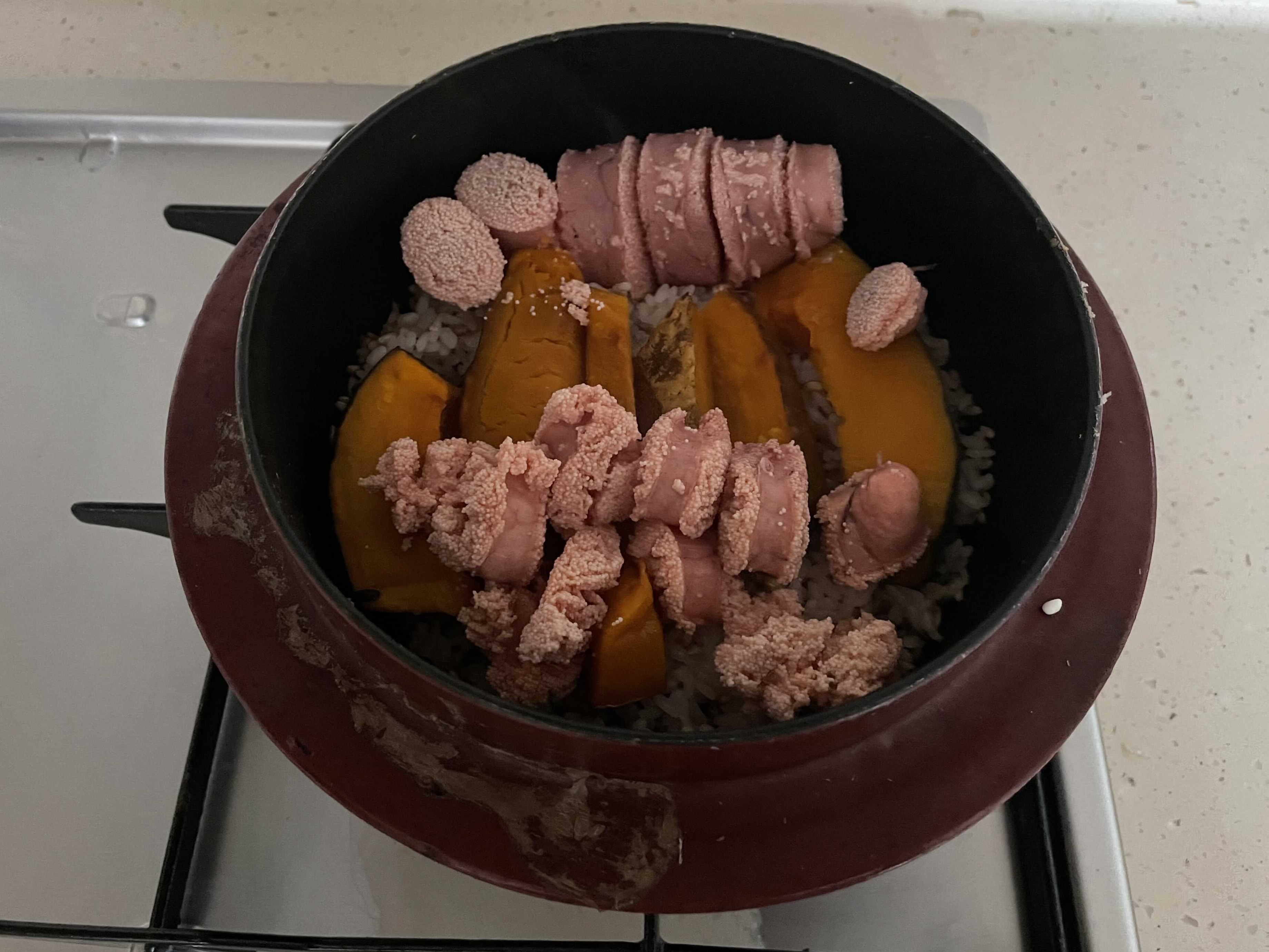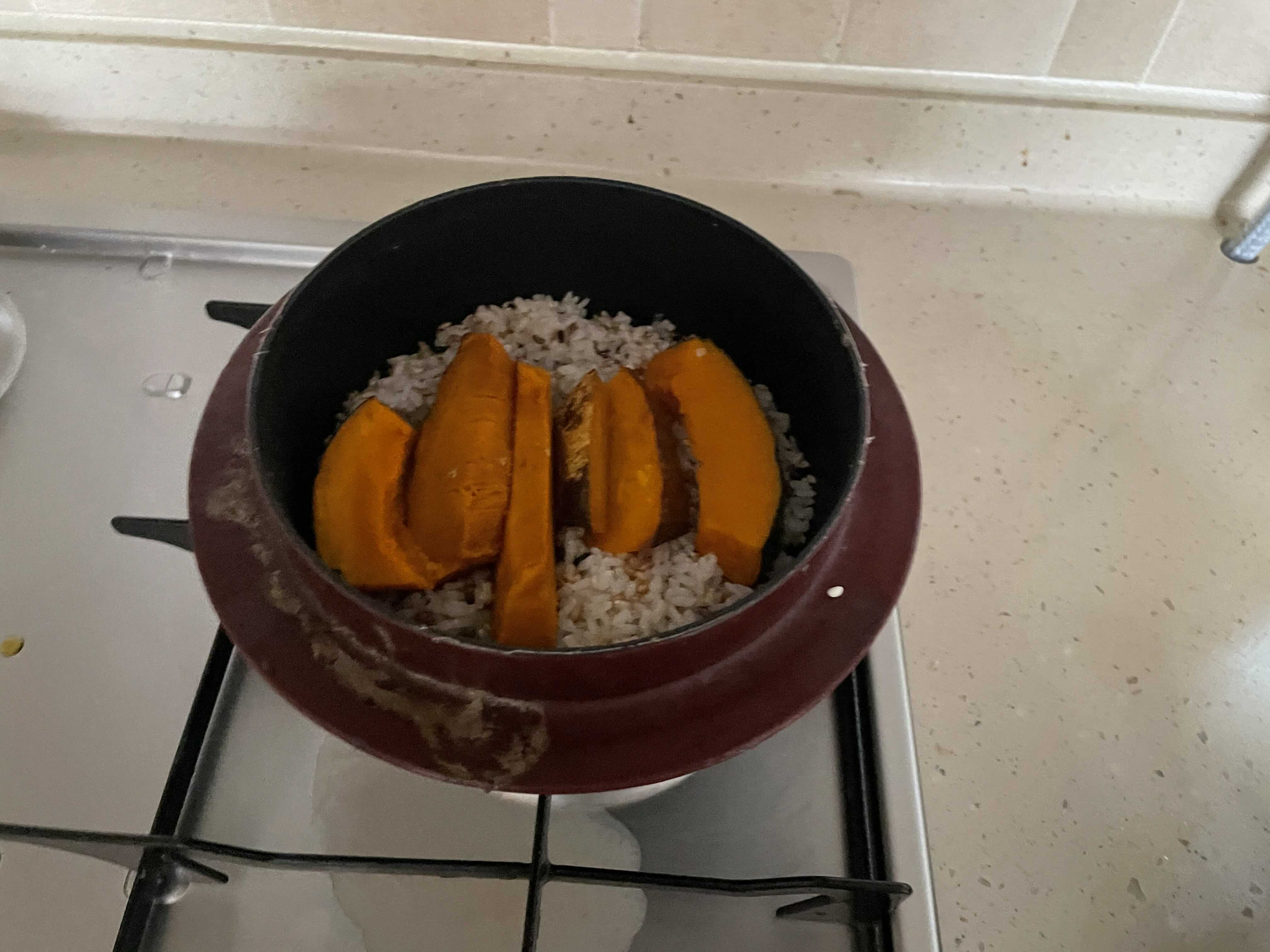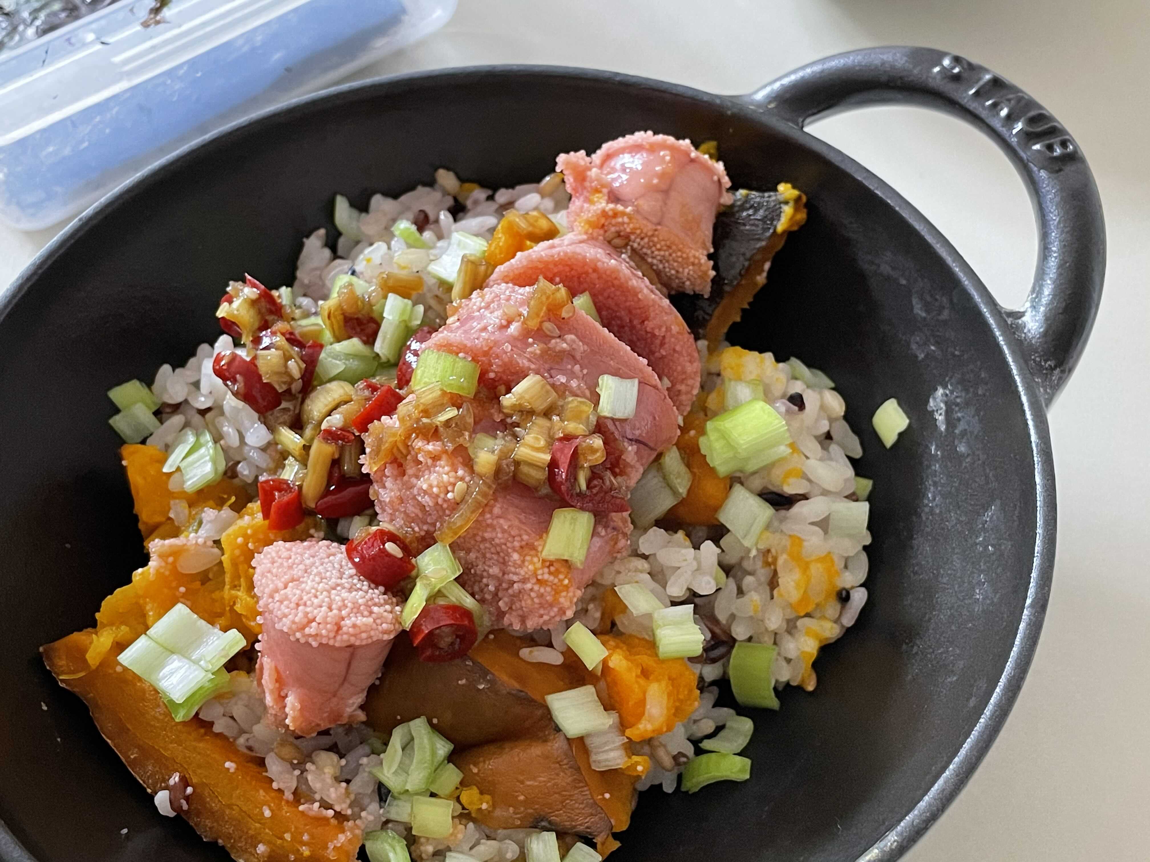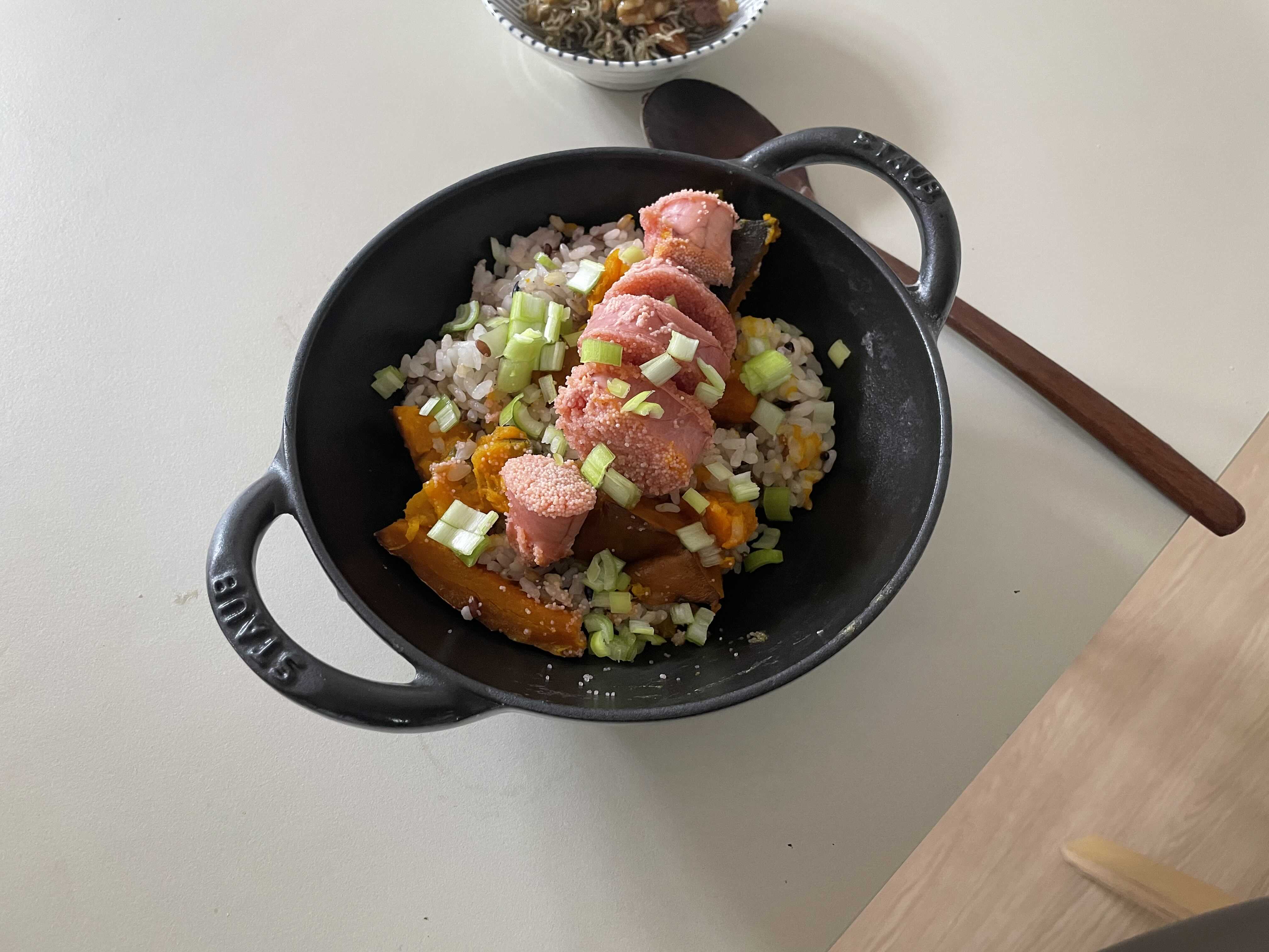 쌀을 불려서 단호박과 함께 밥을 짓고 명란은 남은 열기로 익혀주기만 하면된다. 생명란도 먹을 수 있기에 명란의 익힘정도는 원하는 대로, 완전 익은 명란을 먹으려면 10분정도로 뜸을 들이면 된다. 나는 5분을 뜸들였더니 안은 살짝 덜익혀진 상태였다.