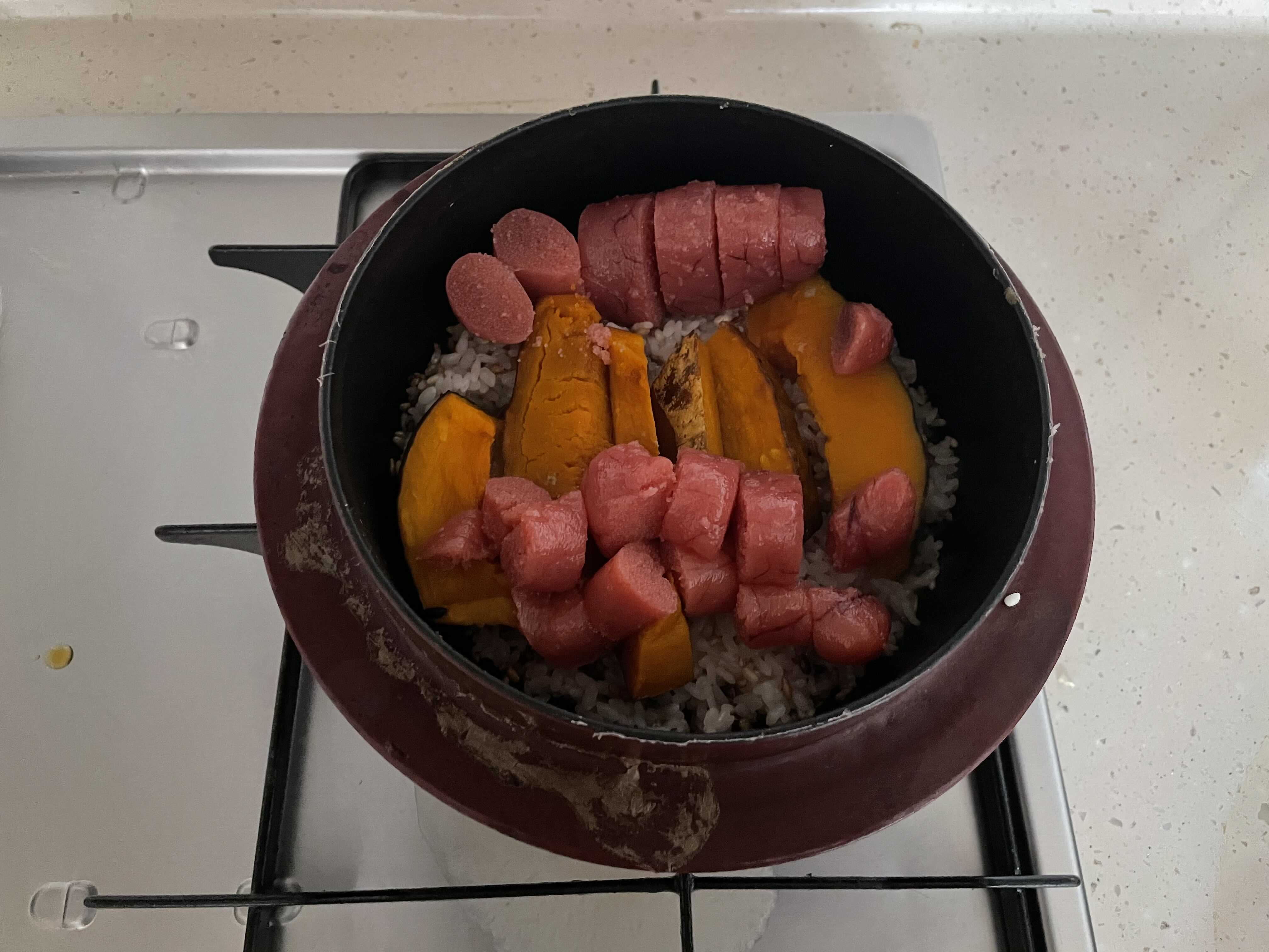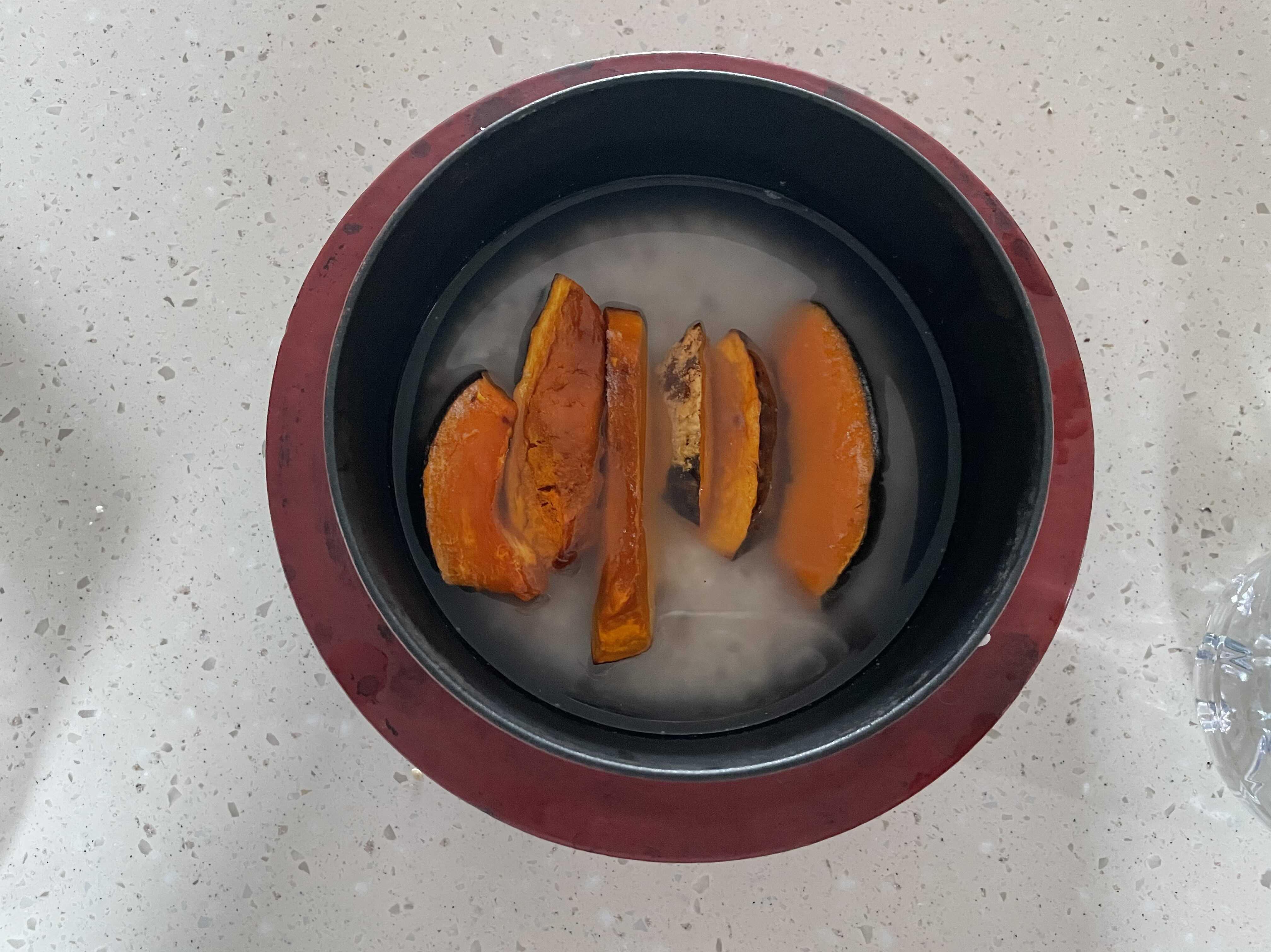 1. 씻어서 불려둔 쌀 2컵, 물 2컵 (쌀의양 = 물의양) 을 넣고, 얇게 썬 단호박을 올려준다.
