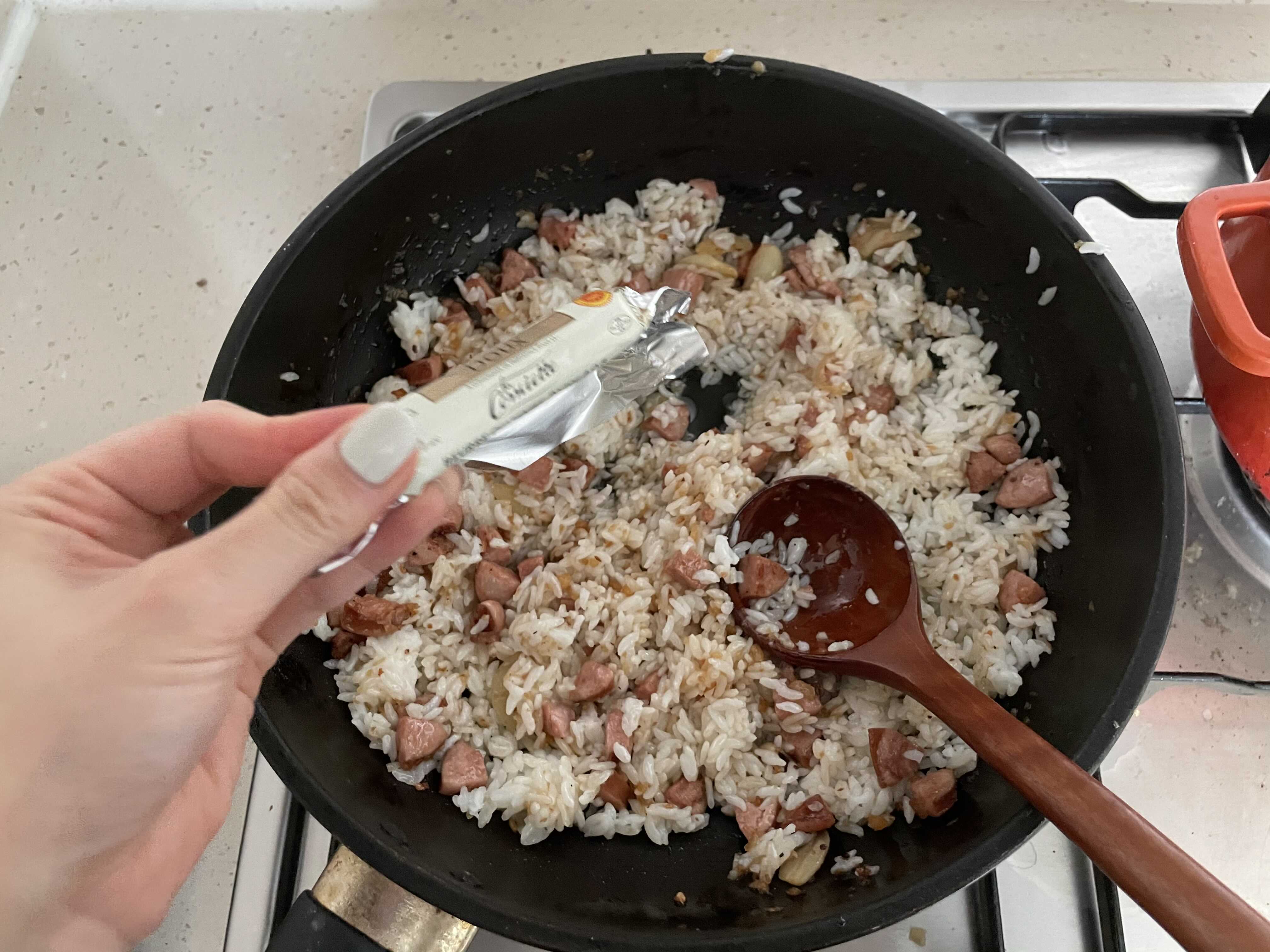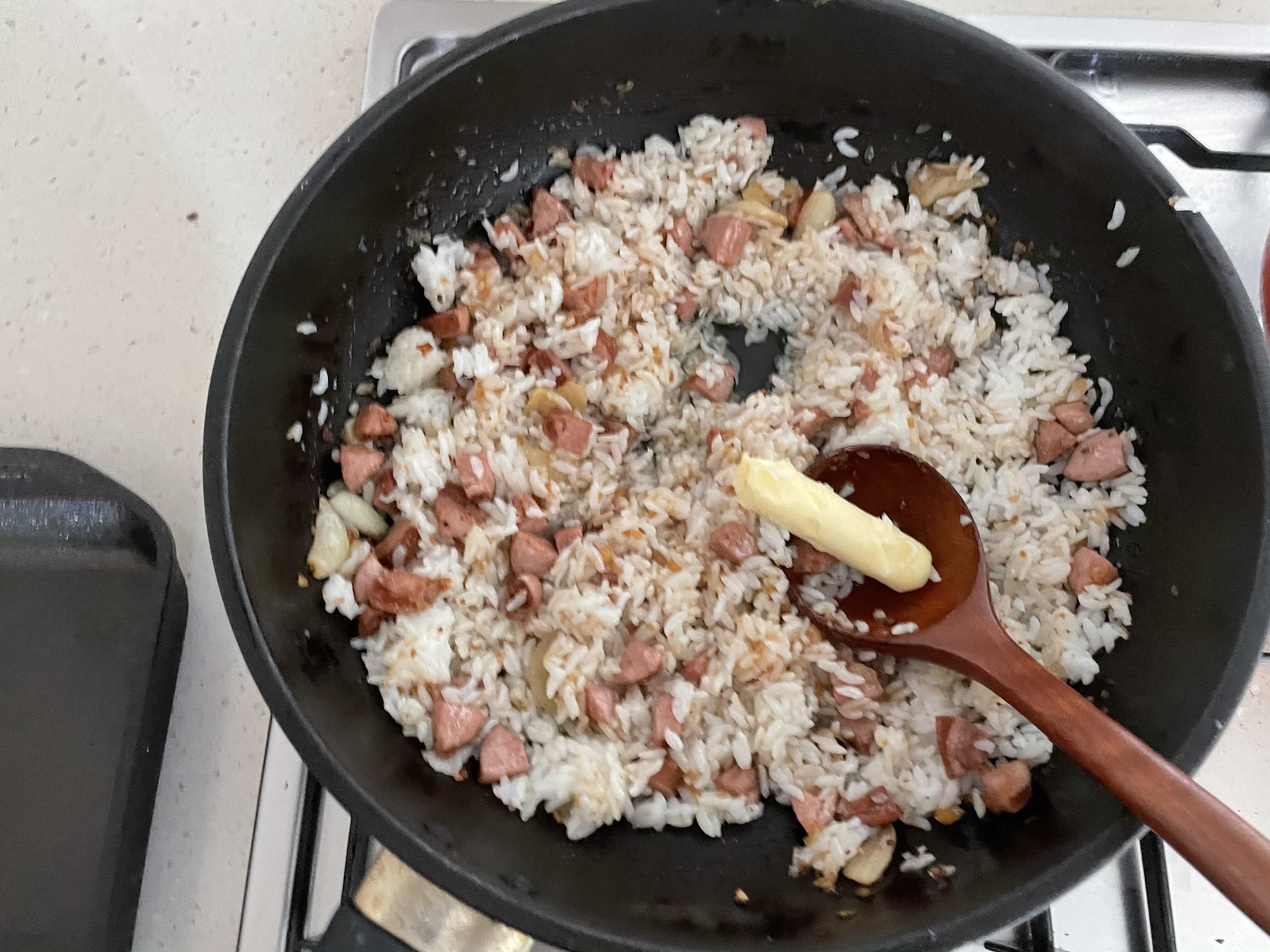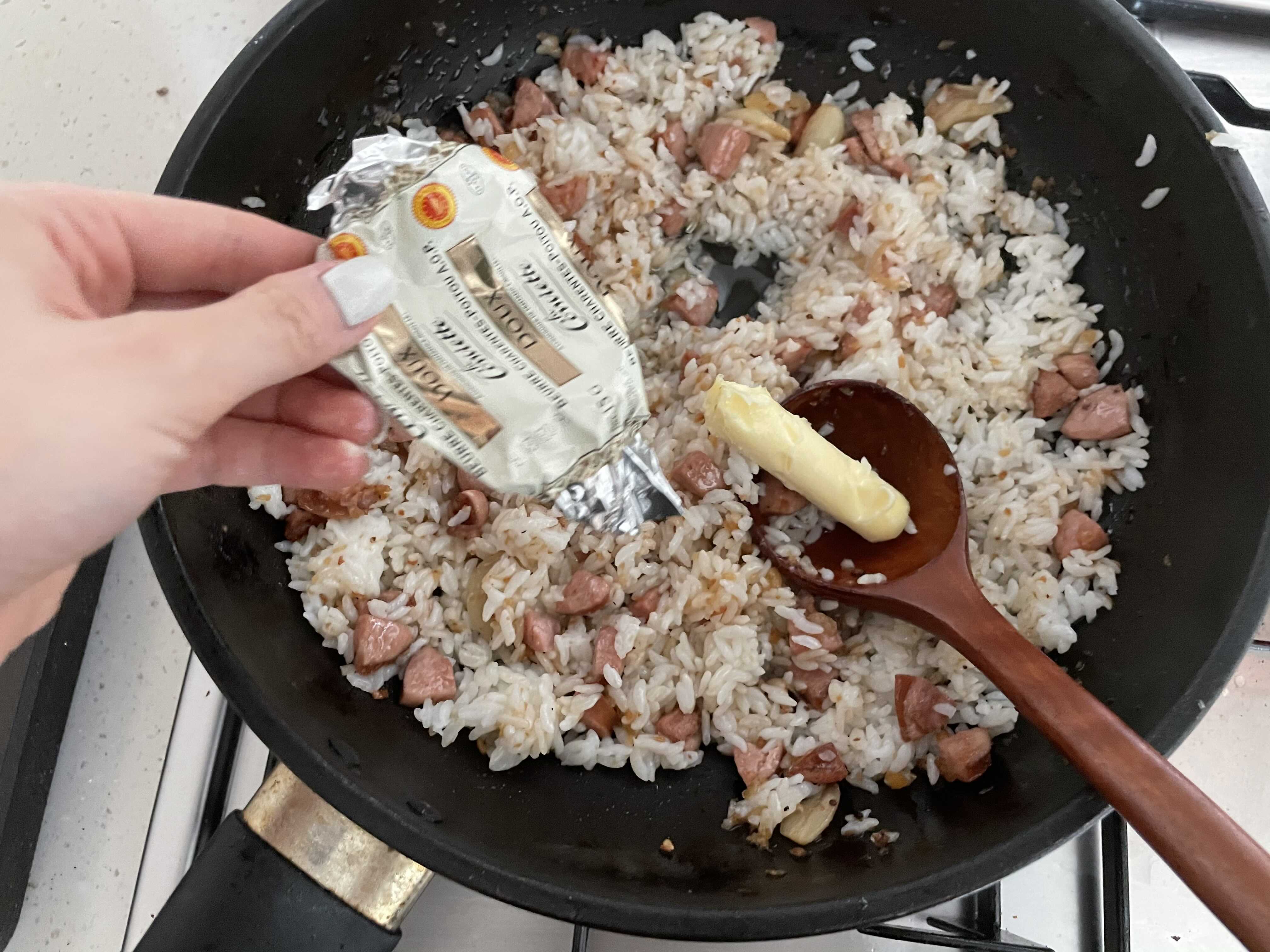 6. 법이 섞이면 불을 켜고 버터를 녹여가며 밥을 누르듯 수분을 날리며 볶는다.