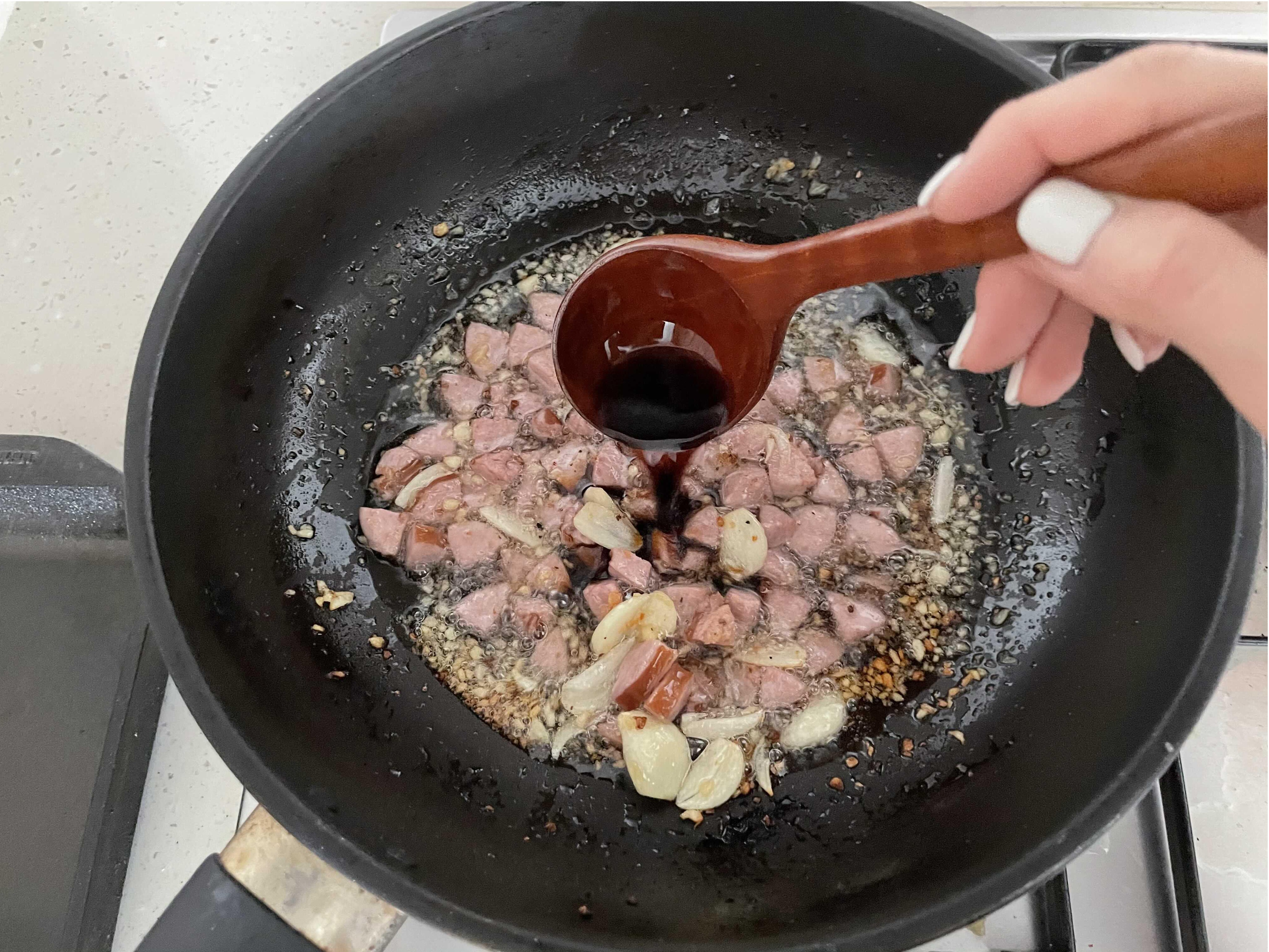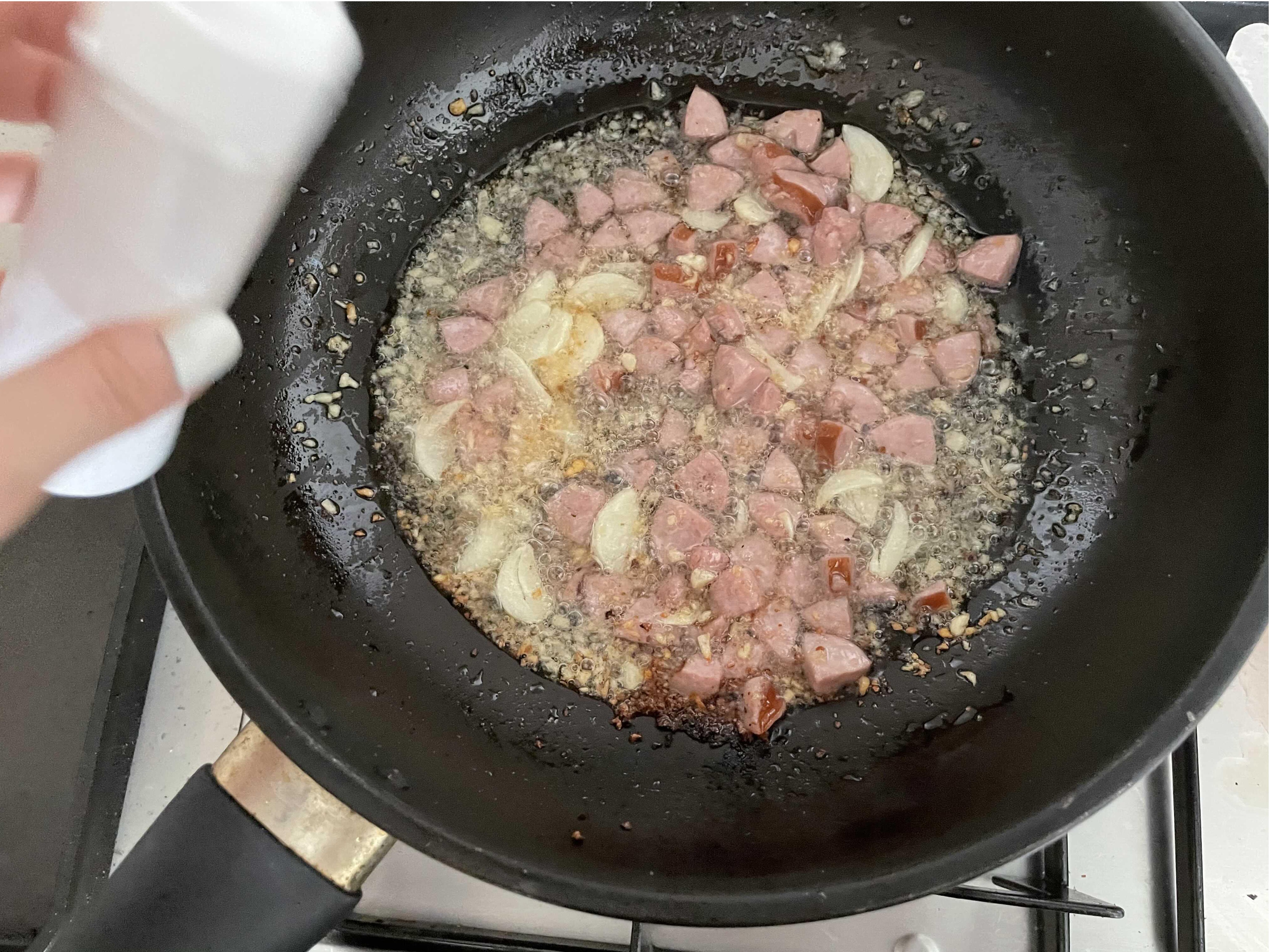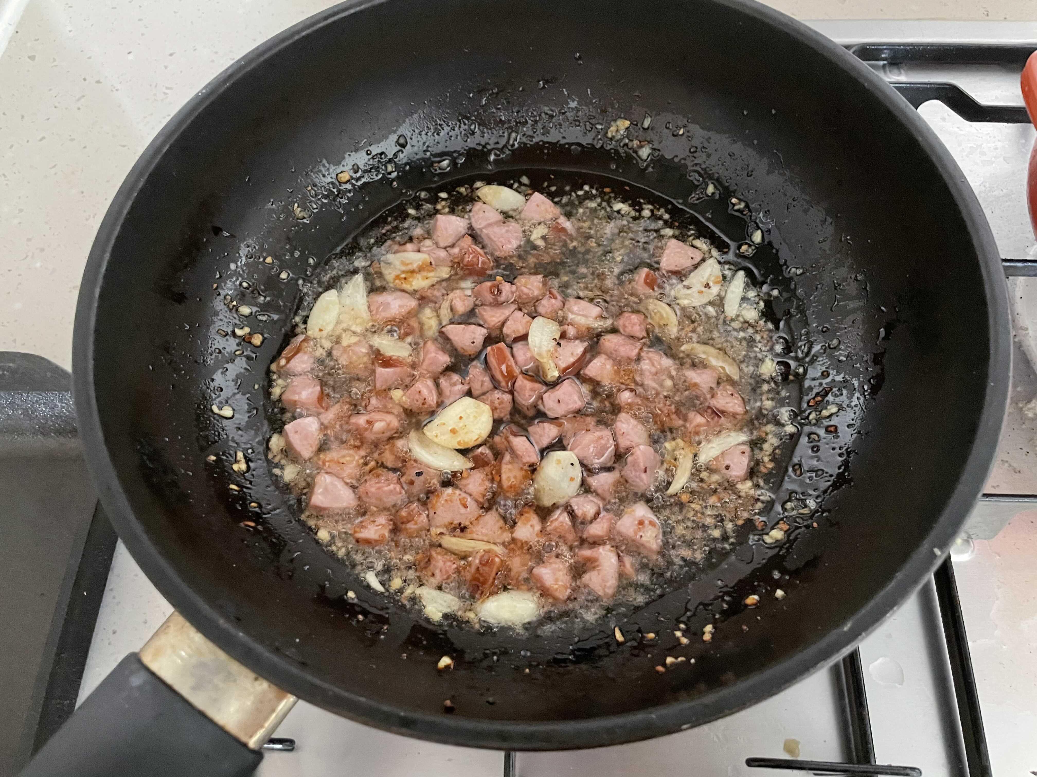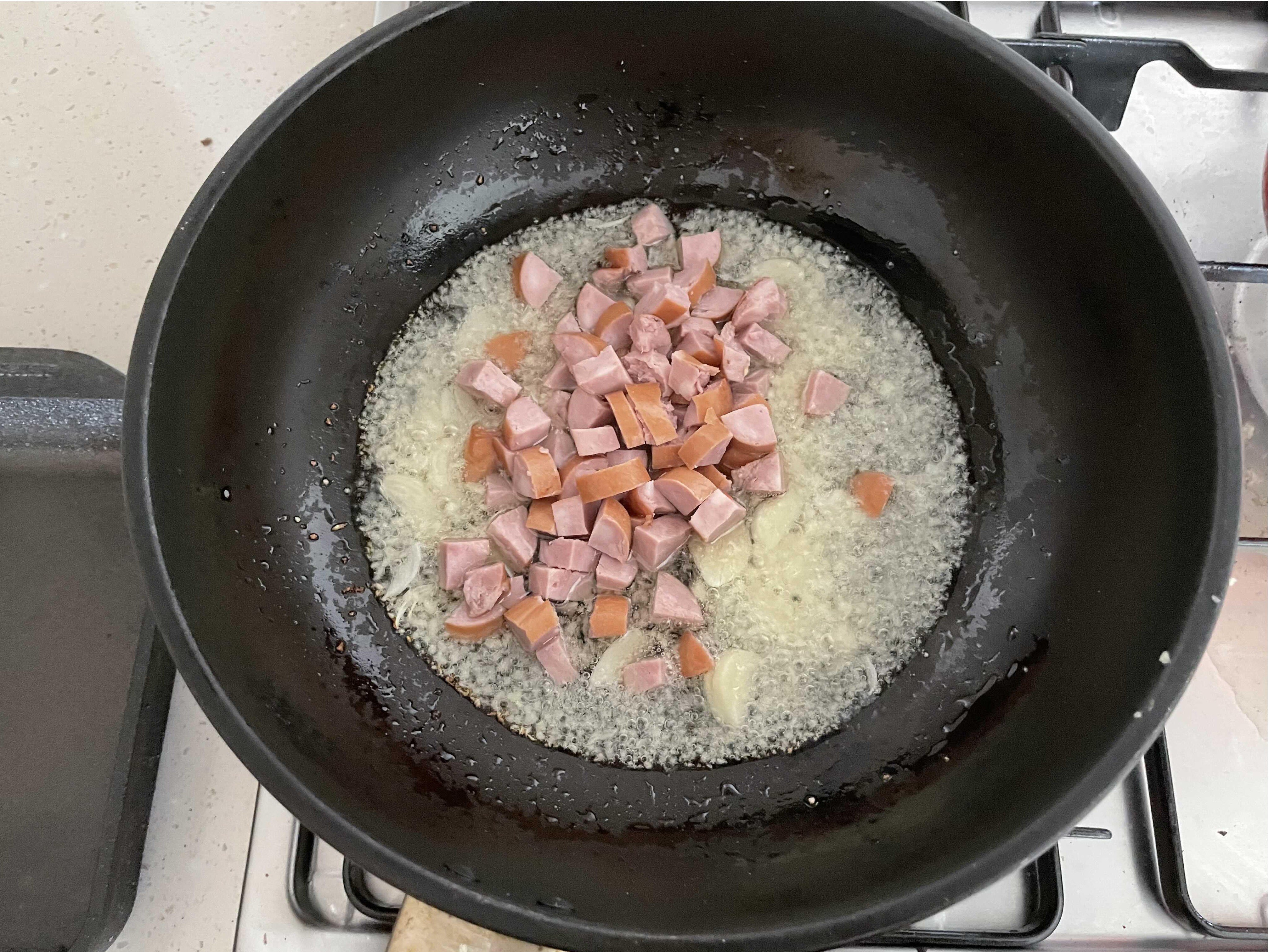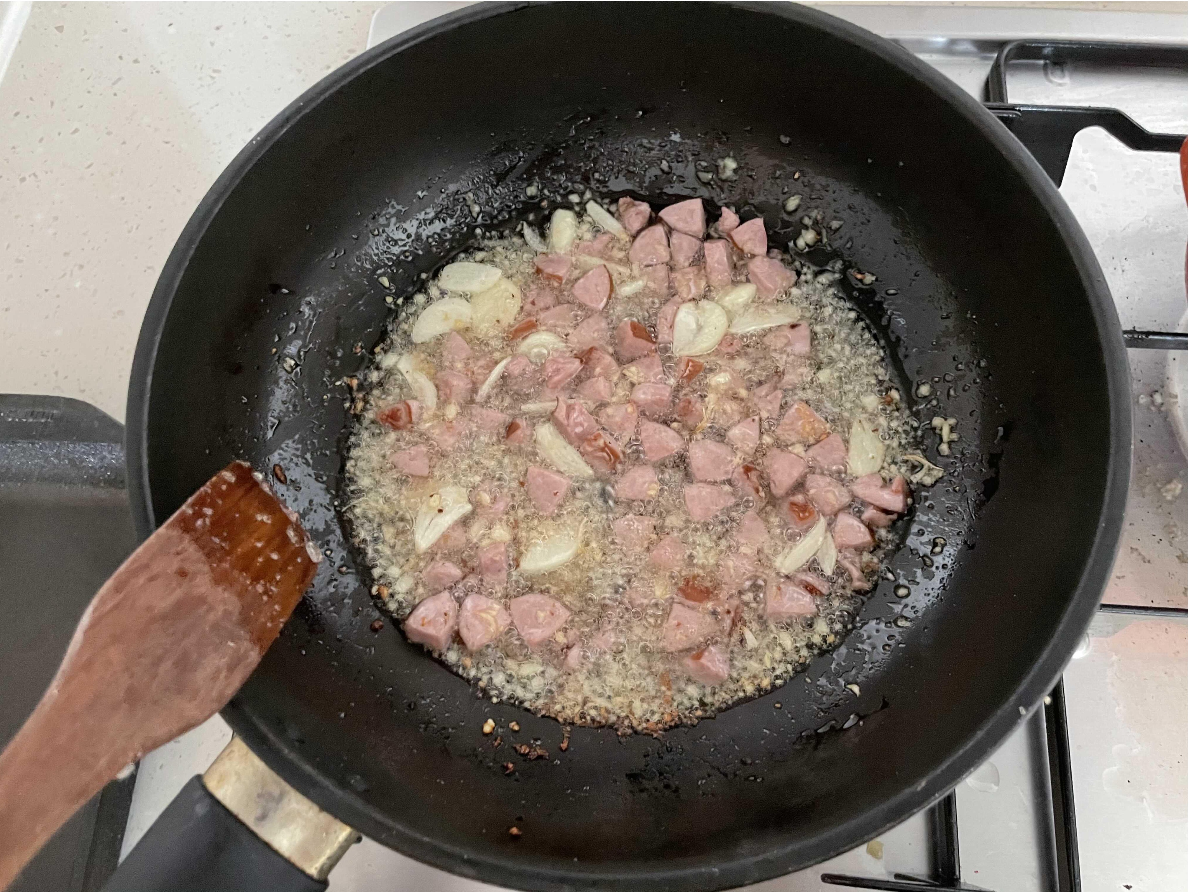 3. 햄또는 베이컨을 넣어서 같이 볶아준다. 다짐마늘에 노릇해질때까지. (베이컨을 넣는 경우 기름을 조금 적게 넣어준다)