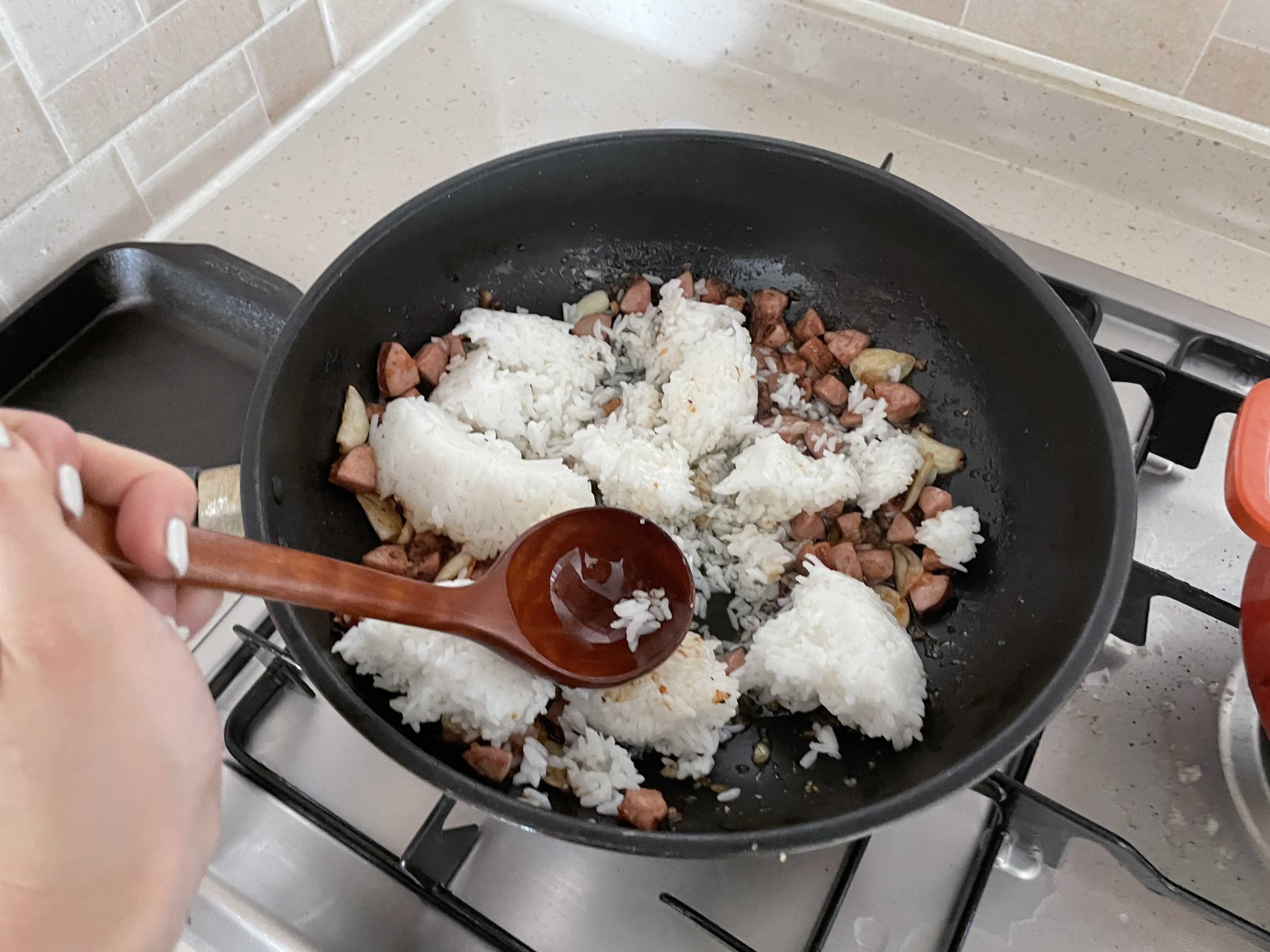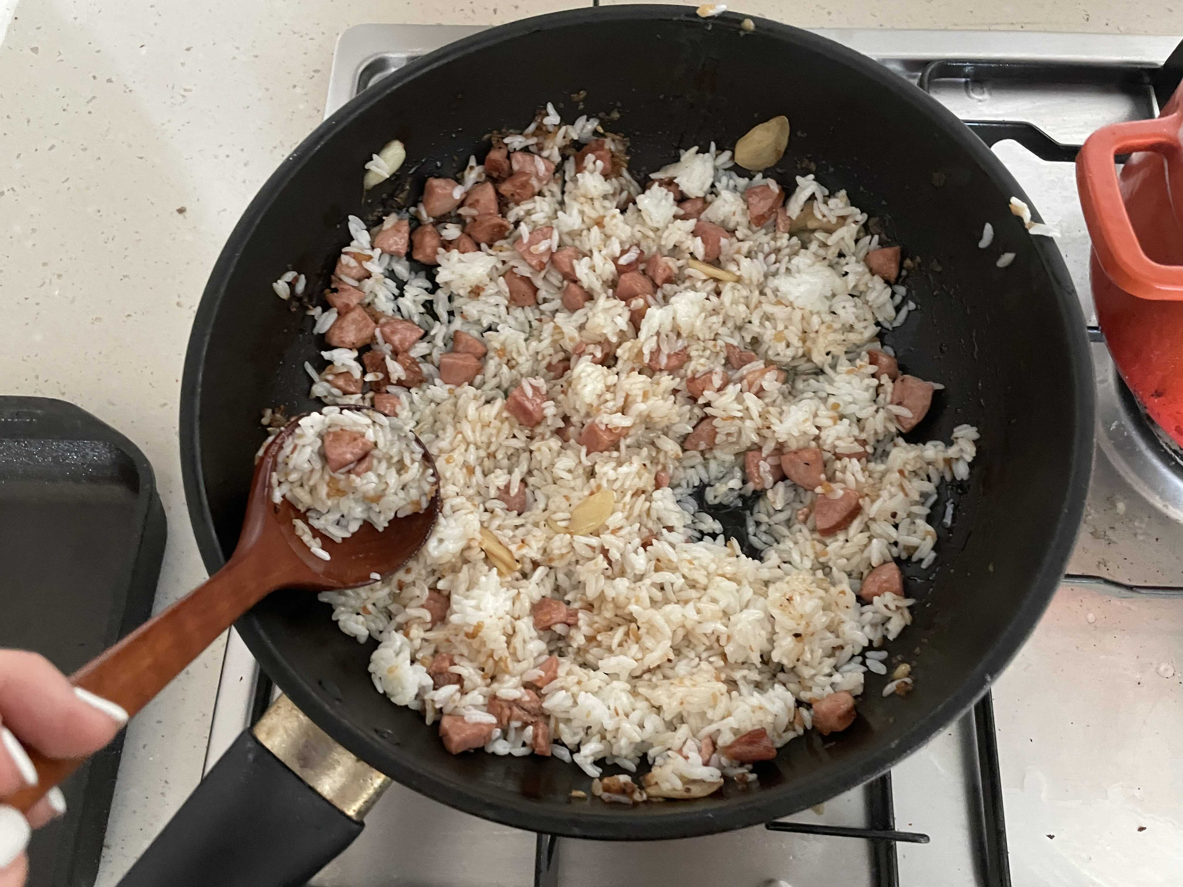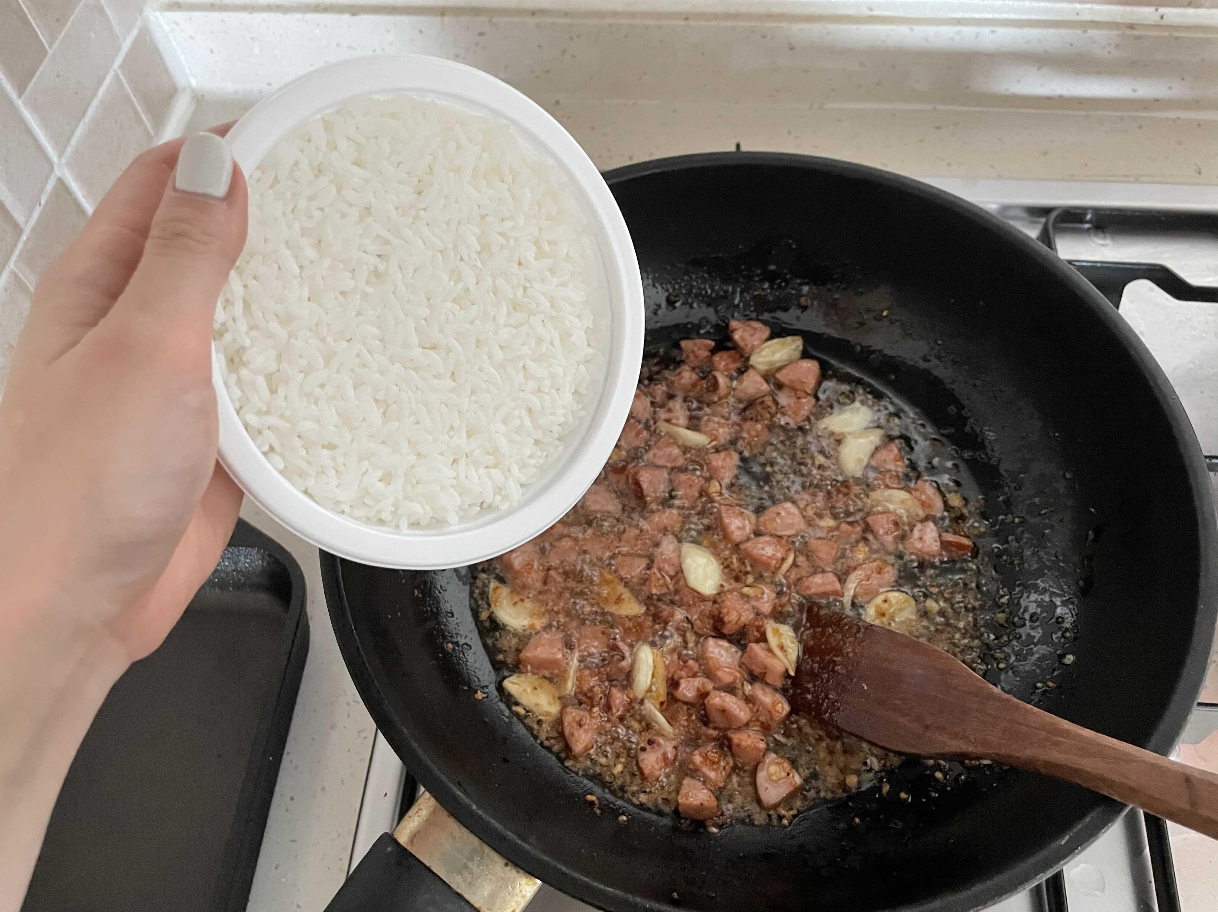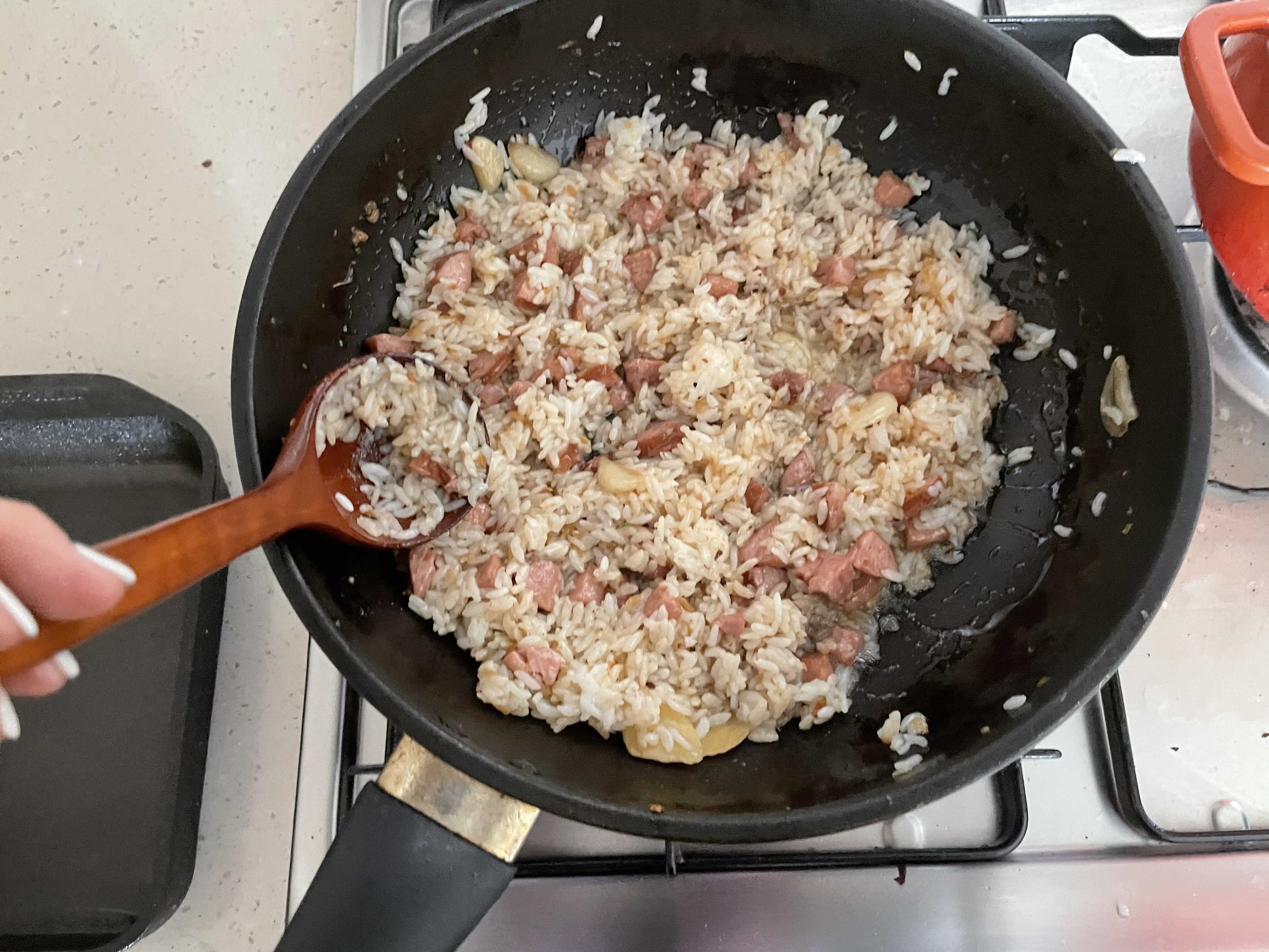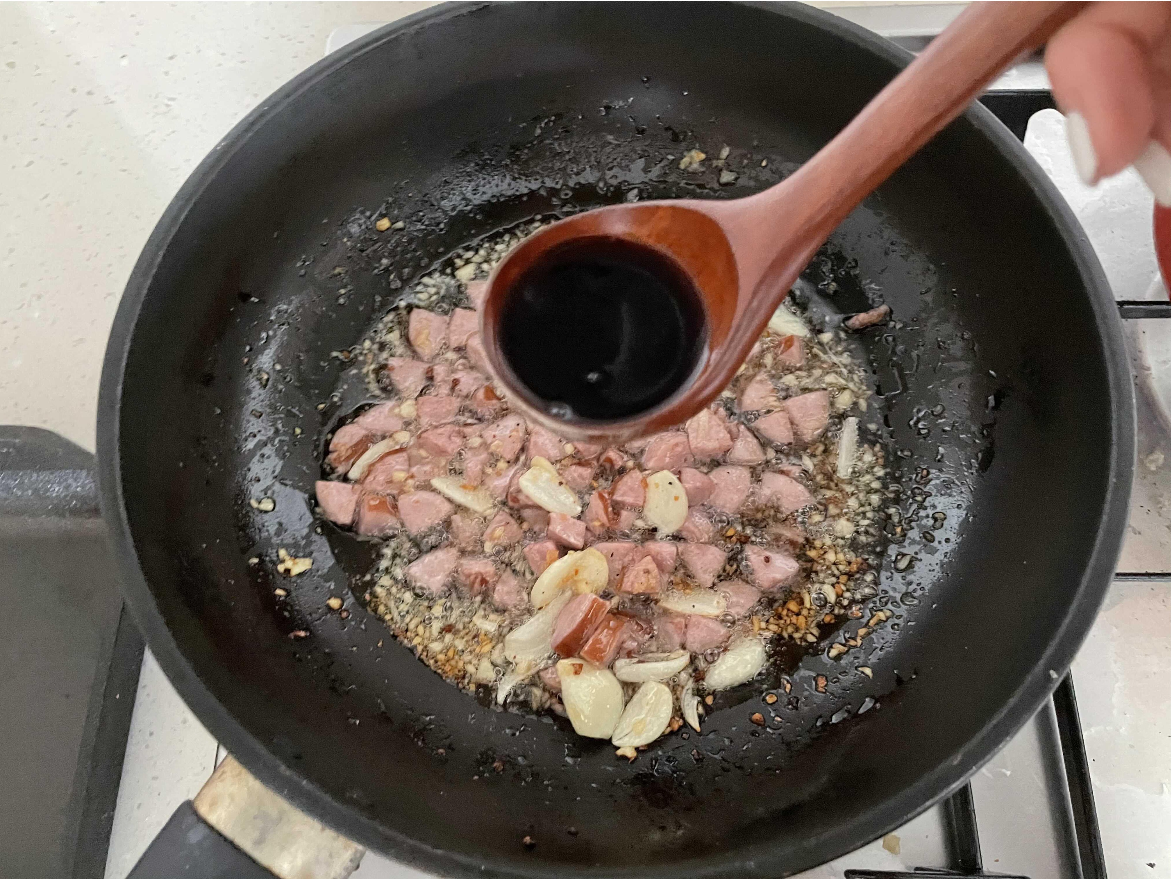 3. 햄또는 베이컨을 넣어서 같이 볶아준다. 다짐마늘에 노릇해질때까지. (베이컨을 넣는 경우 기름을 조금 적게 넣어준다)
