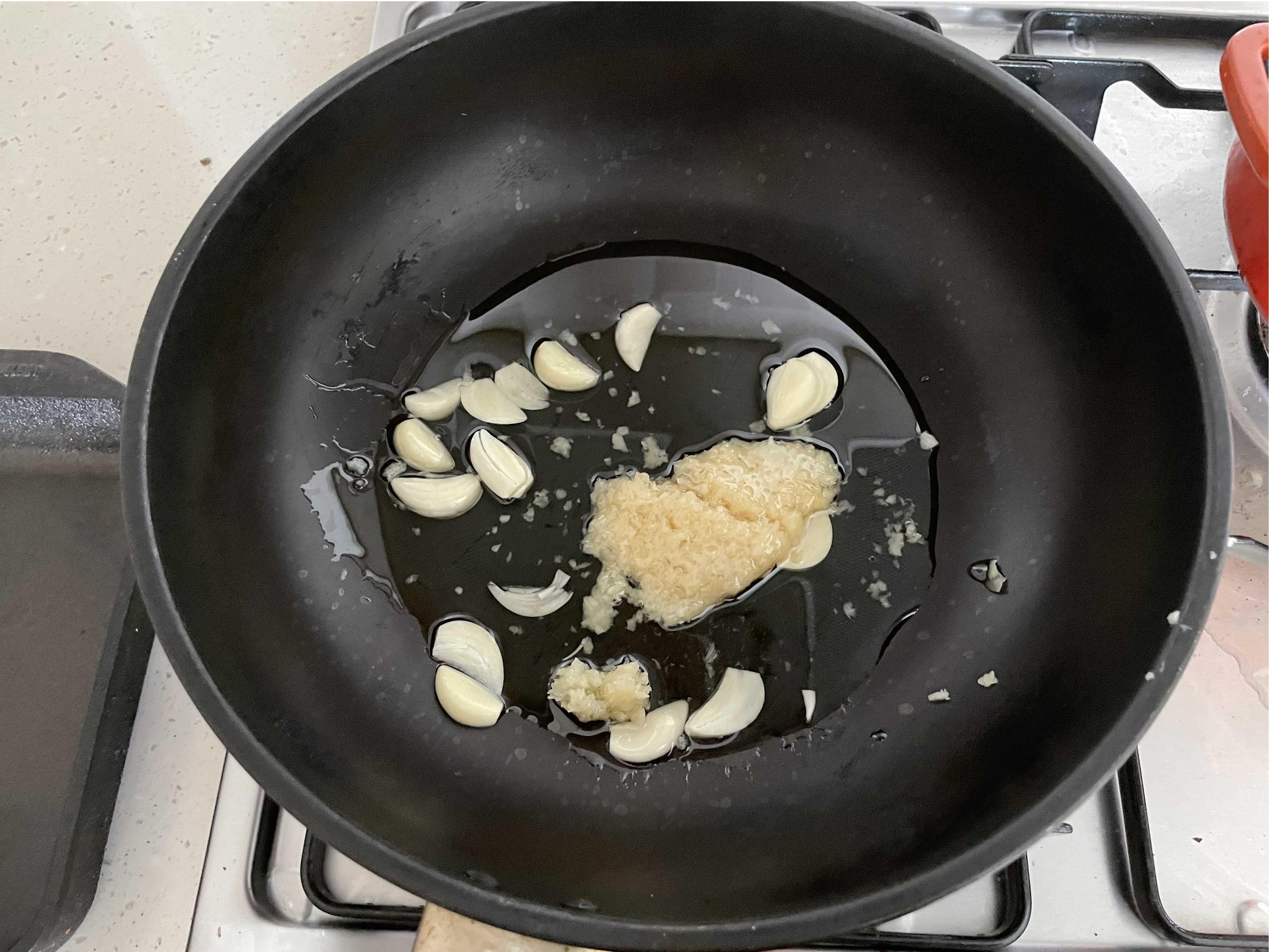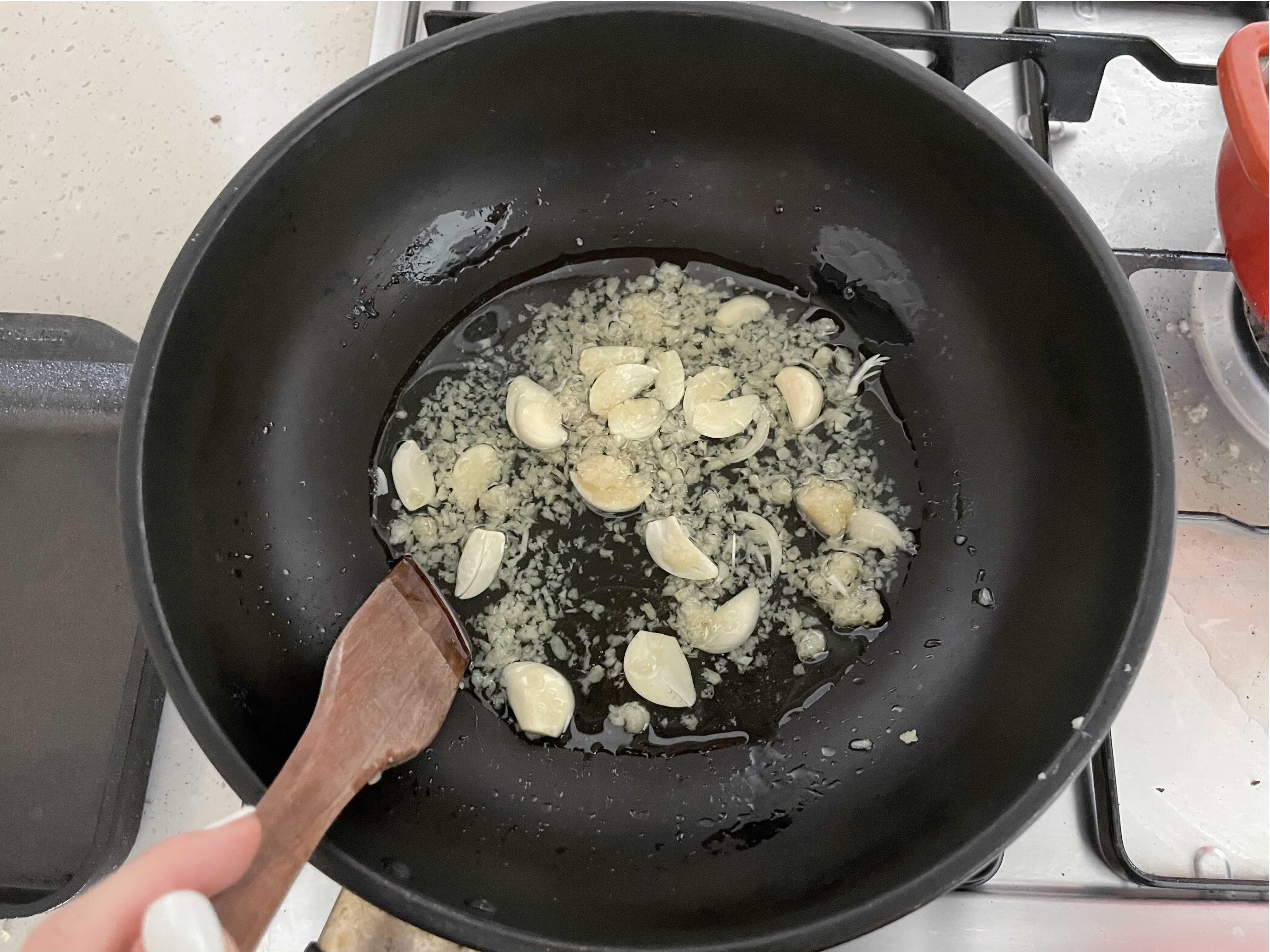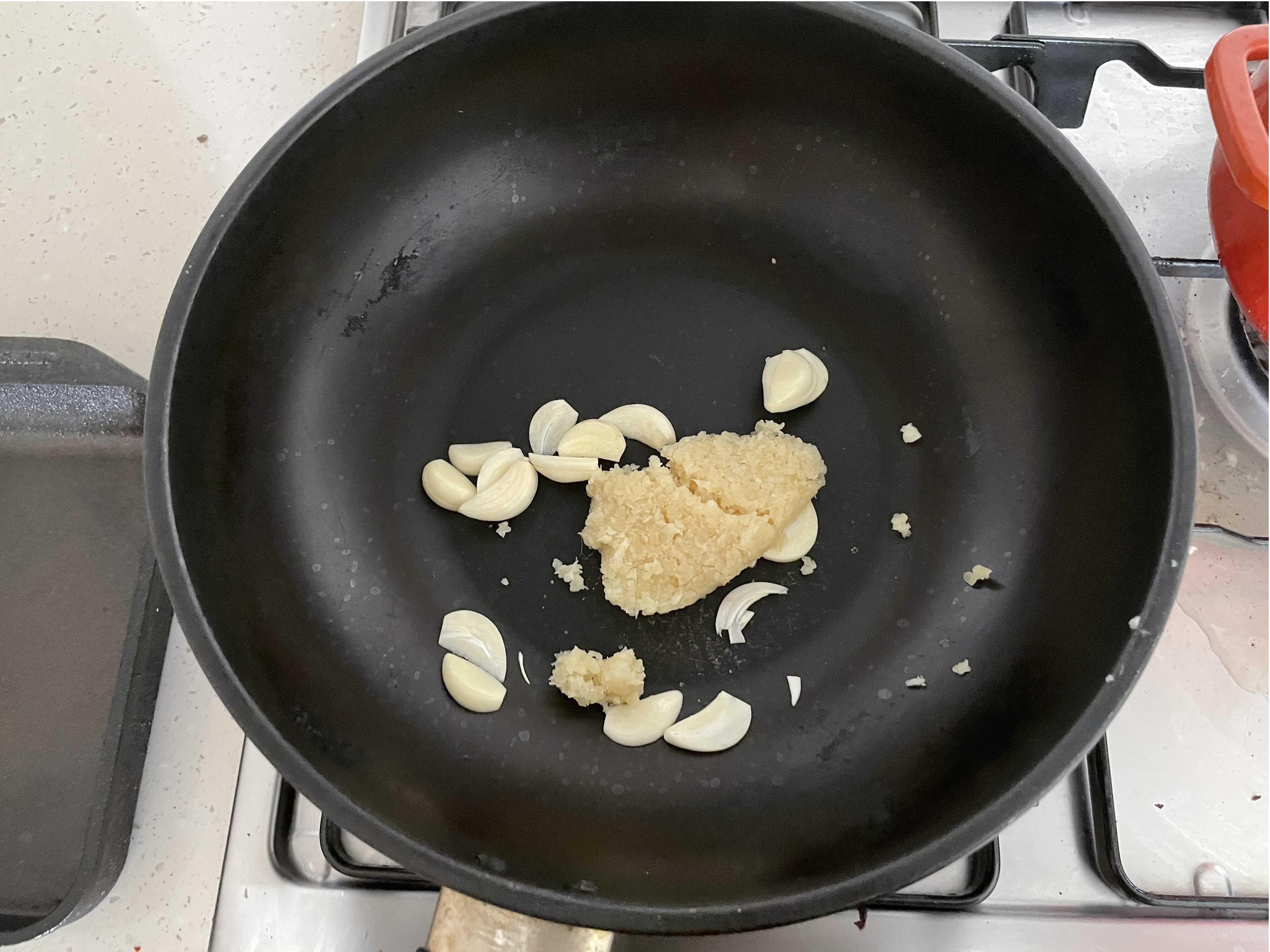 1. 달구지 않은 코팅팬에 편마늘과 다진마늘(키친타올로 물기를 제거한)을 넣고 기름을 충분히 둘러준다. - 마늘 기름을 낼 수 있을 정도로