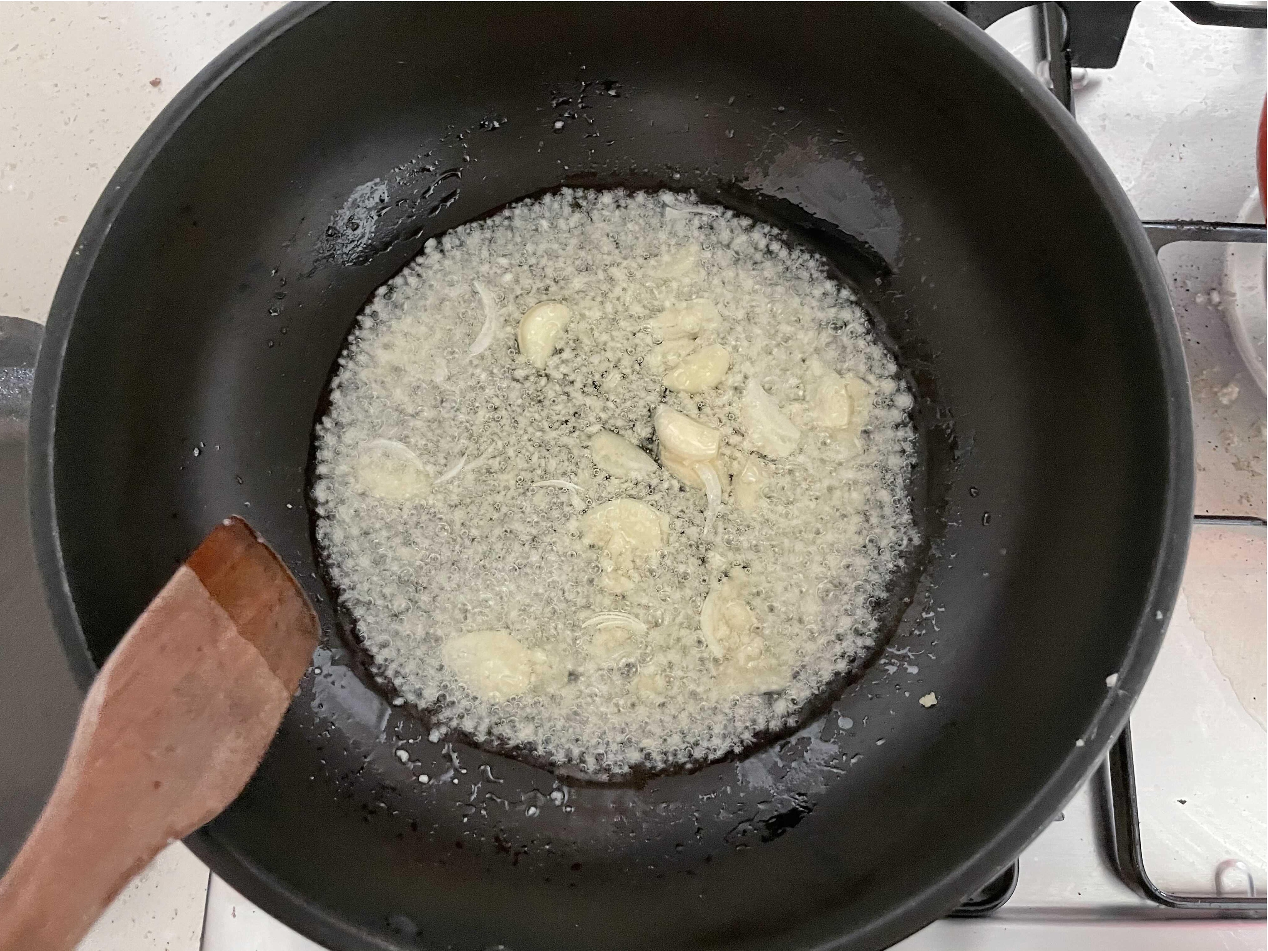 2. 약불에서 다진마늘이 살짝 노릇해질때까지 마늘기름을 충분히 내준다.