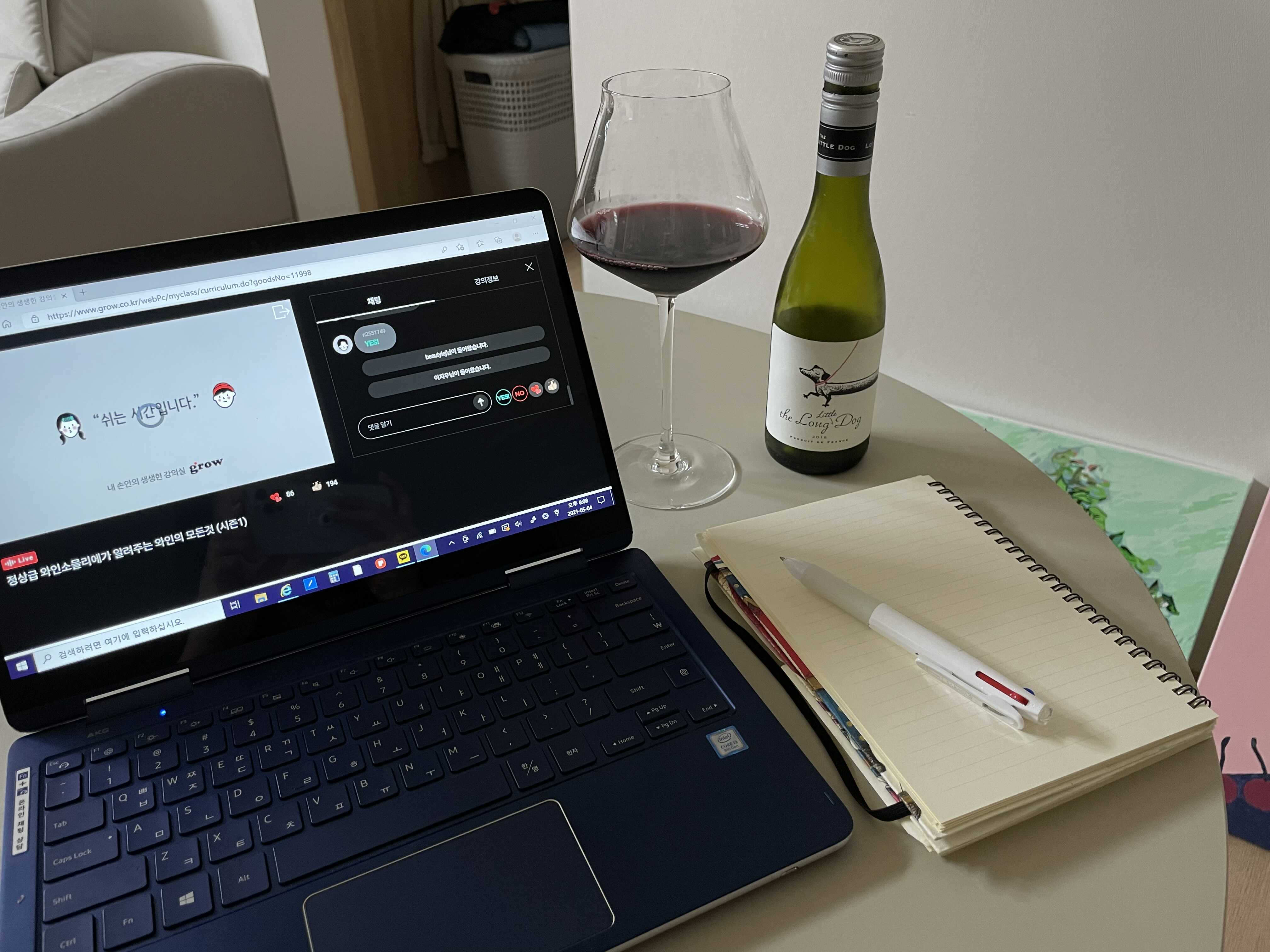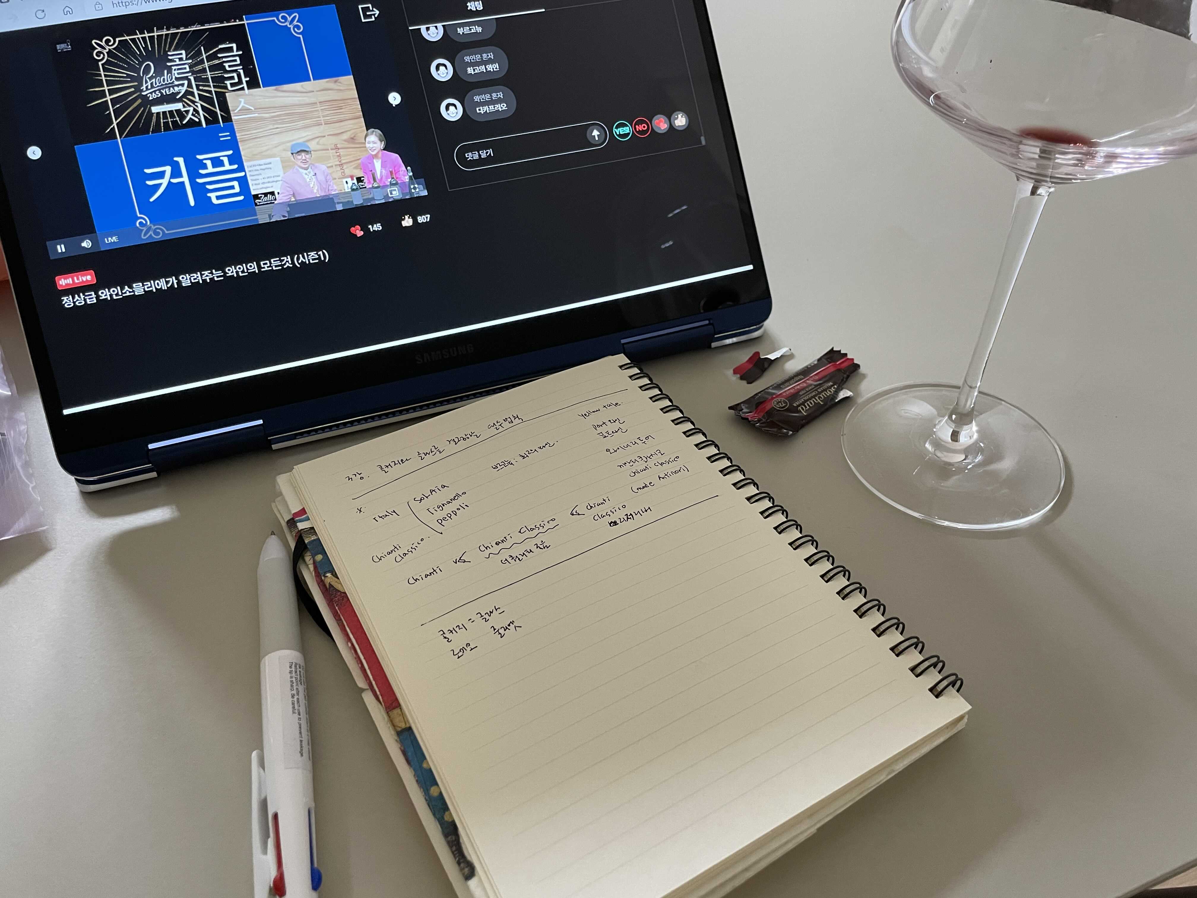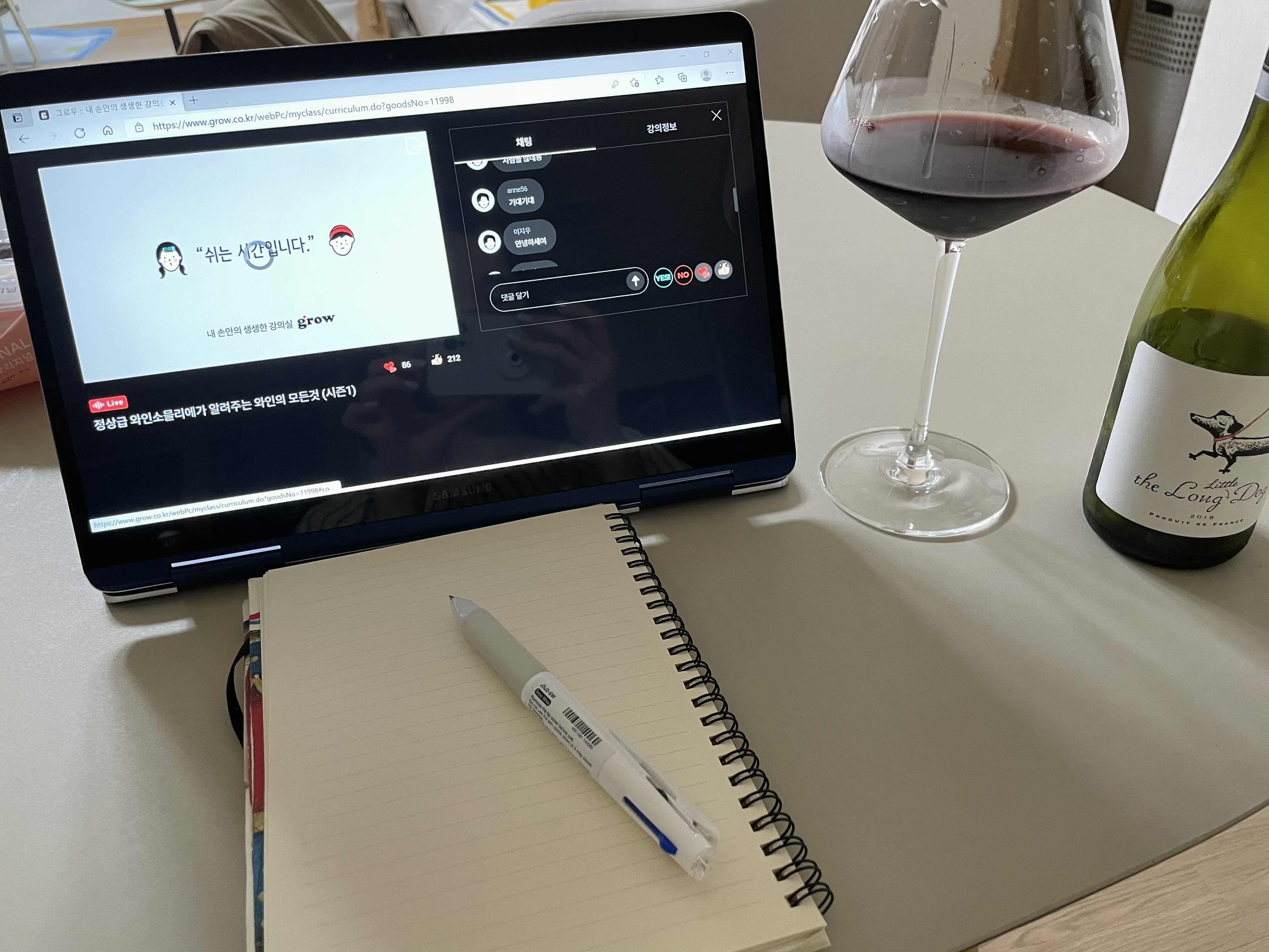 수업 전, 채팅창을 보니 같이 수업듣는 분들께서 다들 와인 한 잔씩 준비하고 기다린다길래.. 나도 집에 있던 와인과 열심히 듣기 위해 필기도구들을 준비해보았다.