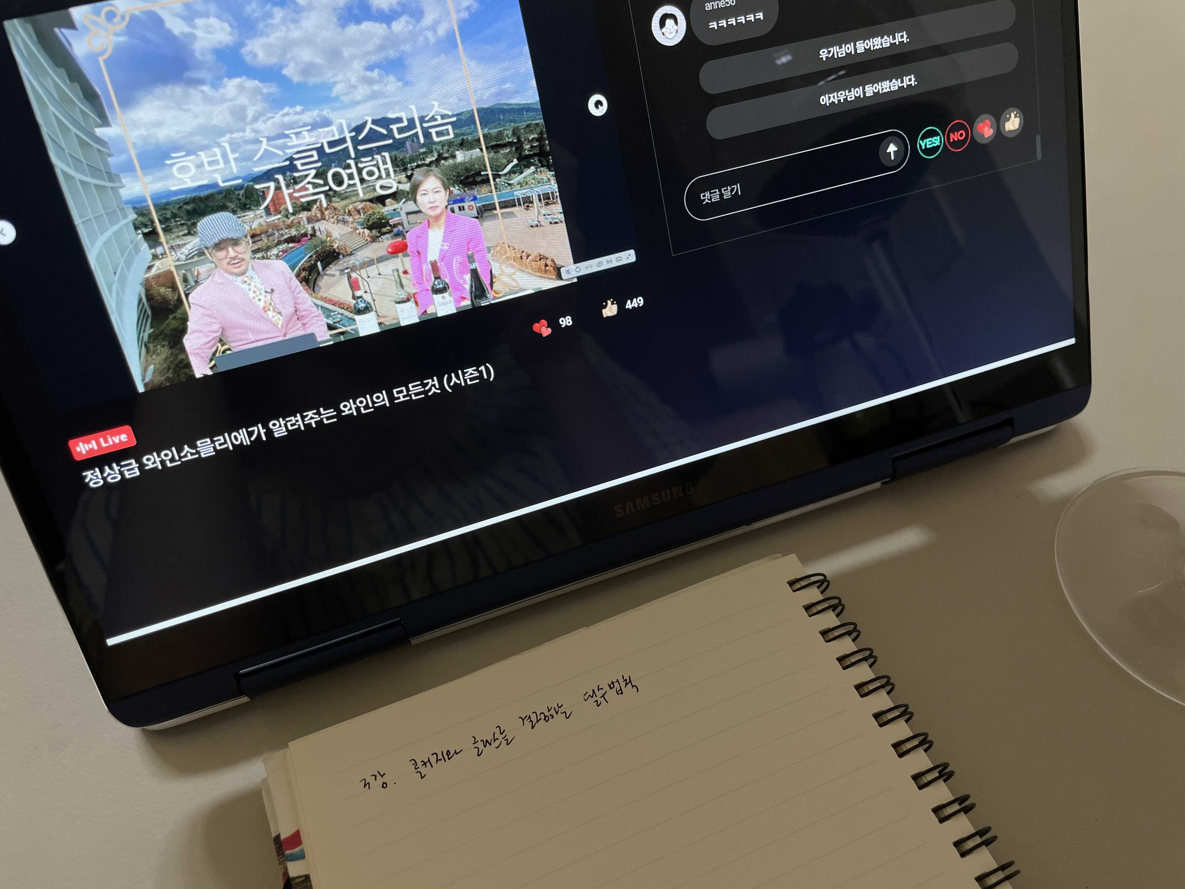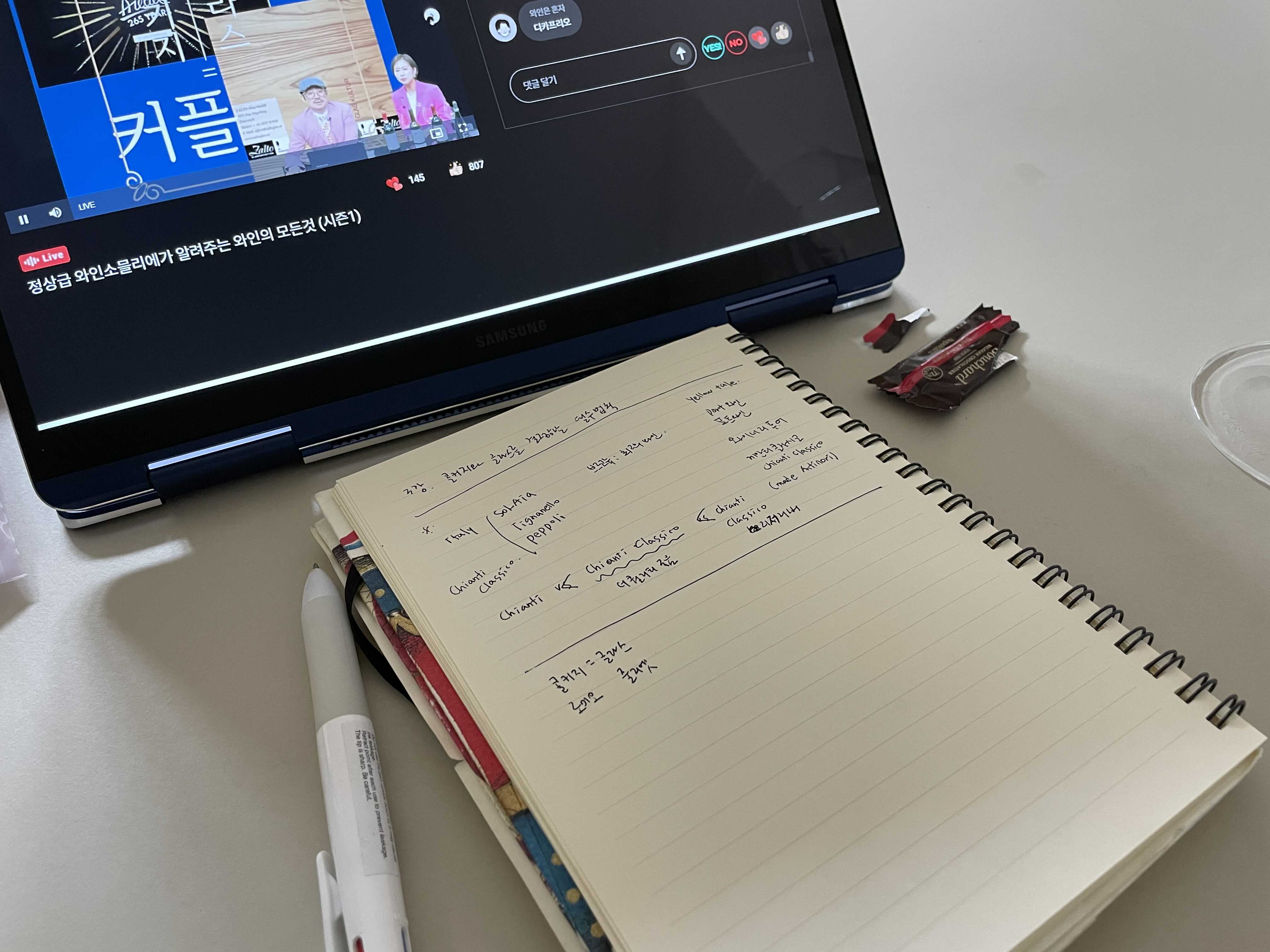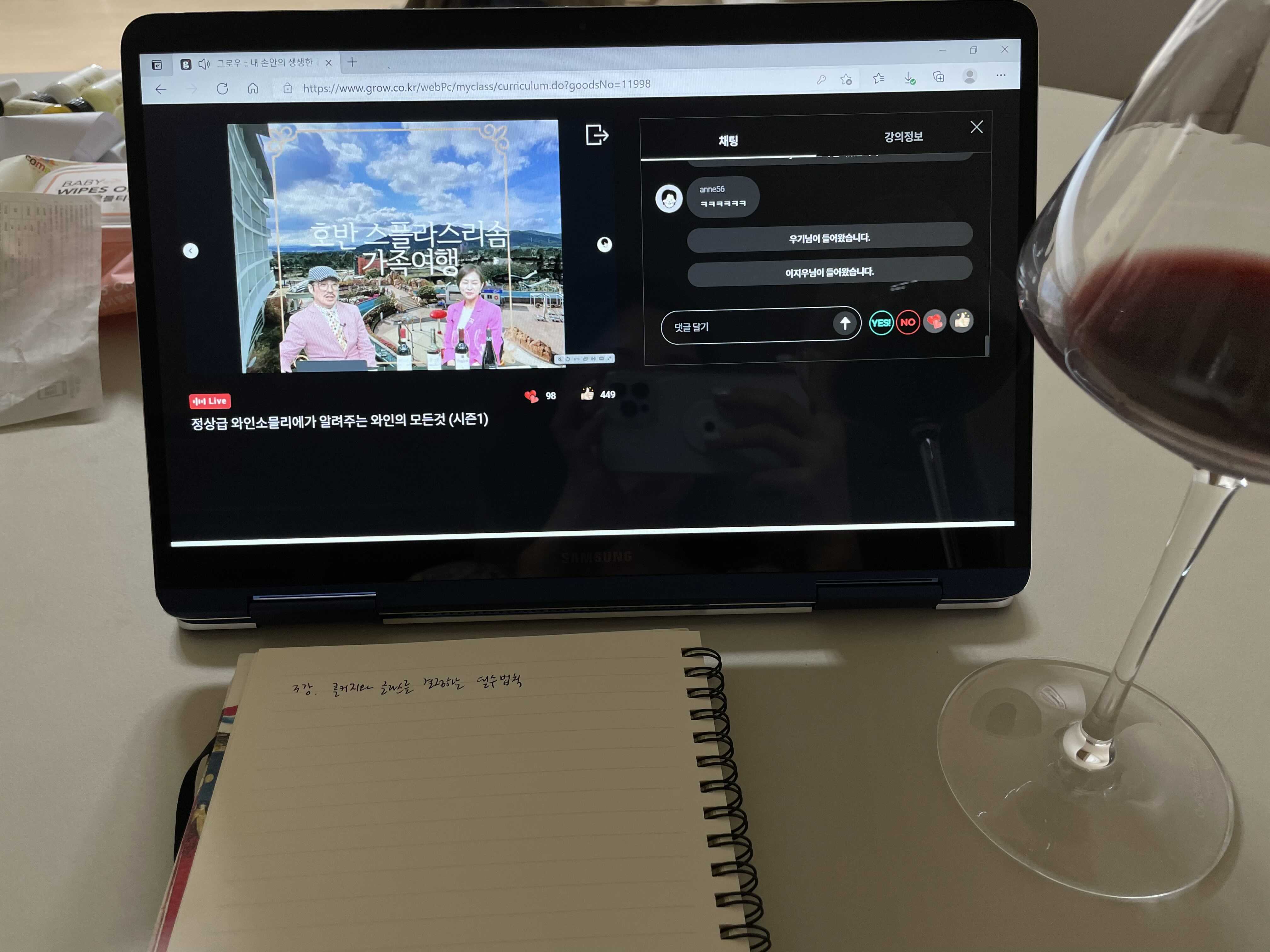 수업 전, 채팅창을 보니 같이 수업듣는 분들께서 다들 와인 한 잔씩 준비하고 기다린다길래.. 나도 집에 있던 와인과 열심히 듣기 위해 필기도구들을 준비해보았다.