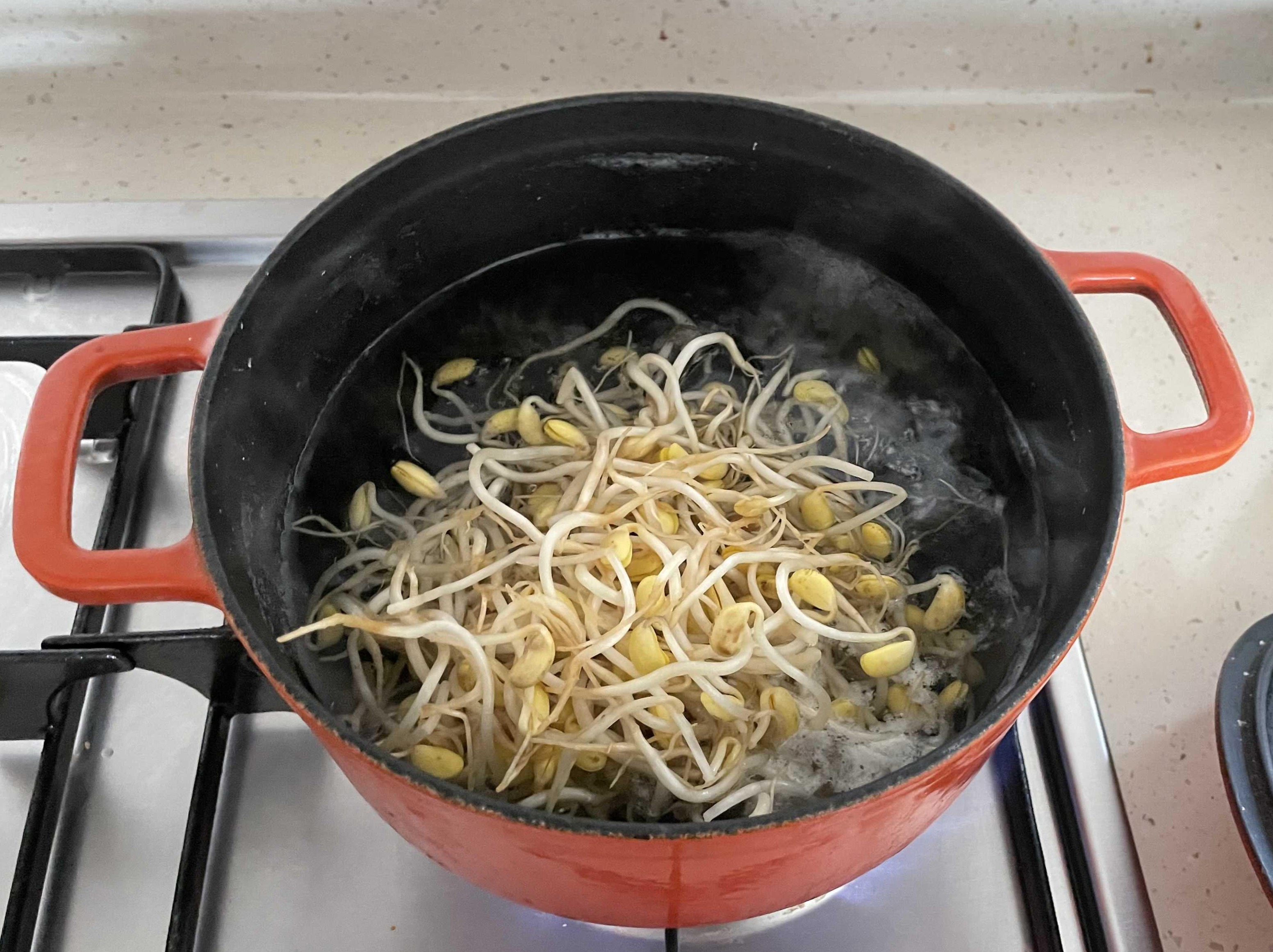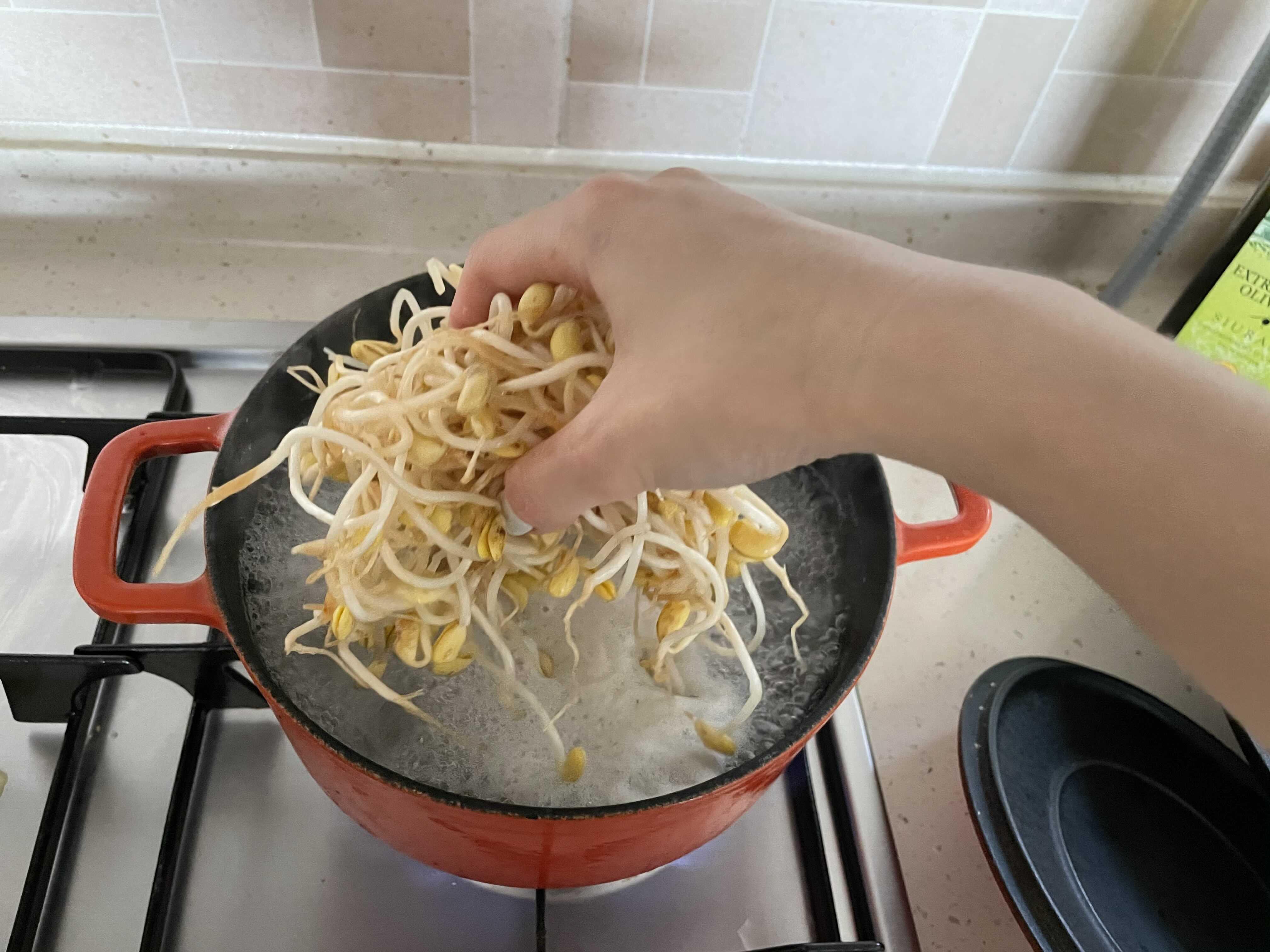 3. 굵은 소금으로 간을 하고, 씻어둔 콩나물을 끓는 물에 넣는다. (tip. 콩나물을 넣을때는 냄비뚜껑을 닫지않는다.!)
