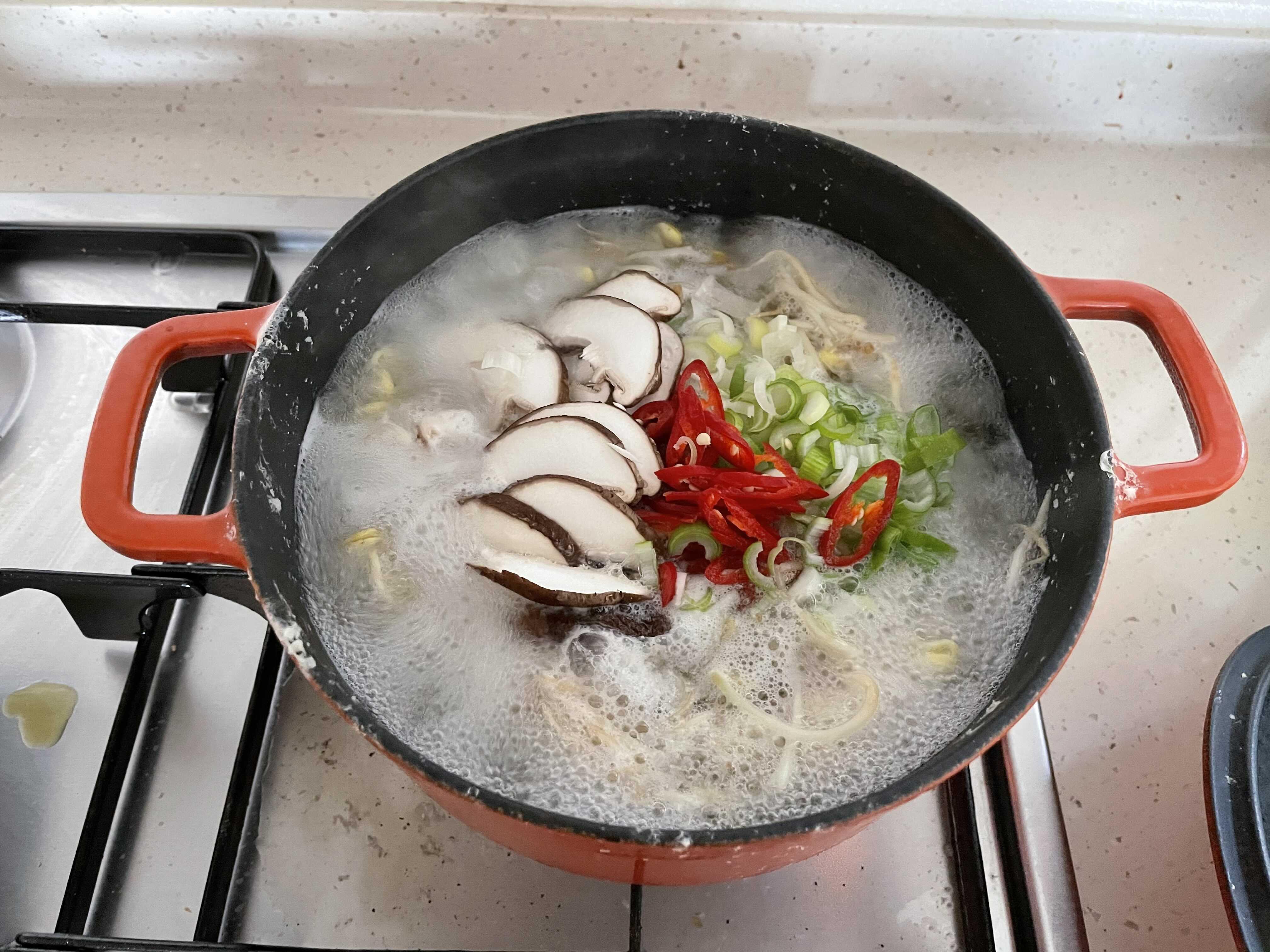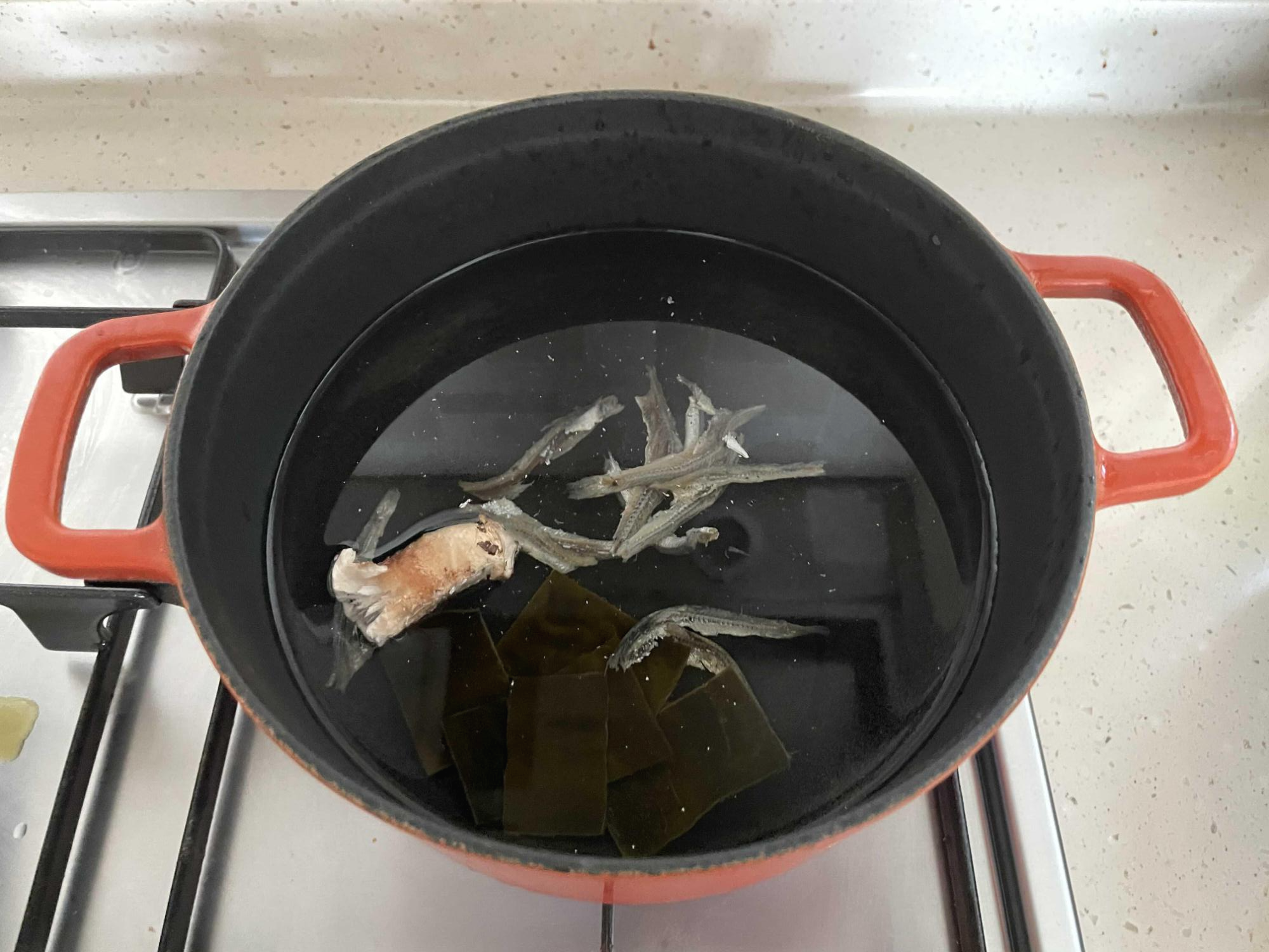 1. 먼저 다싯물을 내준다. (나는 보통 육수용멸치와 다시마를 넣어서 내지만, 표고버섯도 넣을거라 버섯기둥도 함께내서 내어주었다.)