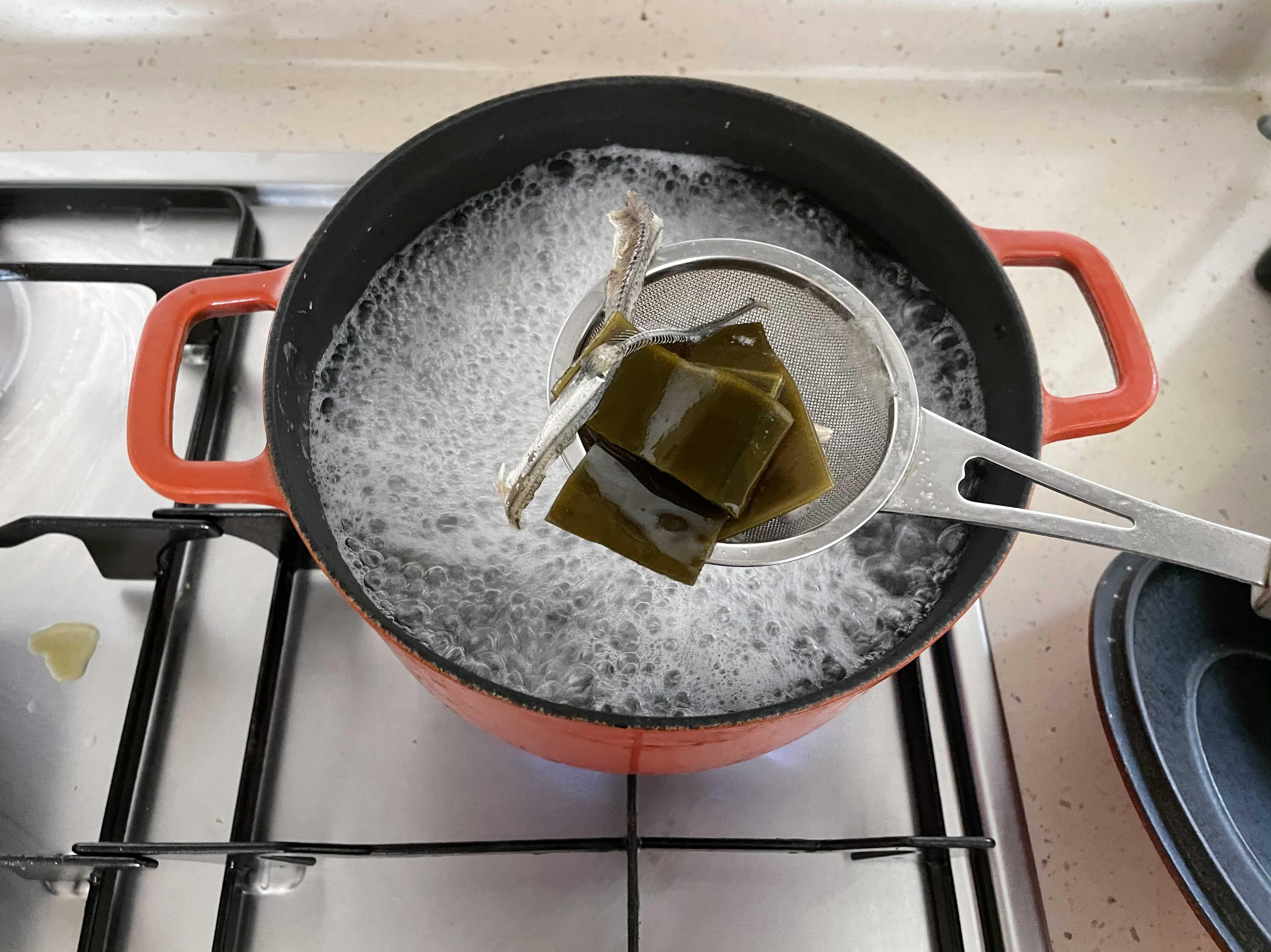 2. 다싯물을 낸다음 육수용재료들은 체에 받쳐 걸러낸다.