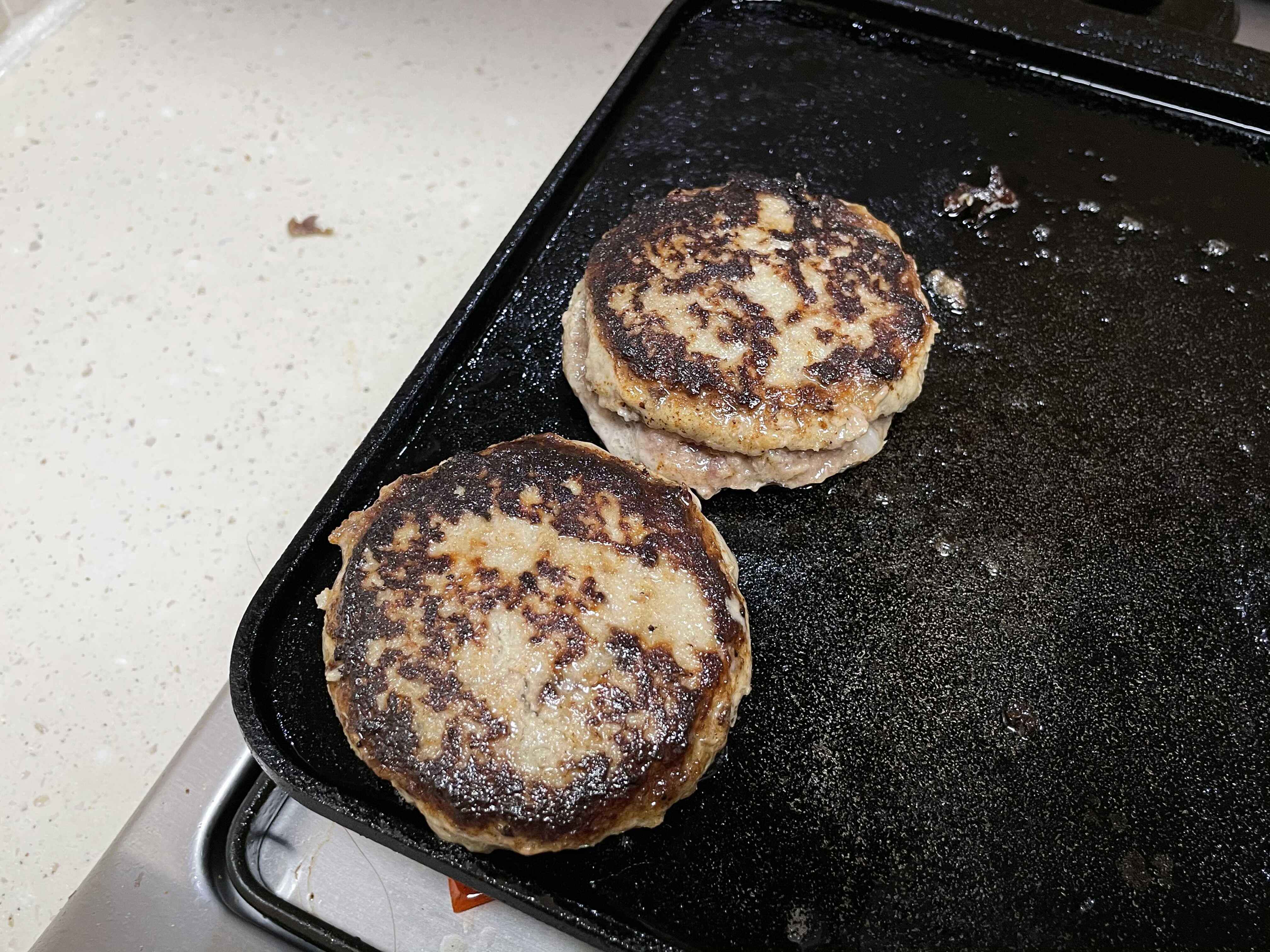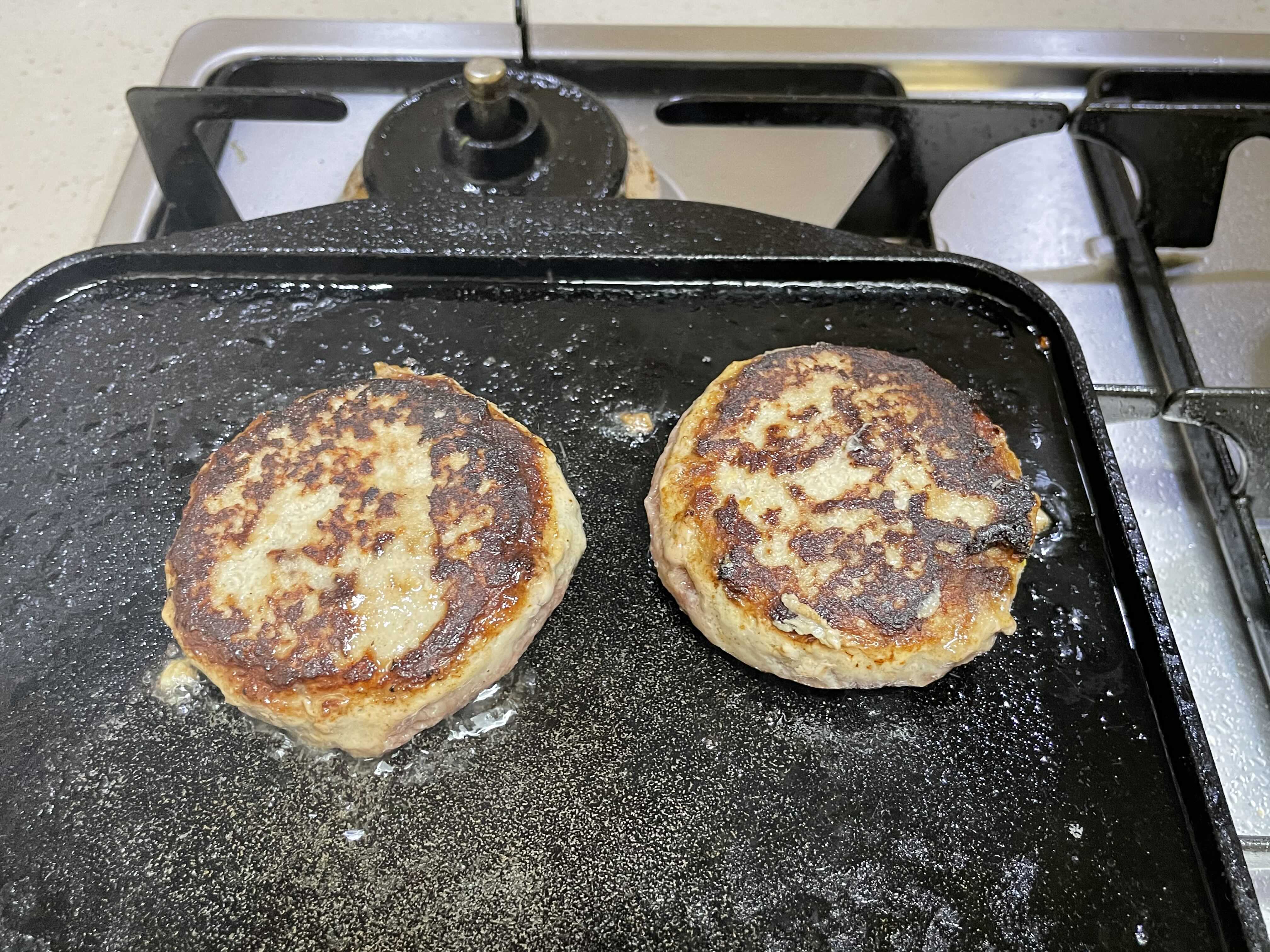 6. 달군 팬에 기름을 뿌리고 함박스테이크가 속까지 익도록 익혀준다.