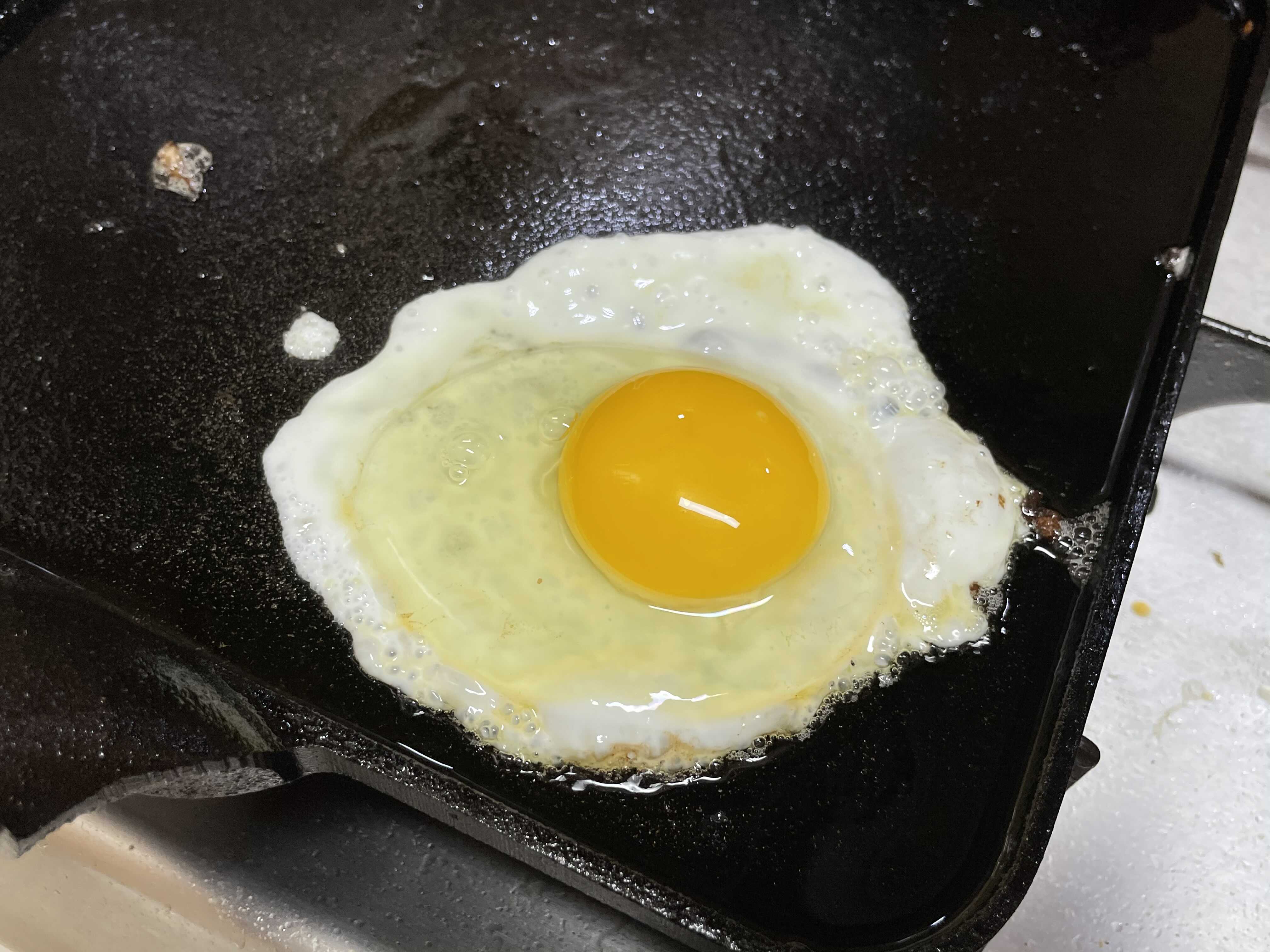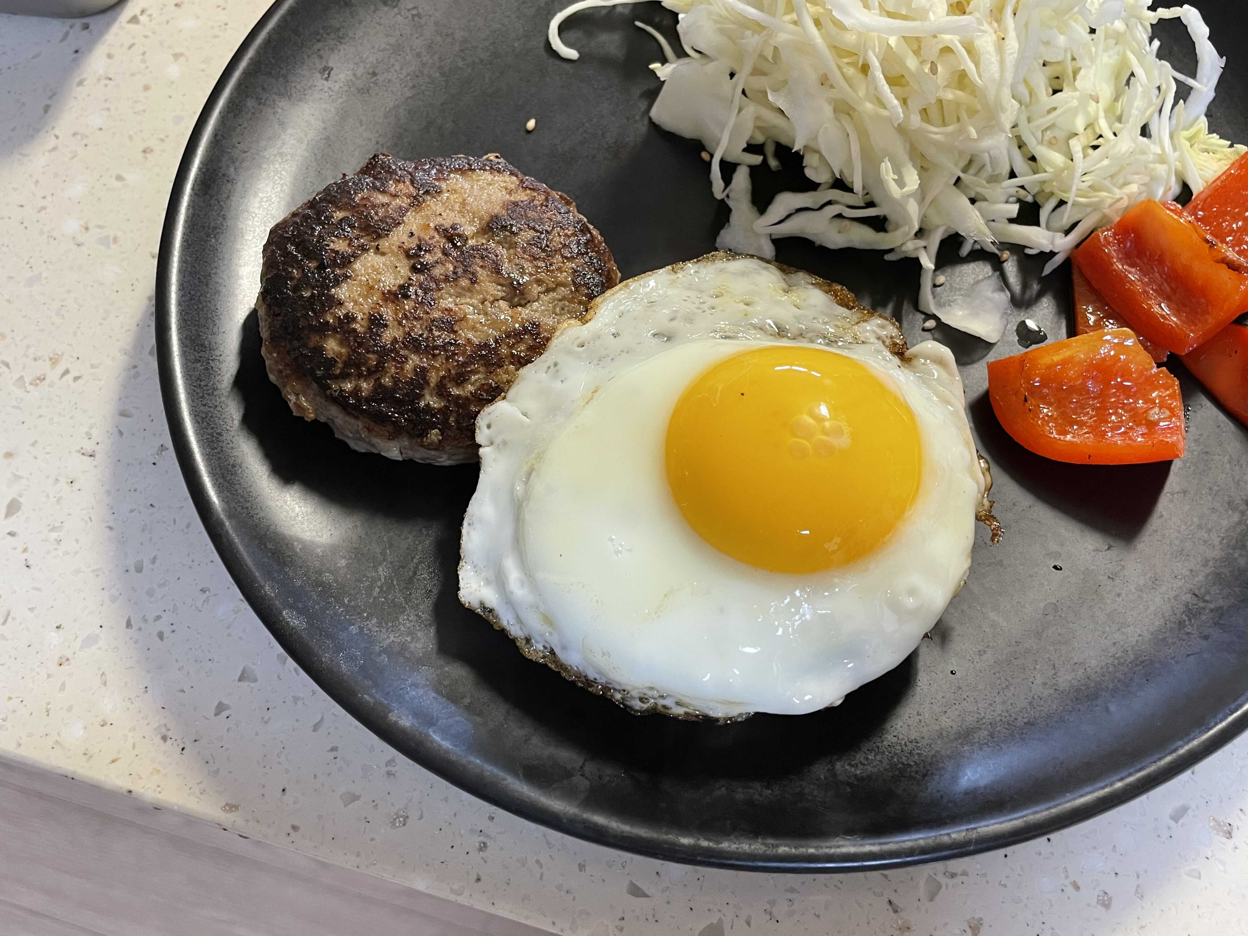 7. 팬 한켠에 계란후라이를 구워 함박스테이크 위에 올리고, 소스를 뿌려먹으면 된다.