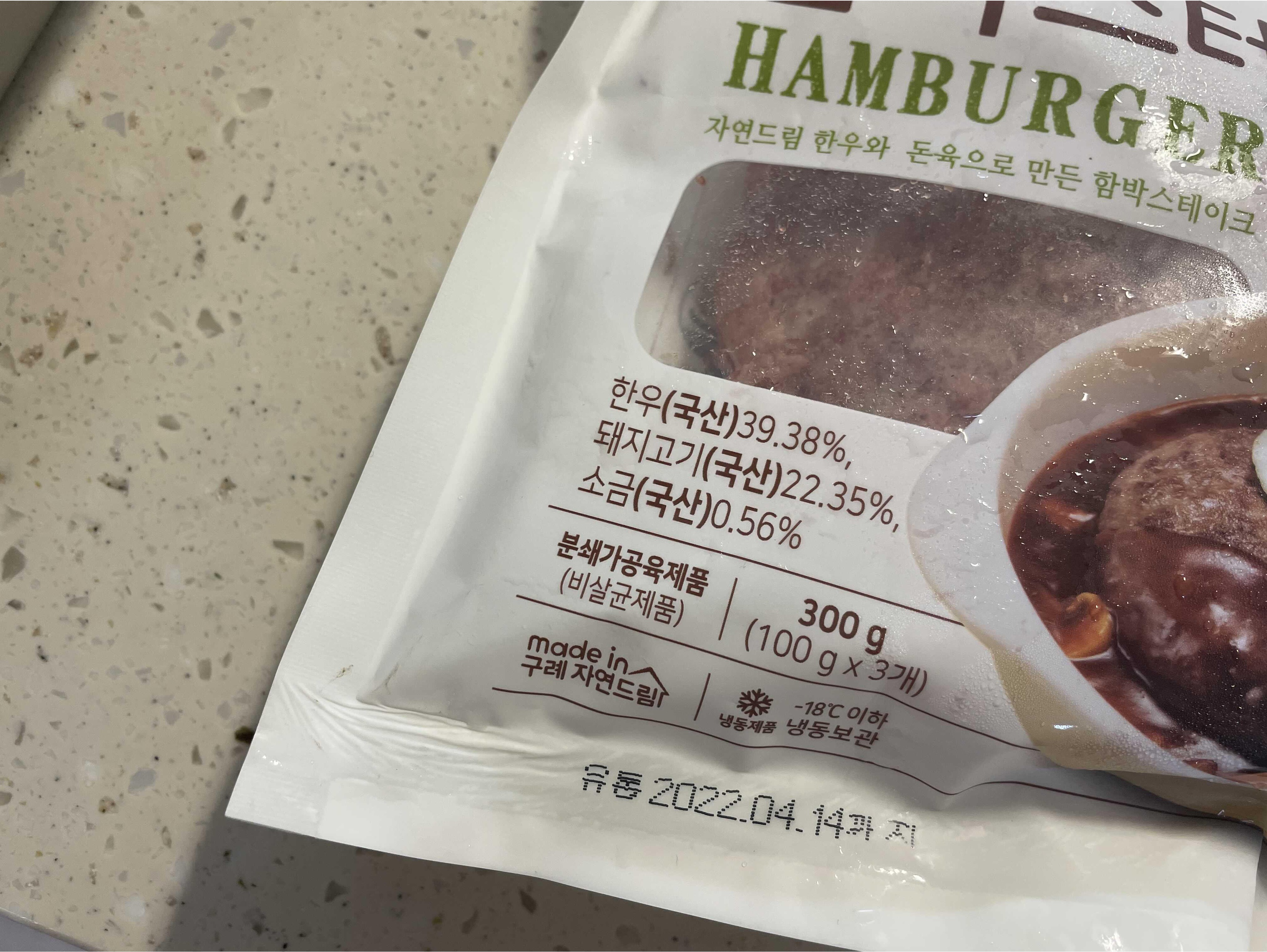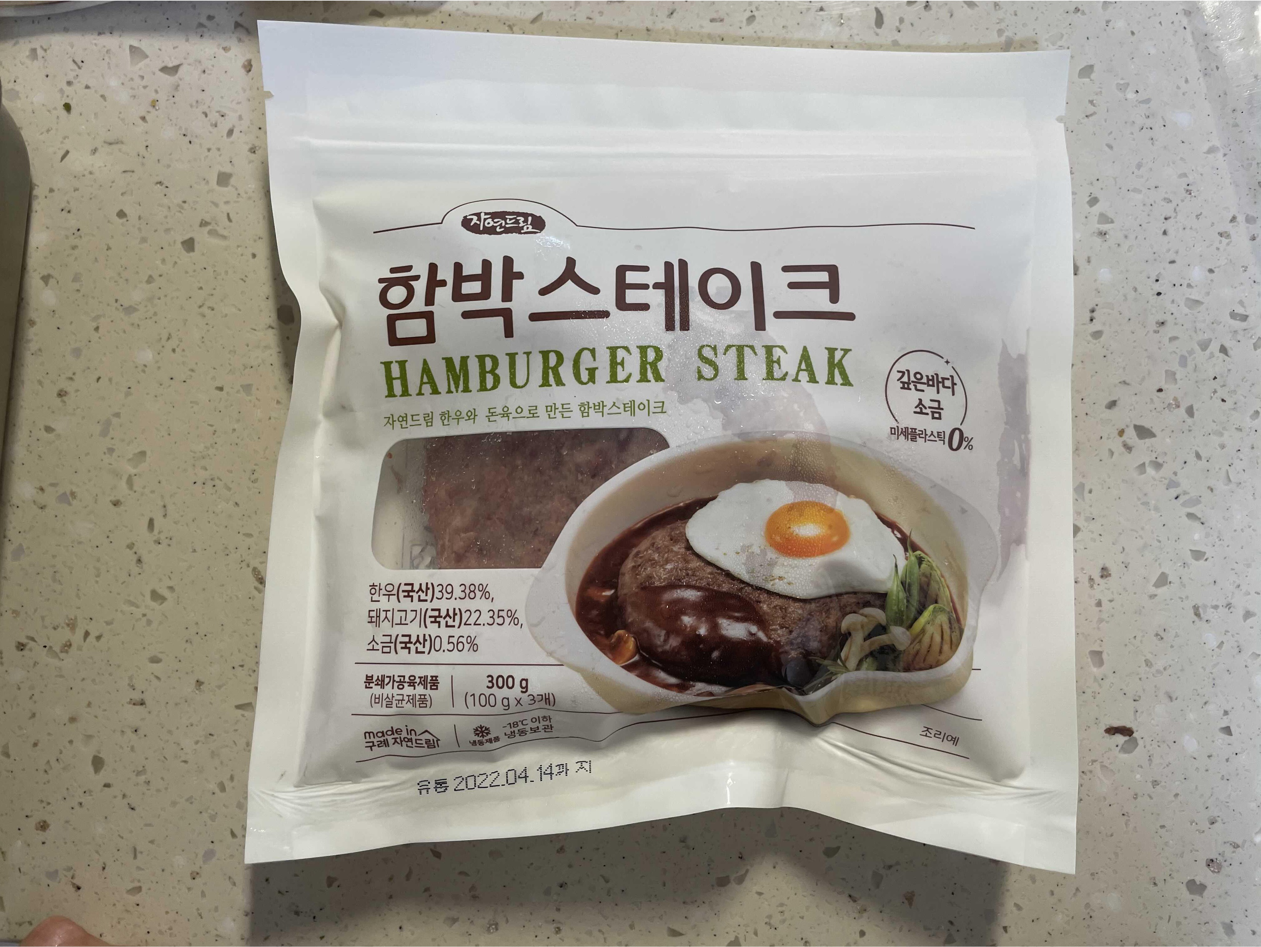 자연드림에서 판매하는 한우와 돈육으로 만든 함박스테이크다. 요즘 자연드림에서 강조하고 있는 미세플라스틱 0%의 깊은 바다소금을 사용한 제품이다. 한우와 돼지고기 비율이 1:2로 들어 있다.