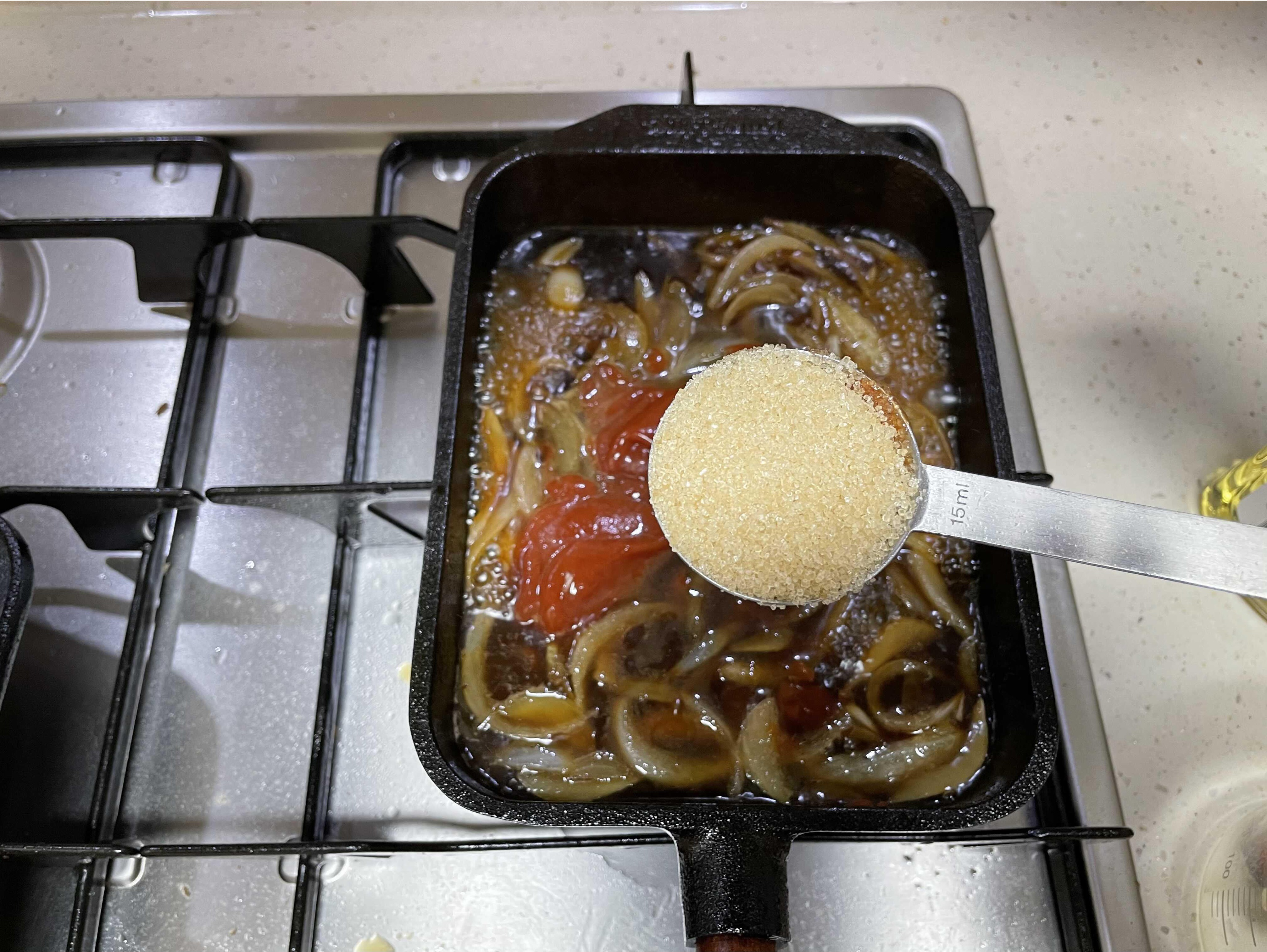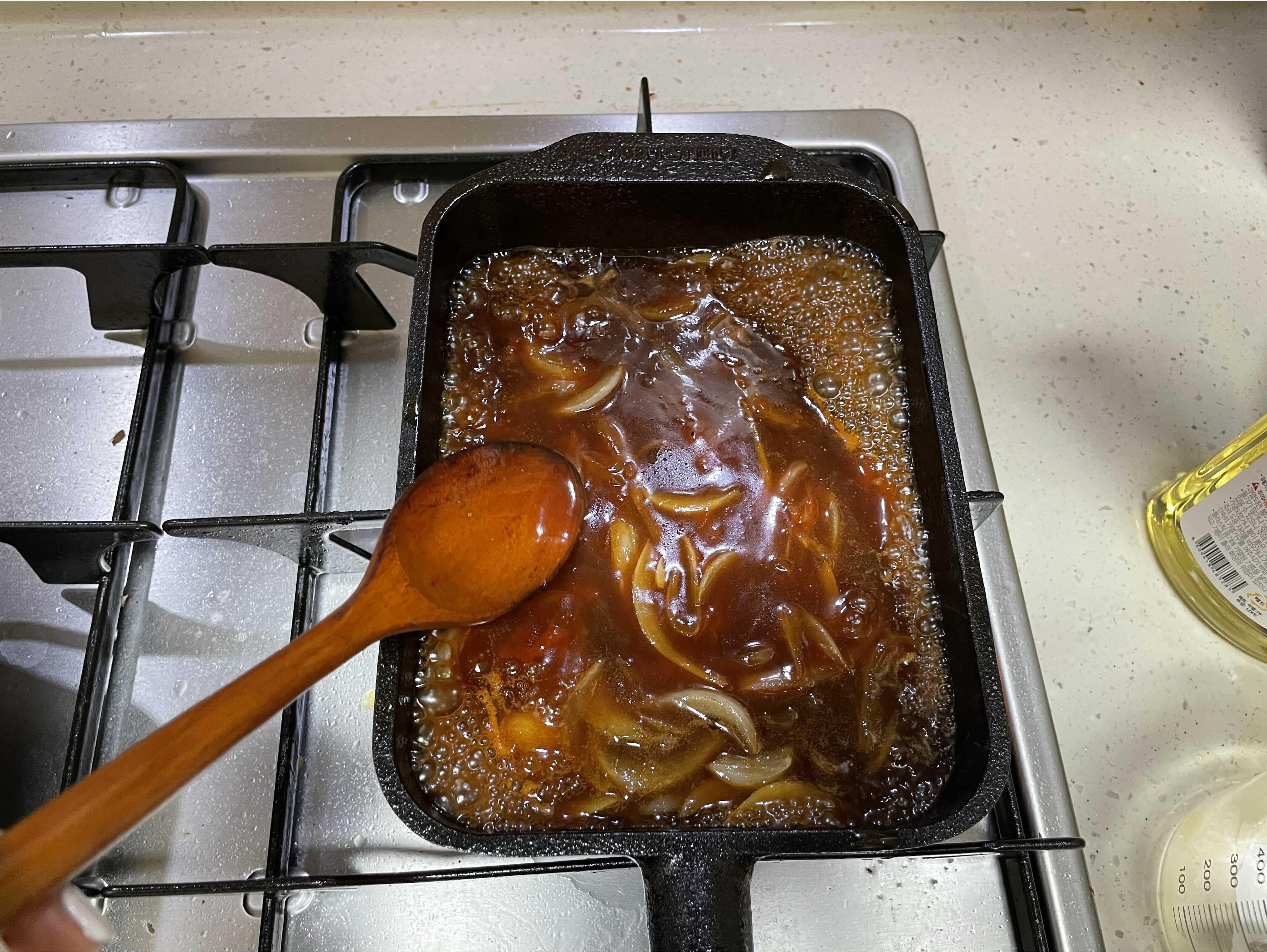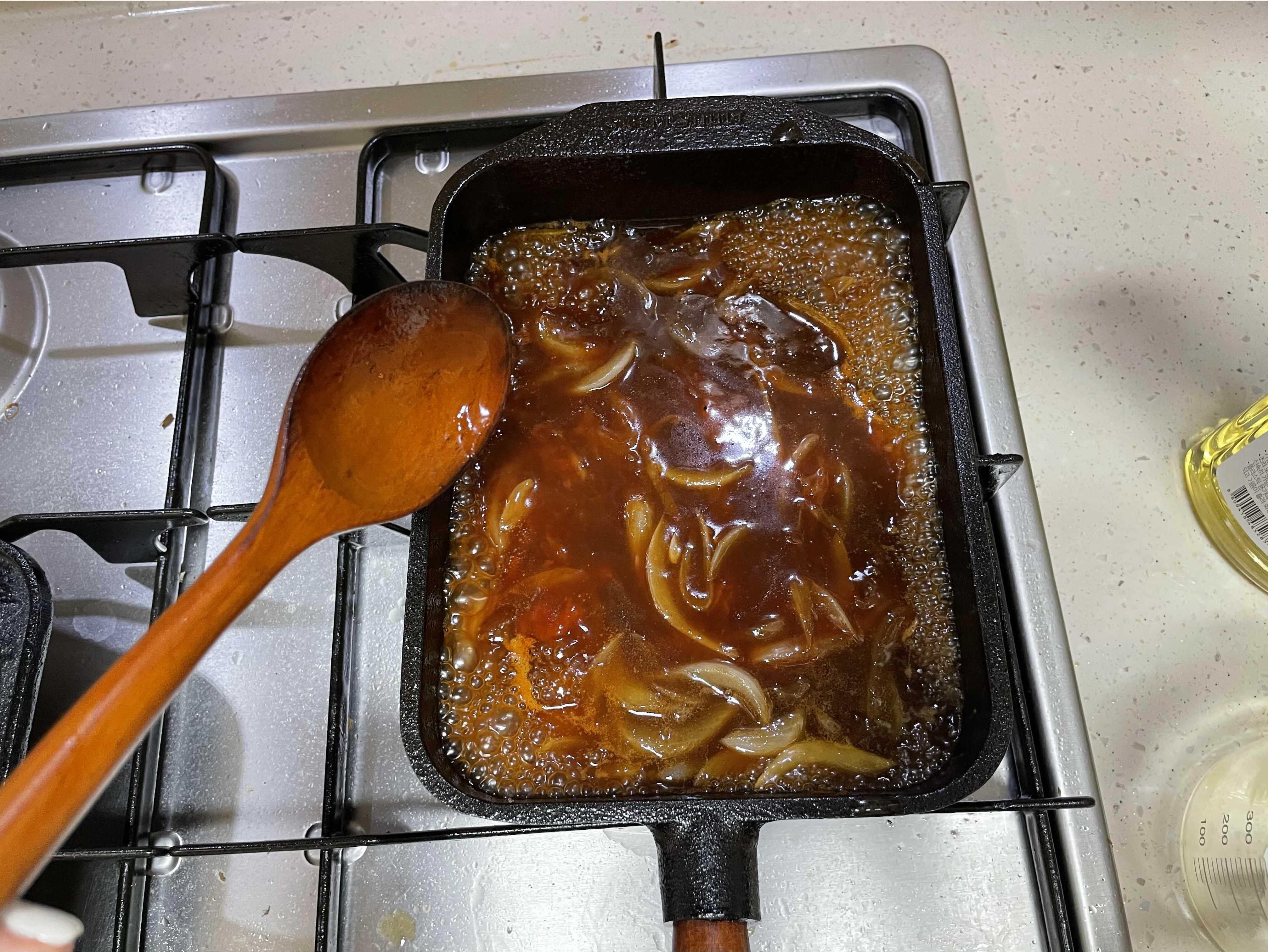 2. 간장, 물, 맛술, 케찹, 설탕을 넣고 중불에 끓인다.