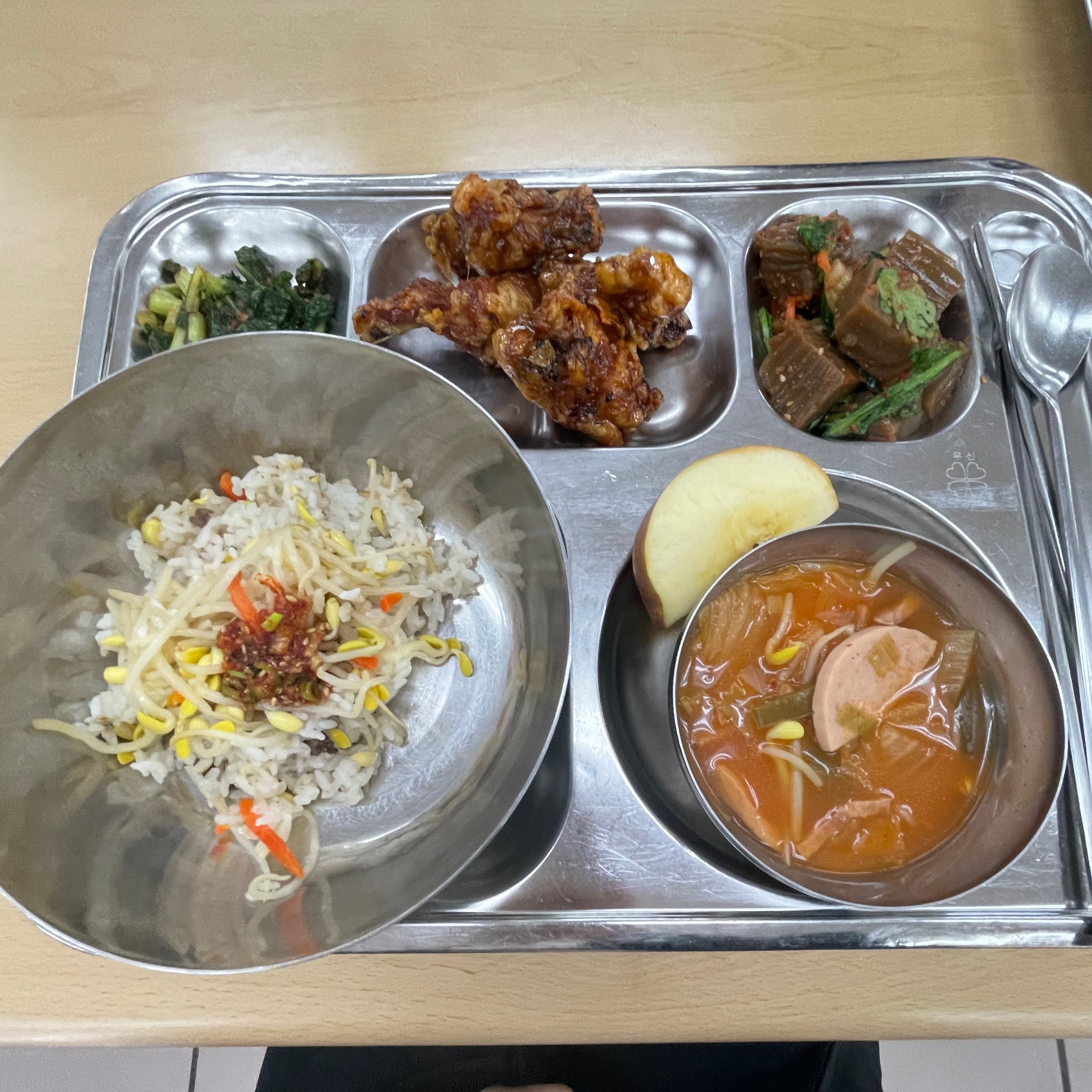 12:00 급식(콩나물밥 1/2, 부대찌개건더기만 1/2, 간장치킨 3조각, 도토리묵무침, 나물무침, 사과 1/6개)