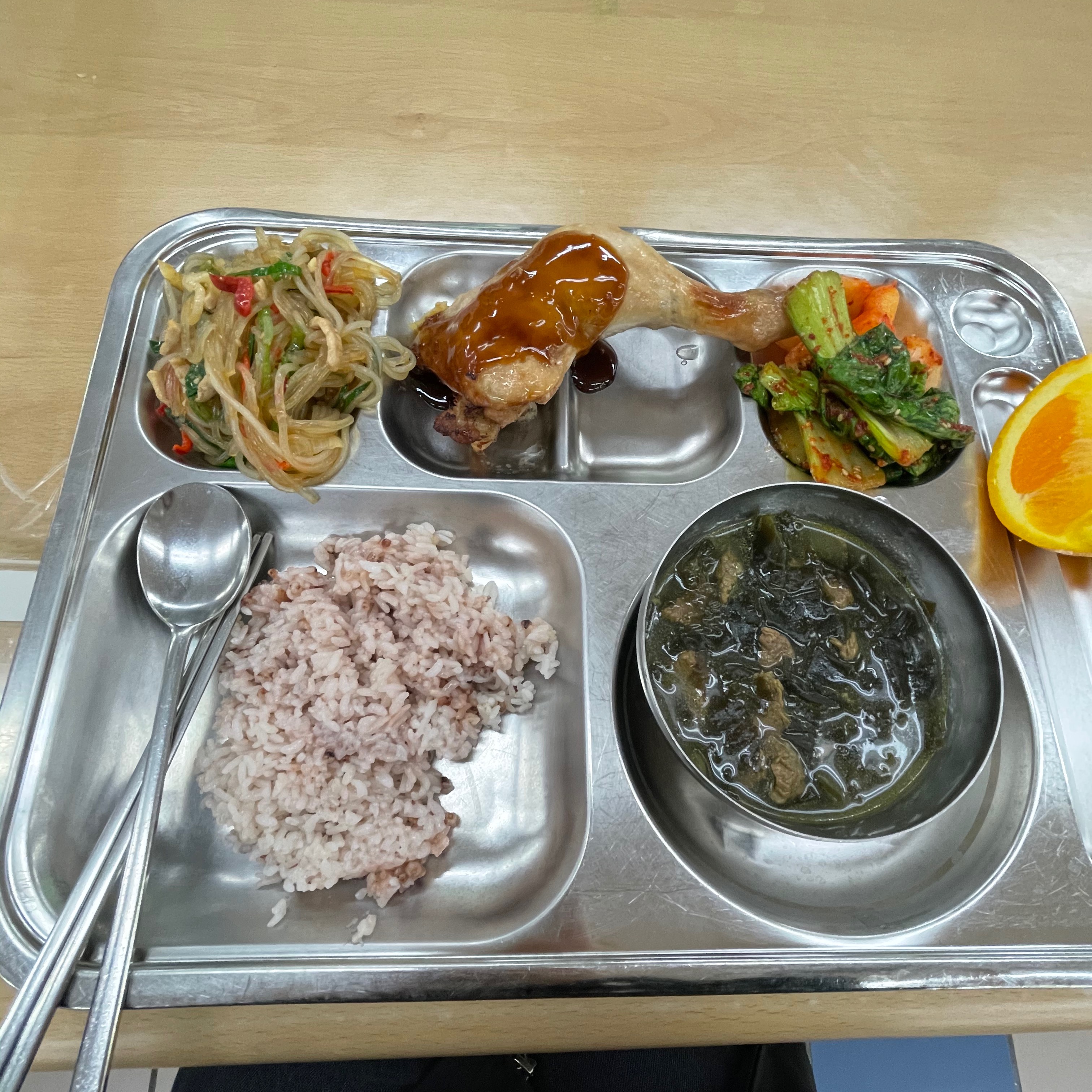 12:00 급식(잡곡밥1/2, 잡채, 데리야끼소스 닭다리 1개, 청경채겉절이, 깍두기, 미역국, 오렌지 1/4조각)
