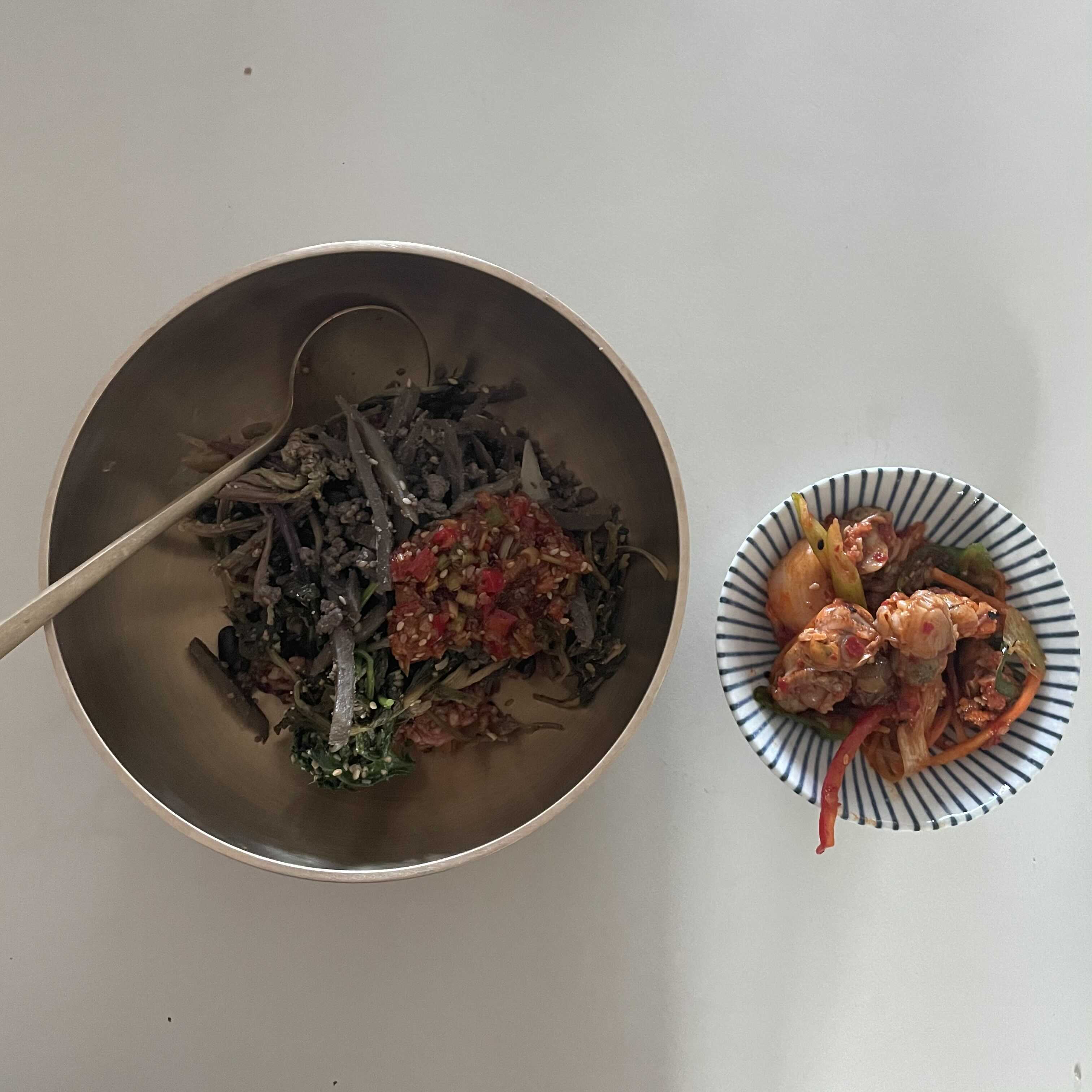 18:05 6가지나물비빔밥+계란후라이+양념장, 가리비무침, 생김