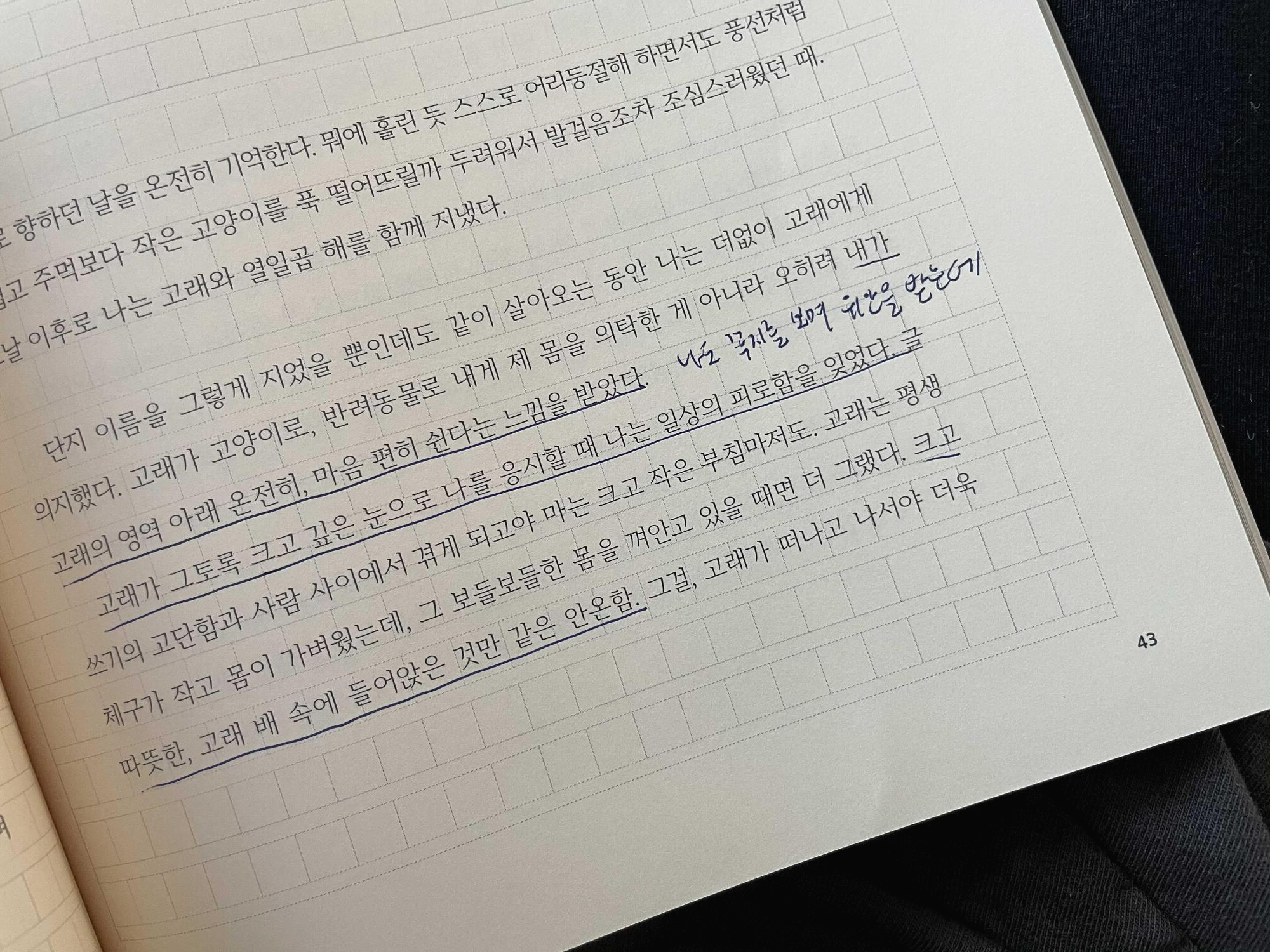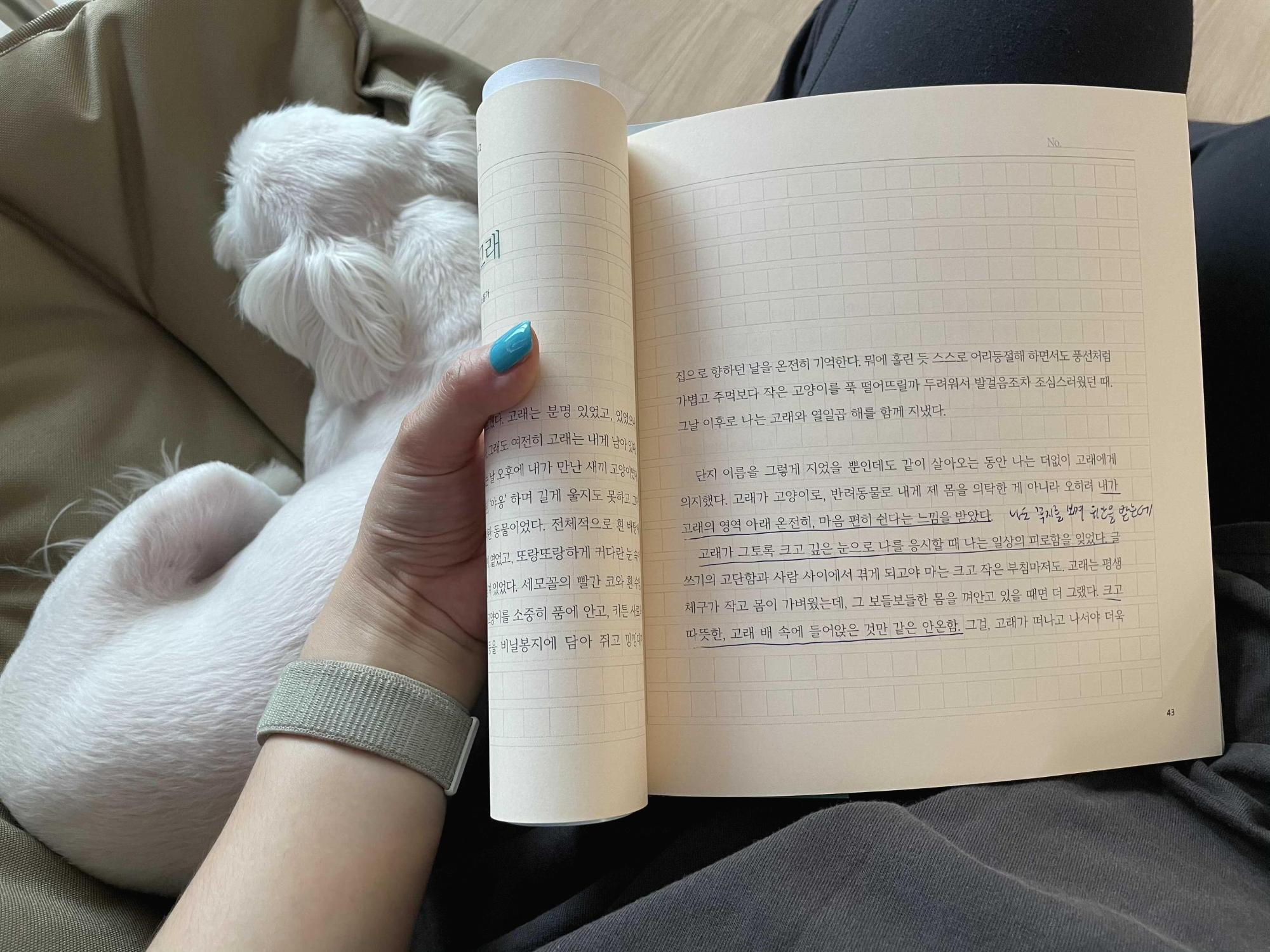나도 "꼭지(강아지)"라는 반려동물을 키우고 있어서인지 이 문구는 정말 와닿았다. 반려동물이란 존재는 반려인이 더 위로받는 다는 사실, 반려동물과 눈마주치고 살을 맞대고 있으면 정말 그 따뜻함한 몸과 눈빛이 나를 위로 해주고 사랑을 표현해준다는 걸 작가님과 나는 같은 마음으로 느끼고 있었다.