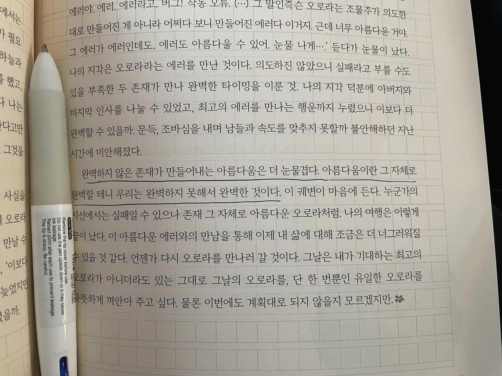 완벽하지 못해서 완벽한 것이다.. 딱 이문구가 정말 읽으면서 위로가 된 문구였다. 완벽하지 않은 우리들의 존재들도 아름답다고 표현을 하고, 그것 또한 부족함이 아닌 완벽에 가까운 것이라, 정말 힘이되는 문구였다.