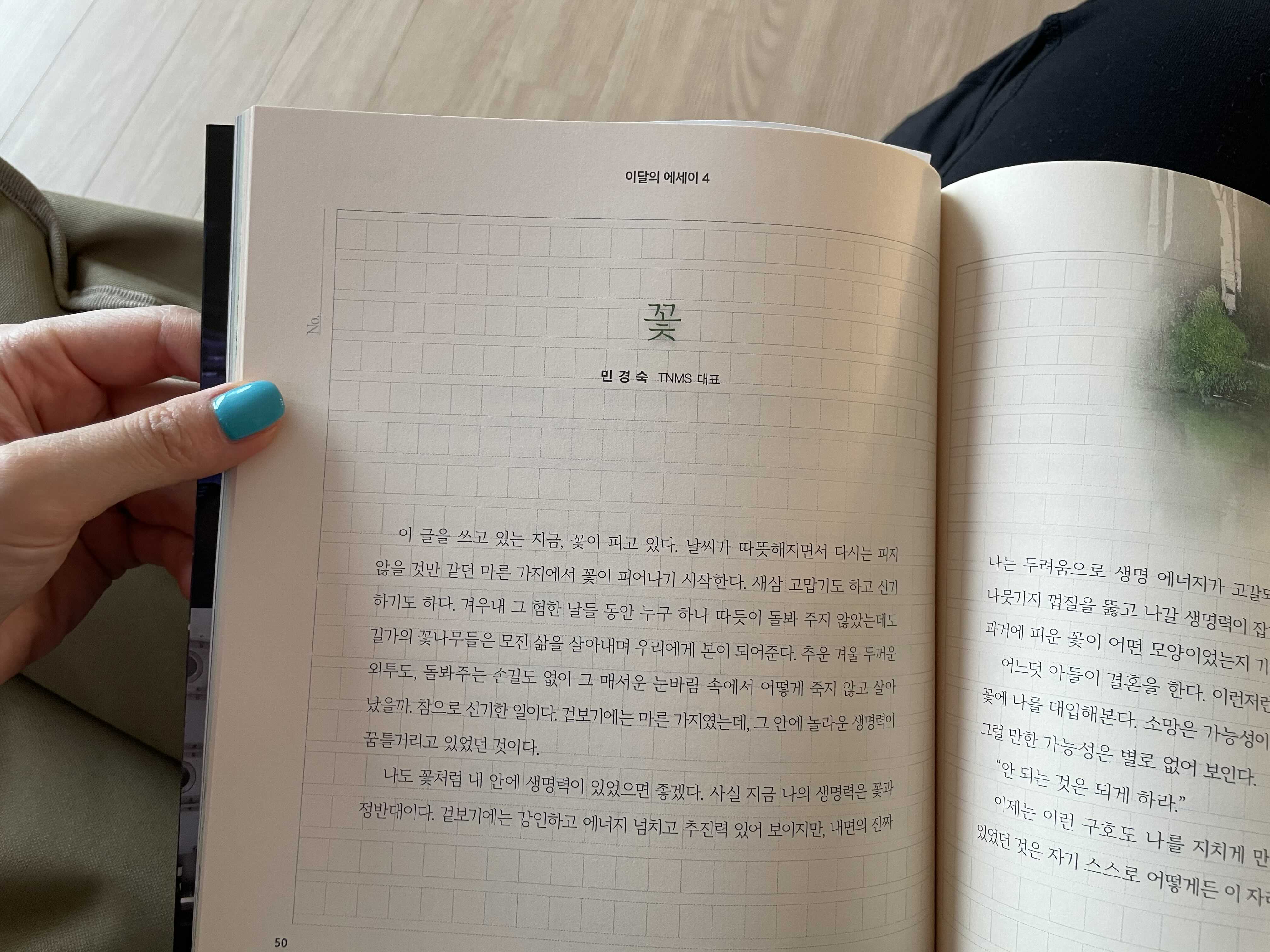 곳곳에 주옥같은 감동글 이 있어서 볼펜하나 들고와서 기억하고 싶은 문구들을 줄을 그으면서 푹빠져서 읽었다. 한 회사의 대표님이 쓰신 "꽃"이라는 에세이 중 좋은 문구를 소개하고 싶다.