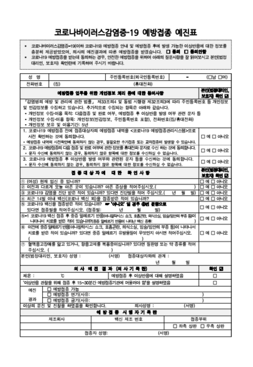 백신 접종시 준비물 중 신분증은 꼭 필수이다. 예진표의 경우 위의 링크에서 다운받아 작성해가면 좋다. 없을 경우 현장에서 작성도 가능하다.