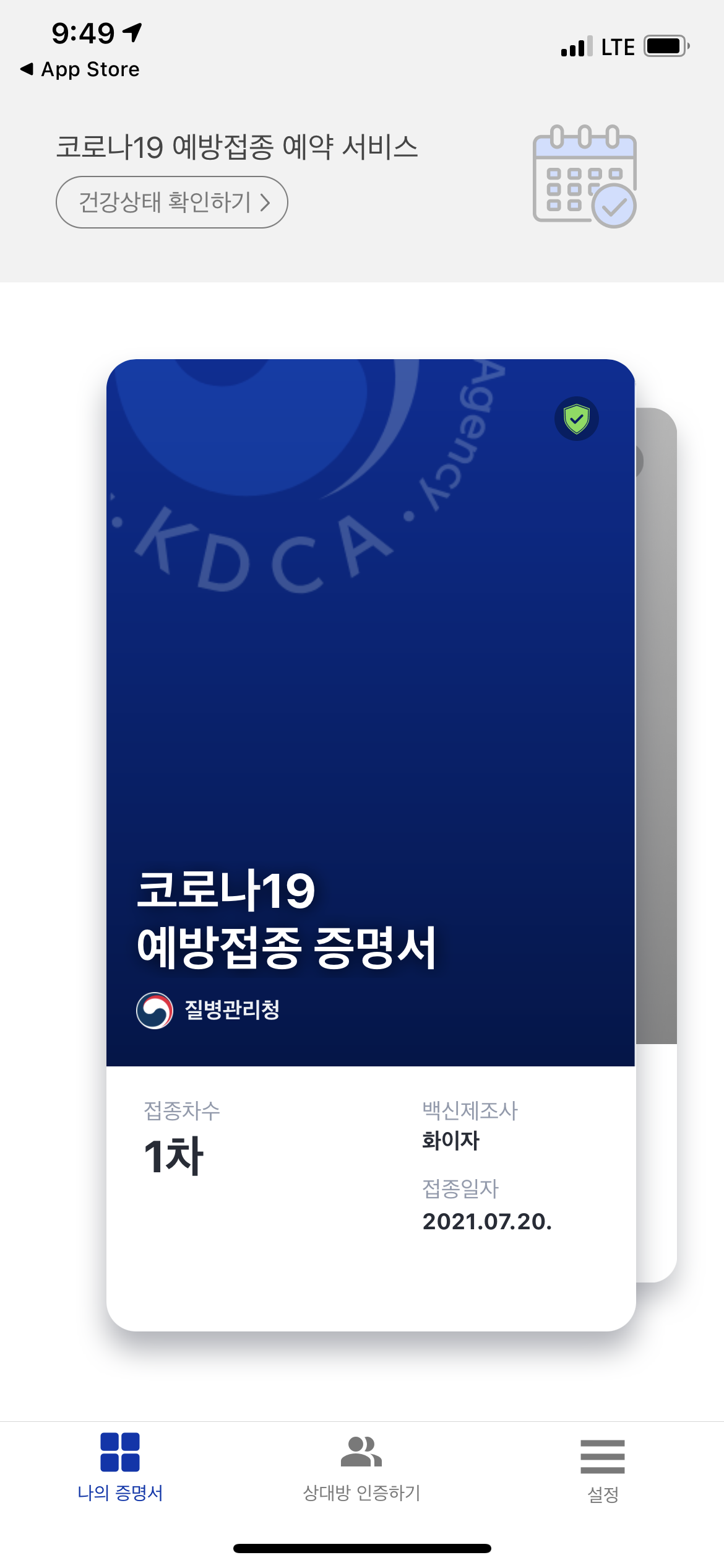 접종 후 접종장소에서 증명서 발급도 가능하지만, 모바일 어플로도 바로 발급가능하다.