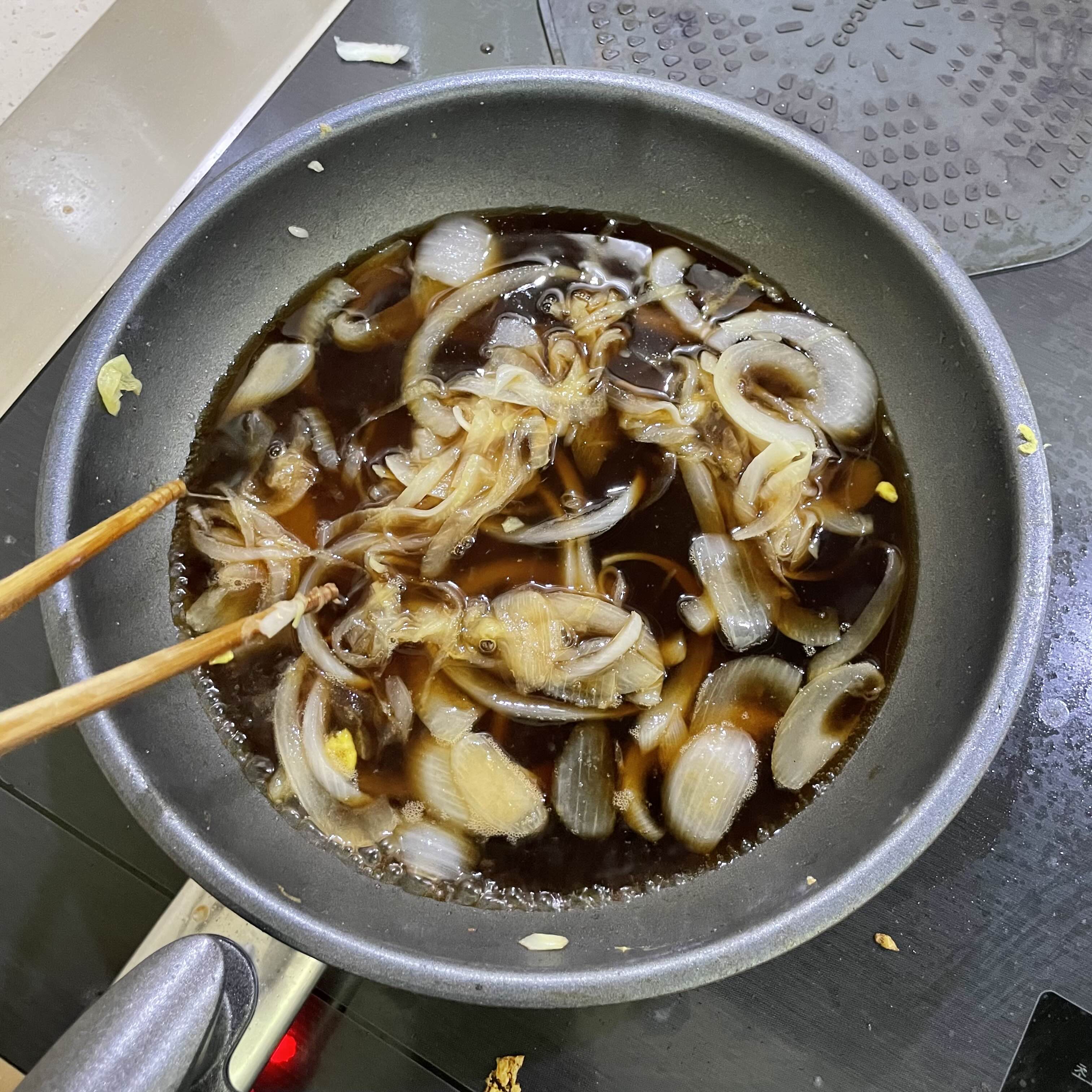 6. 양파가 익으면 소스를 넣고 졸여줍니다.