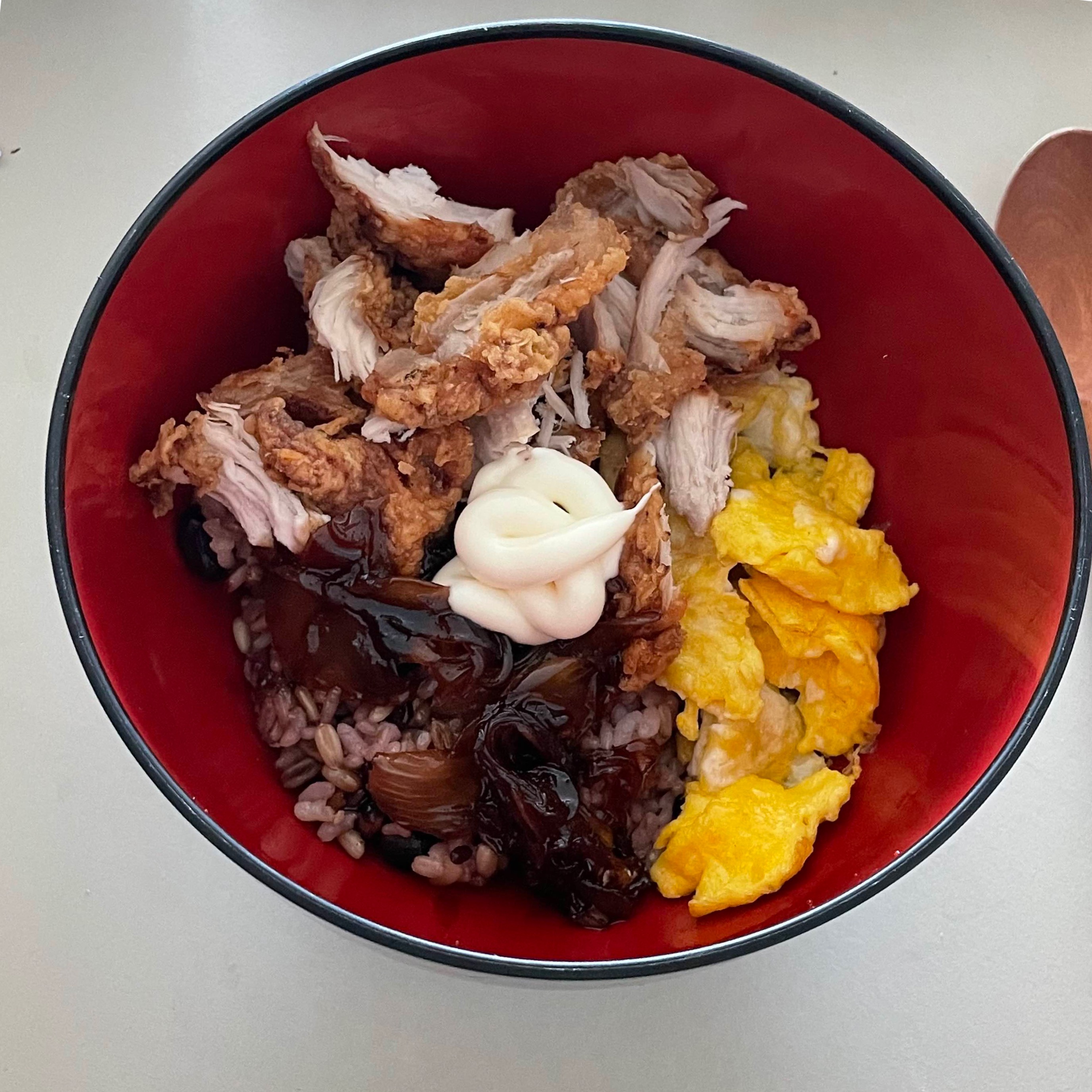 7. 밥위에 달걀, 치킨, 데리야끼소스, 마요네즈를