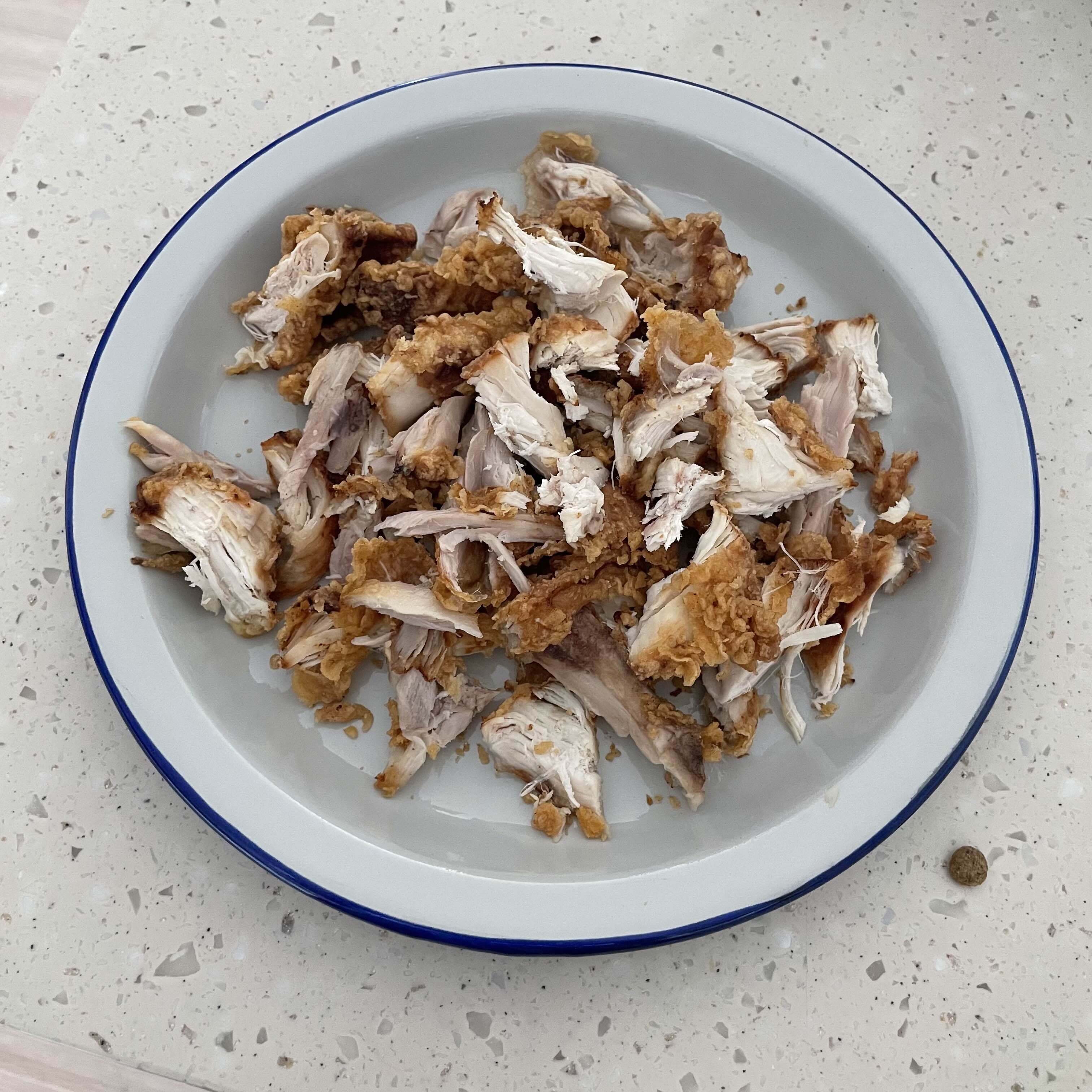 1. 남은 치킨은 뼈를 발라내고 잘게 찢어줍니다.