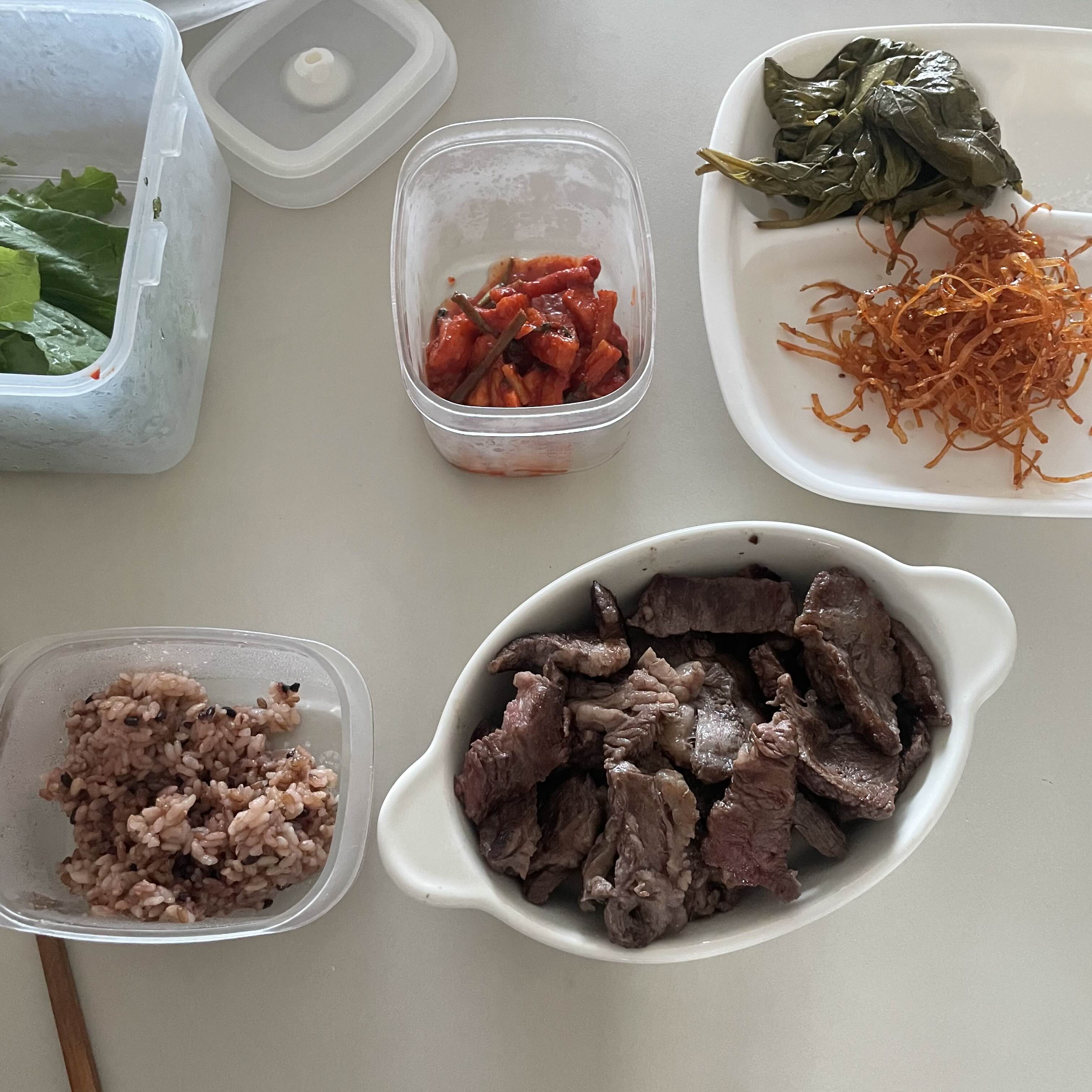 17:50 현미밥, 등심구이, 김치, 깻잎짱아찌, 진미채