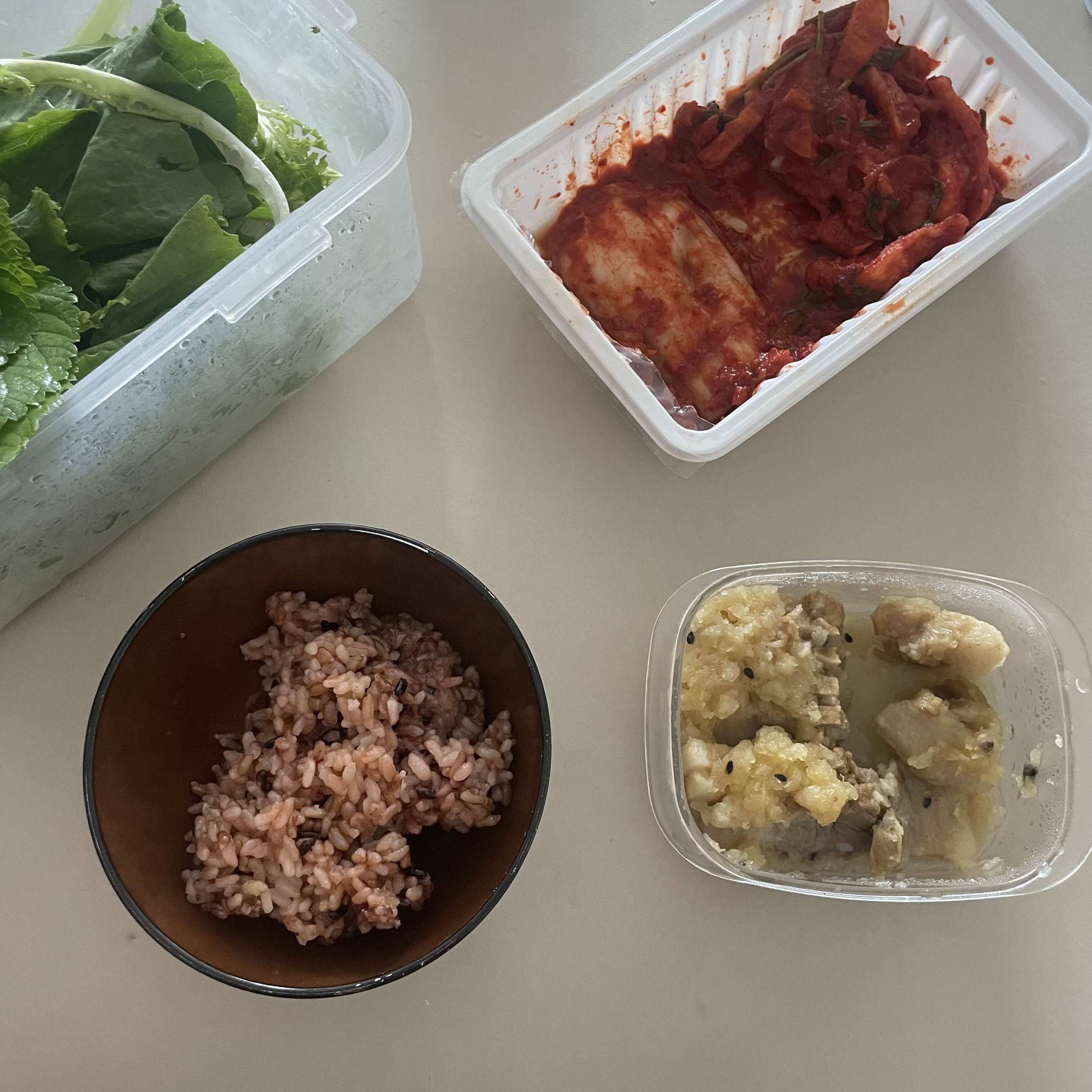 12:00 현미밥, 마늘보쌈, 쌈채소, 김치