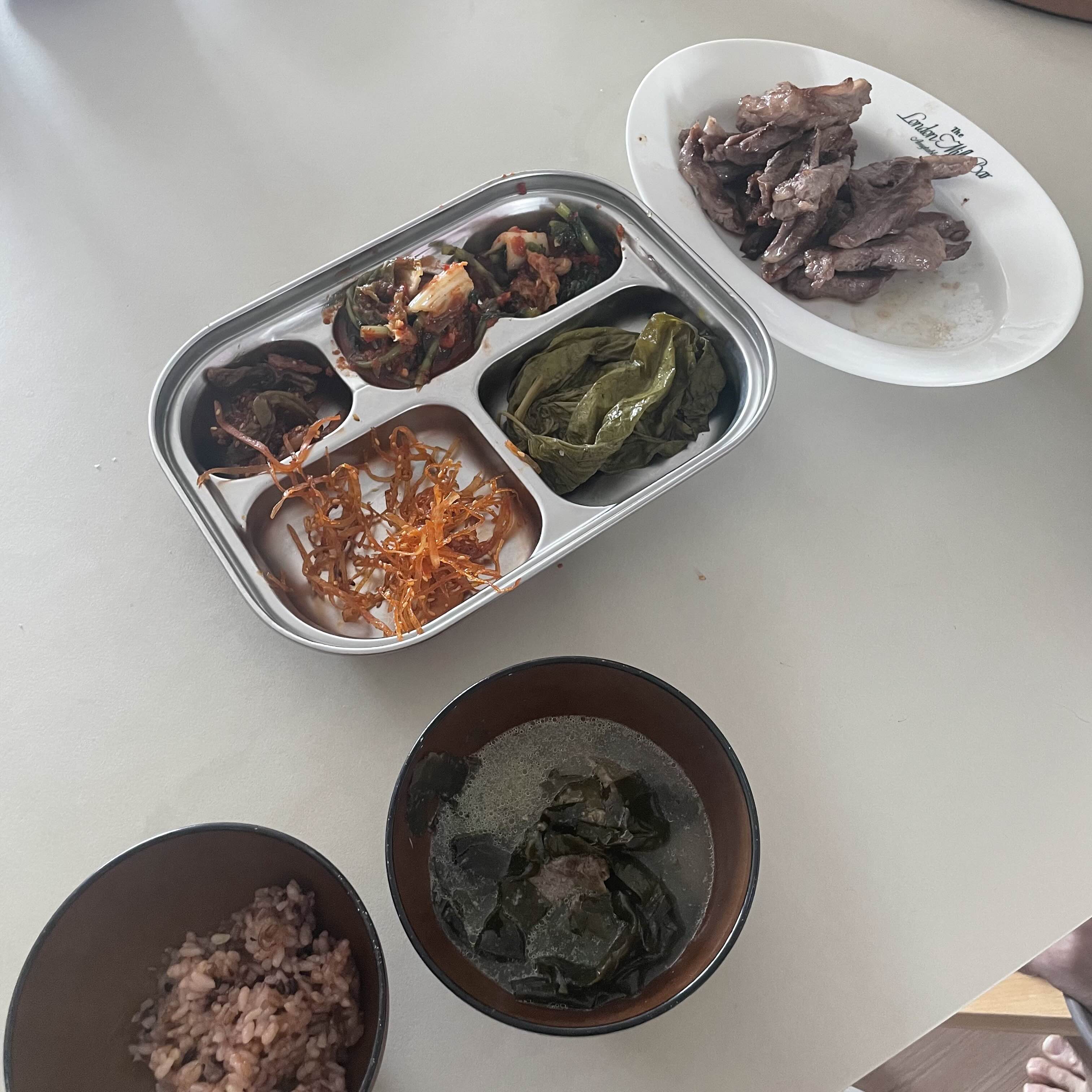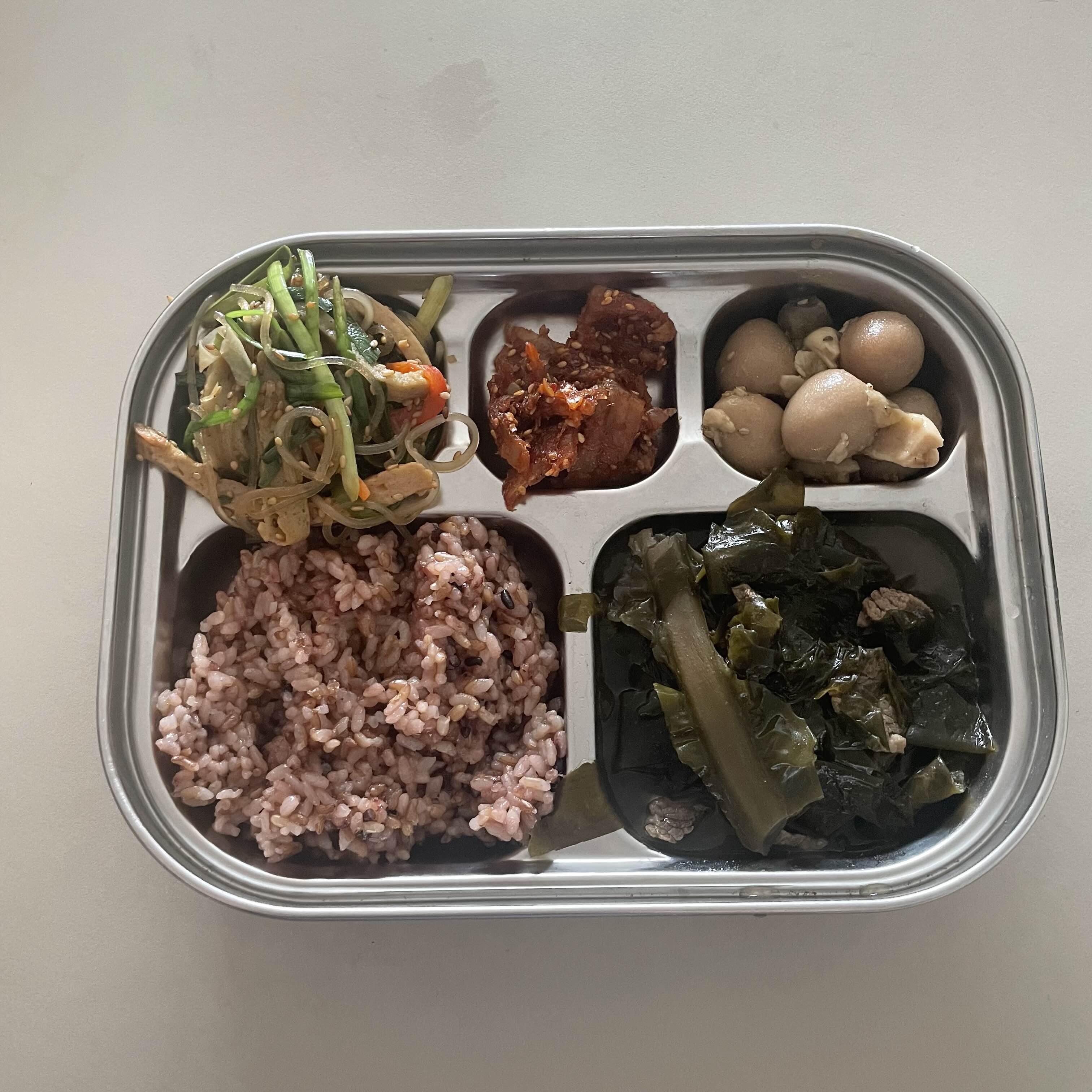 13:20 잡곡밥, 미역국, 잡채, 메추리알, 쥐포