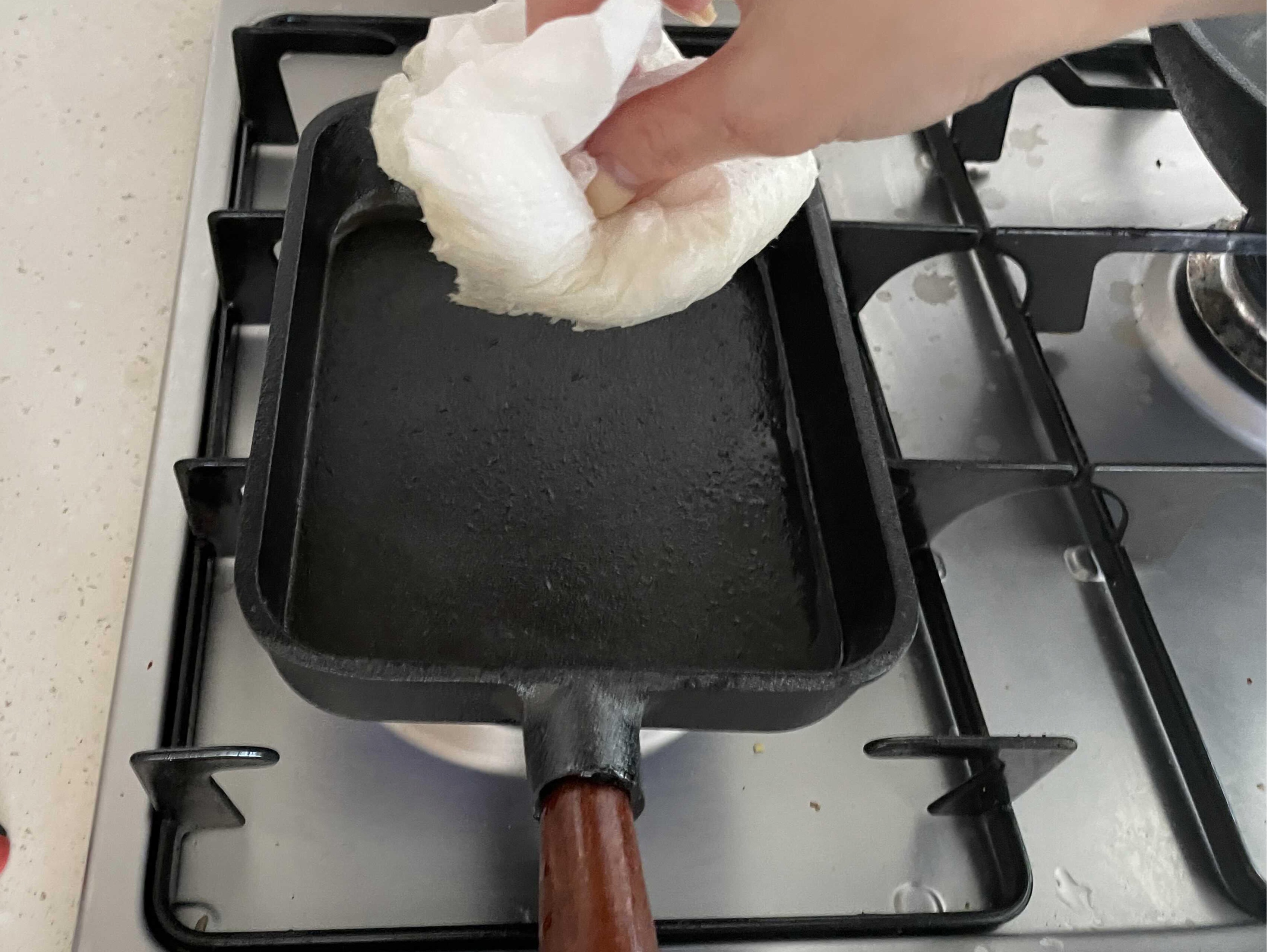 2. 가스레인지 강불에 두고, 물기를 날려 준 후 팬에서 약간의 연기가 올라오면 불을 끄고 기름을 부터 닦아낸다. (5회정도 반복)
