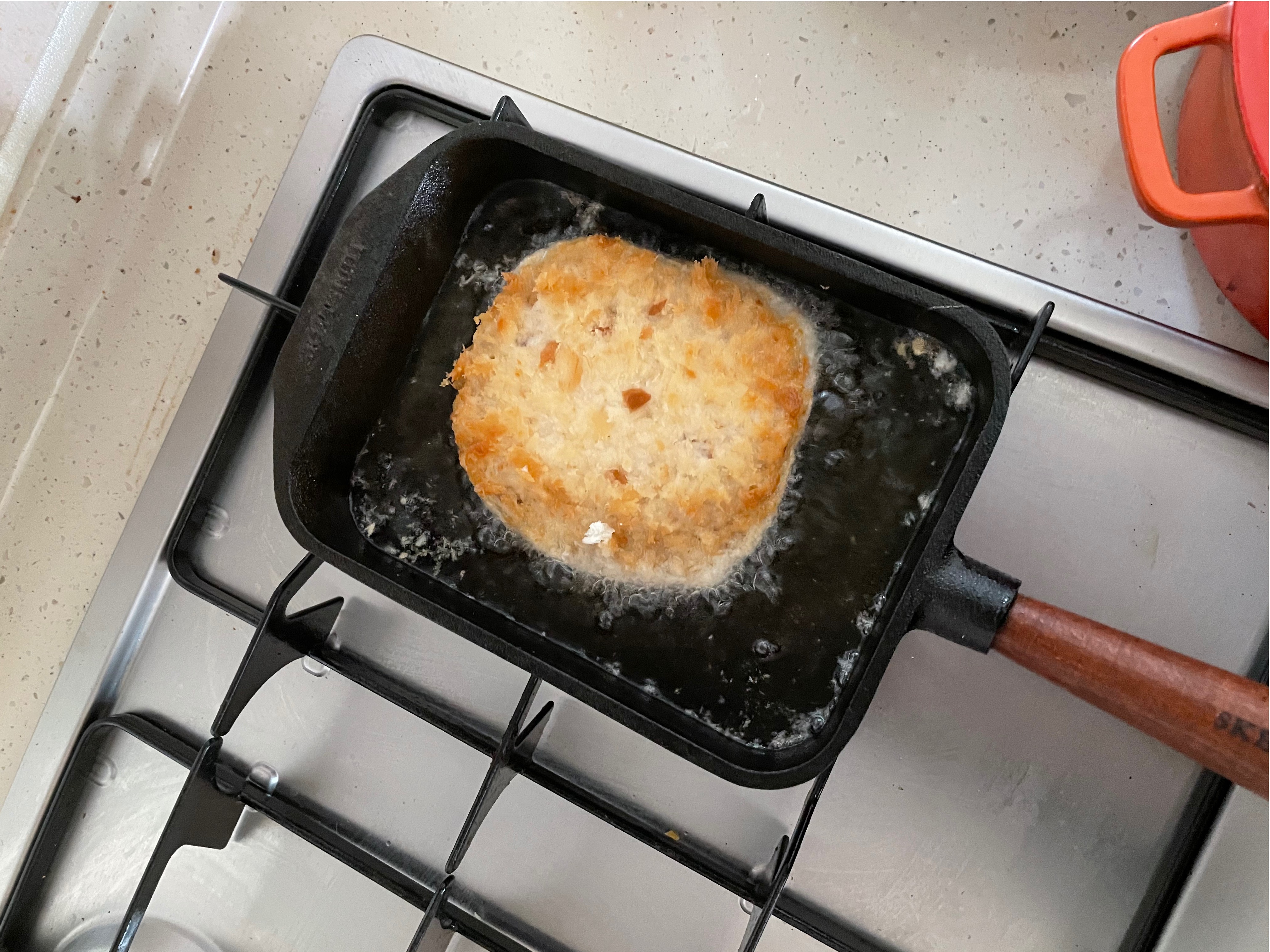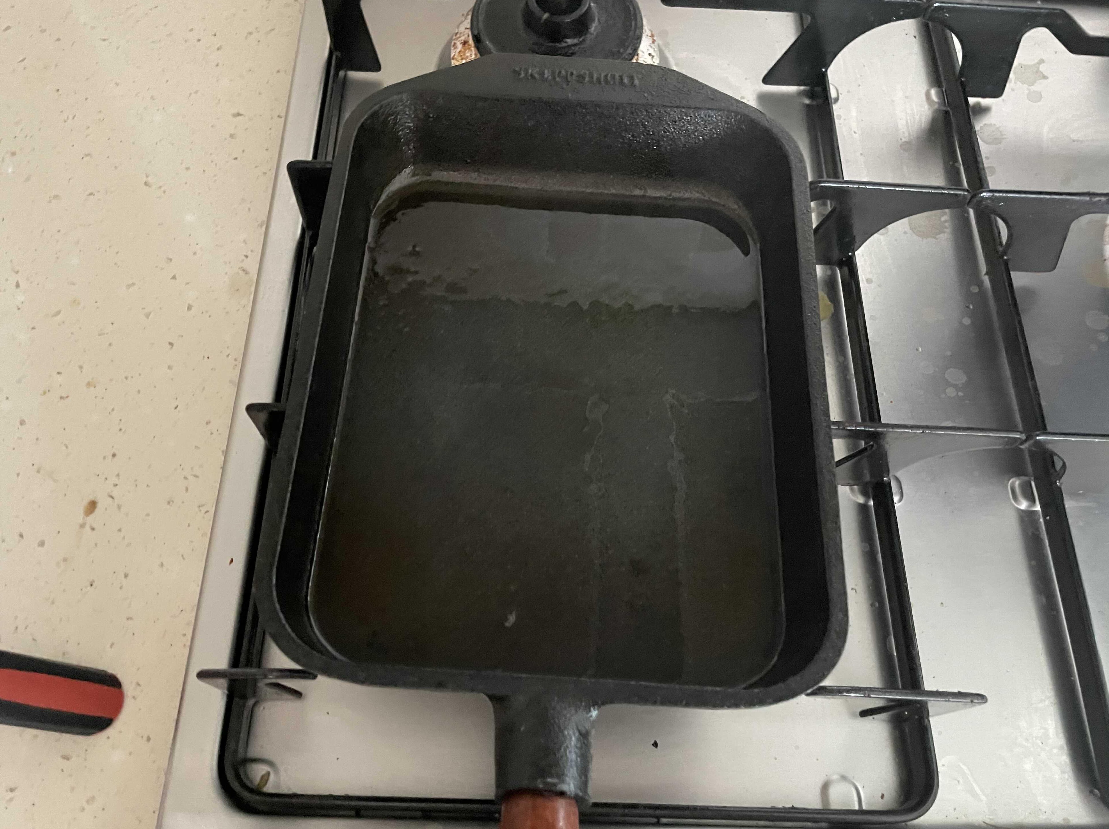4. 만약 들러붙는 다면 팬이 완전히 식을때까지 여유를 가진 후, 식으면 들러붙은 부분을 긁어 내고(코팅되지 않는 무쇠팬의 장점은 딱딱한 걸로 긁어내도 무리가 없다, 코팅된 무쇠팬의 경우 비추!) 2번 과정을 다시 반복한다.