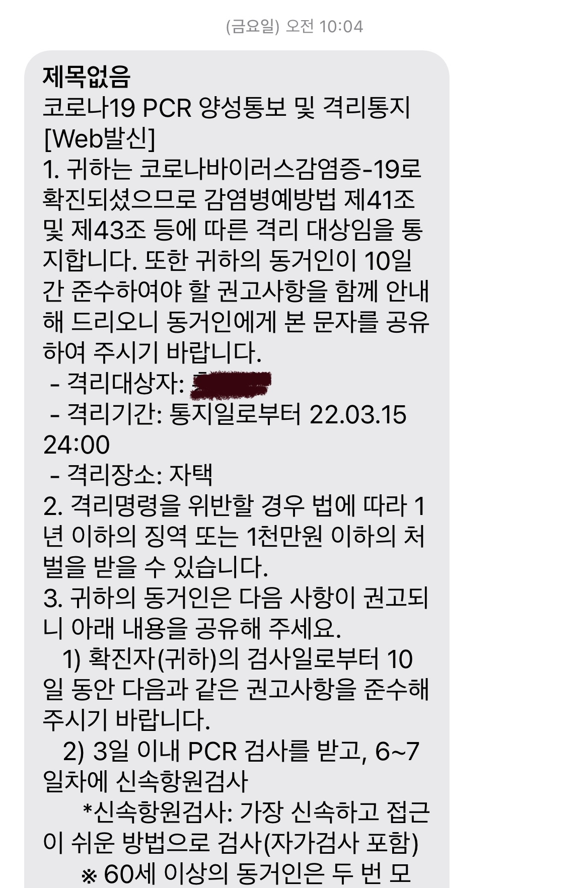 확진자 동거인 가족은 자가격리 대상은 아니지만, 10일간 수동감시자로 전환된다. 난 수동감시대상자로 따로 보건소에서 연락은 안왔지만 남편에게 온 문자에 의하면 3일이내 pcr검사를 받으라고 권고사항이었다.